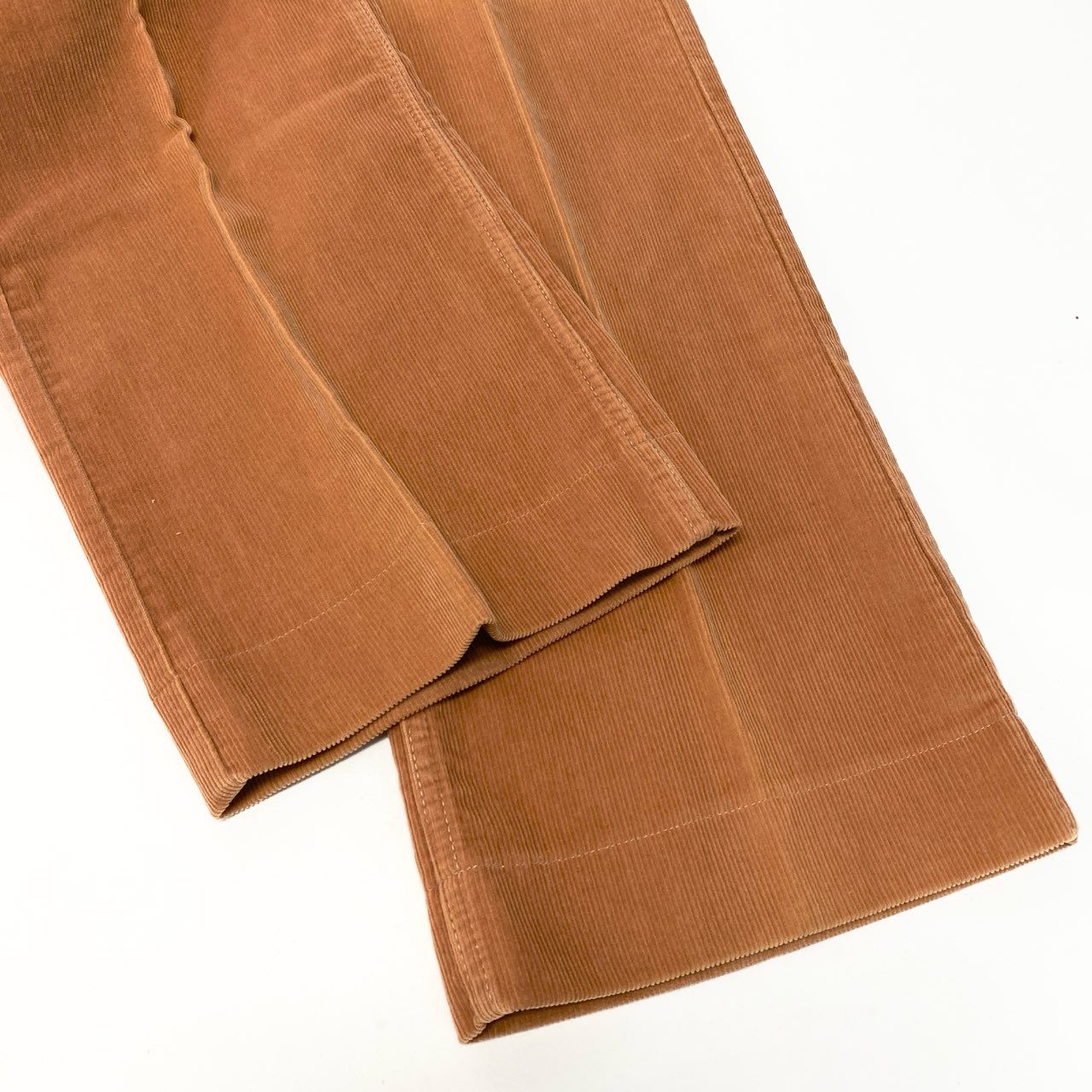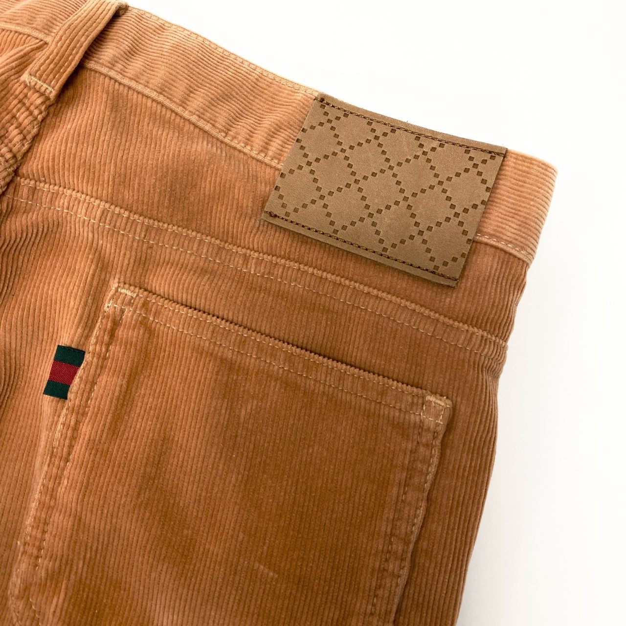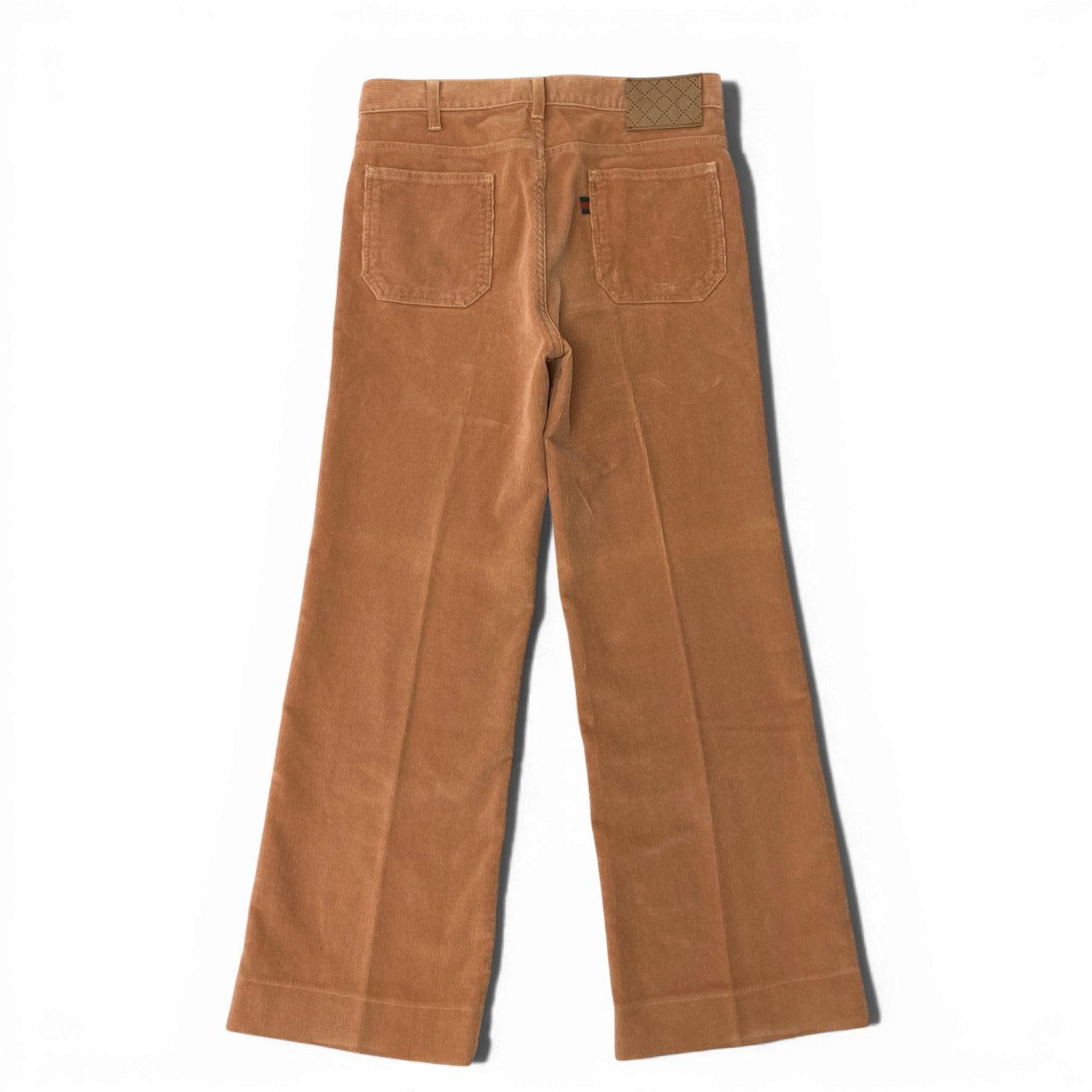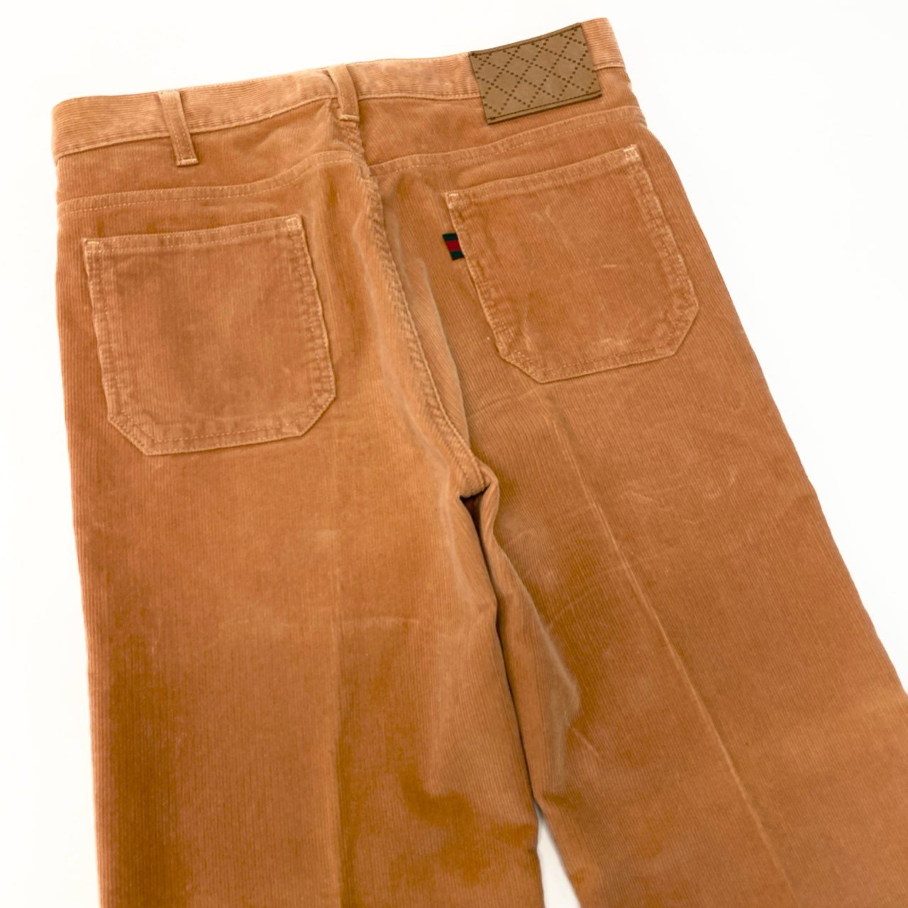 温かみのあるキャメルオレンジ系カラーが印象的なGUCCIのコーデュロイパンツです。毛足のあるコーデュロイ素材で、やや光沢のある上品な質感が特徴です。すっきりとしたストレートシルエットでクラシックな雰囲気を演出します。カジュアルなニットやシャツ、ジャケットスタイルまで幅広いコーディネートに合わせやすい一本です。
