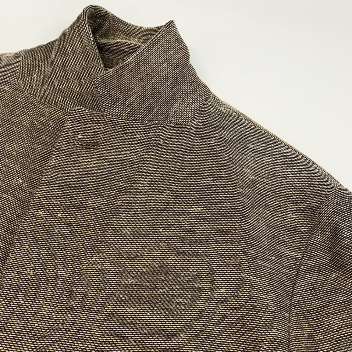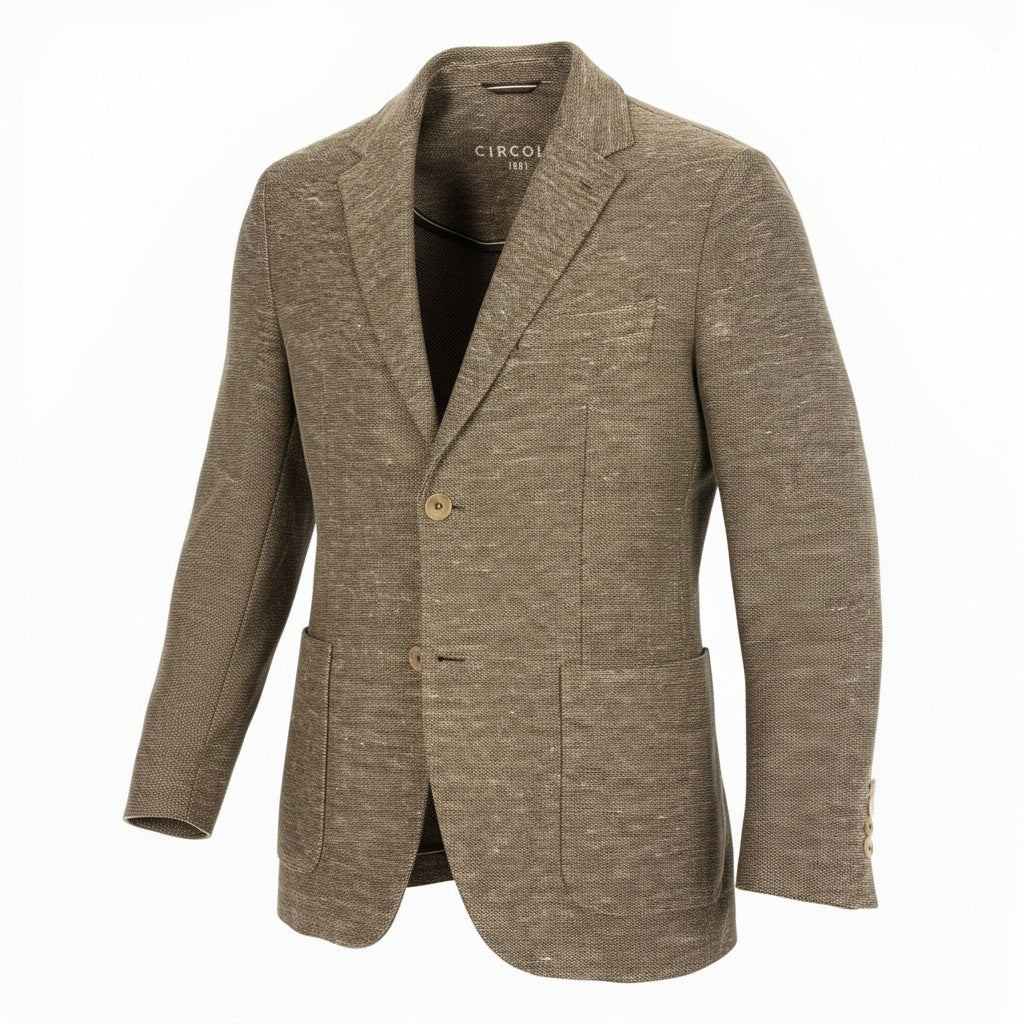 CIRCOLO 1901のメンズ テーラードジャケットです。落ち着いたブラウン系カラーに、表情のあるジャージー生地を使用した軽やかな一着。布帛見えする上品さと、ジャージーならではのストレッチ性と快適な着心地を両立しています。シンプルな2ボタン仕様で、オンオフ兼用・出張や移動の多いシーンにもおすすめです。