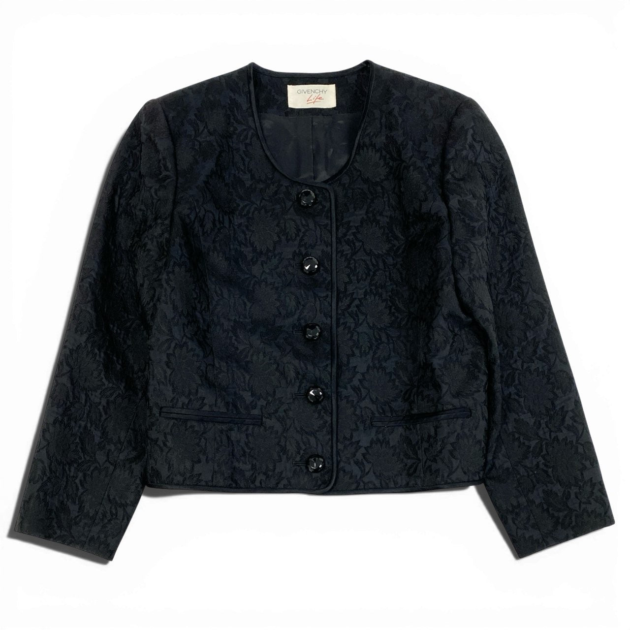 36a30 Vintage Givenchy ヴィンテージ ジバンシー 花柄ジャガード ビジューボタン ジャケット Floral Jacquard Jacket Blazer Bijpi Button M ブラック レディースo07t