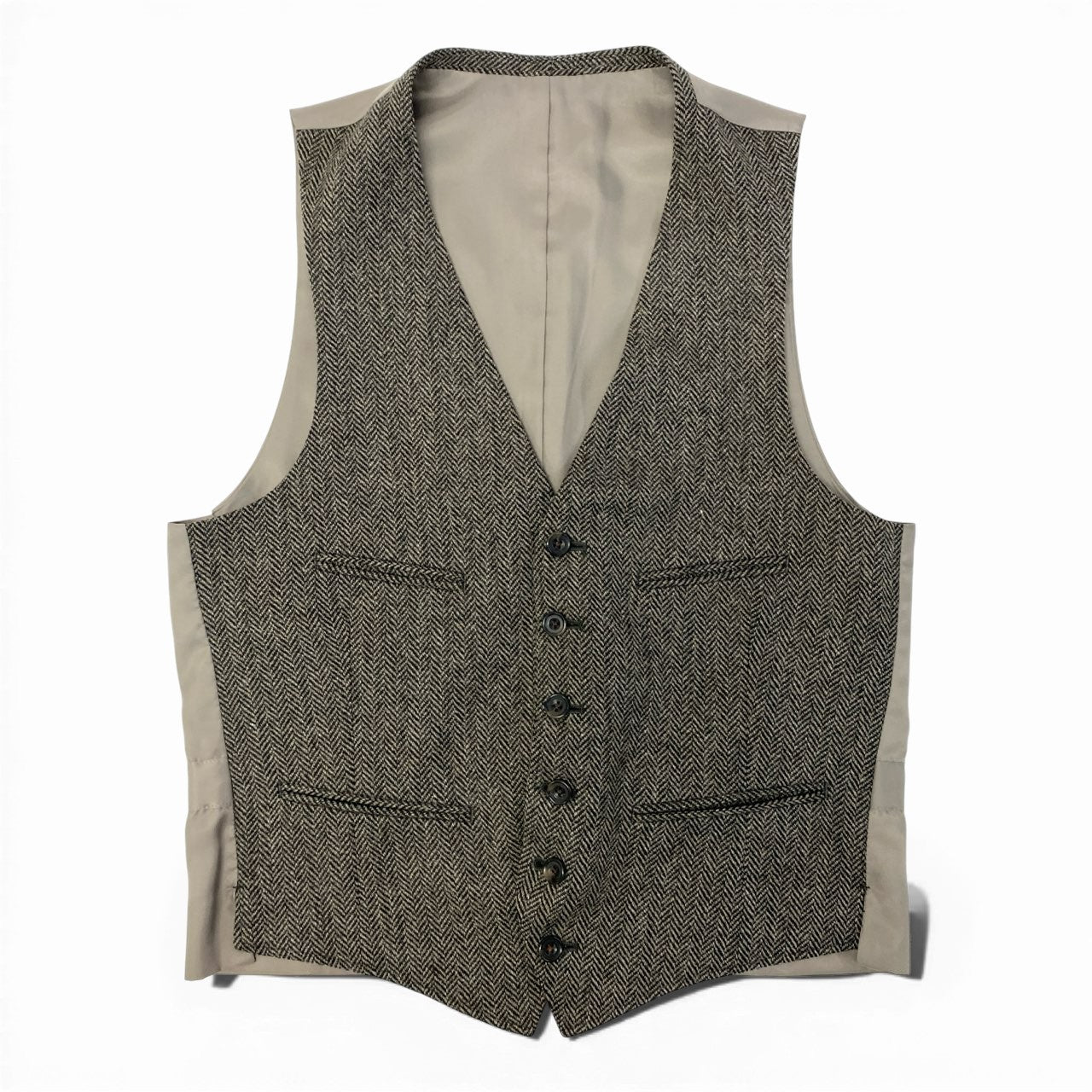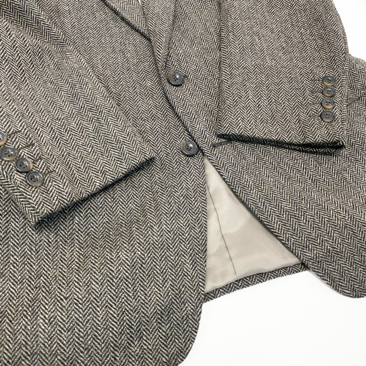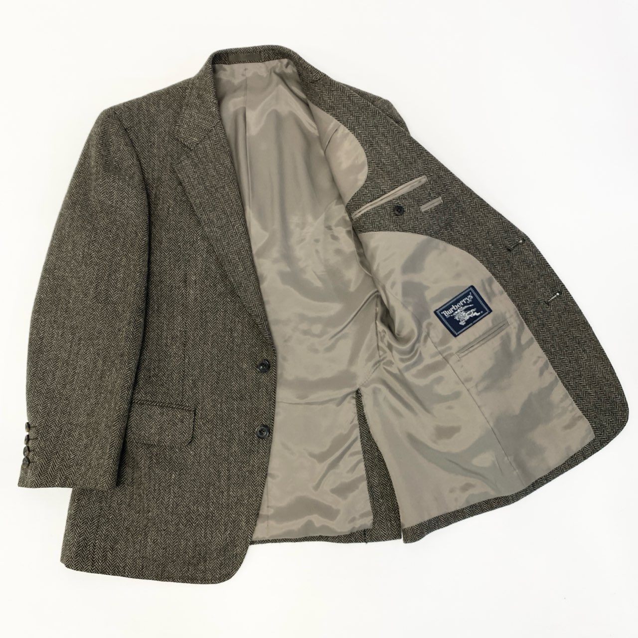 バーバリーのスリーピーススーツで、ブラウン系を基調としたヘリンボーン(herringbone)柄がクラシックな印象を与えます。 ウール調のマットな素材感で、落ち着きと上質さを兼ね備えた仕立てが特徴です。 ジャケット・ベスト・パンツの三点構成により、着こなしの幅が広くシーンに応じた調整が可能です。 ビジネスシーンはもちろん、英国調スタイルを活かしたドレス寄りの装いにもおすすめの一着です。