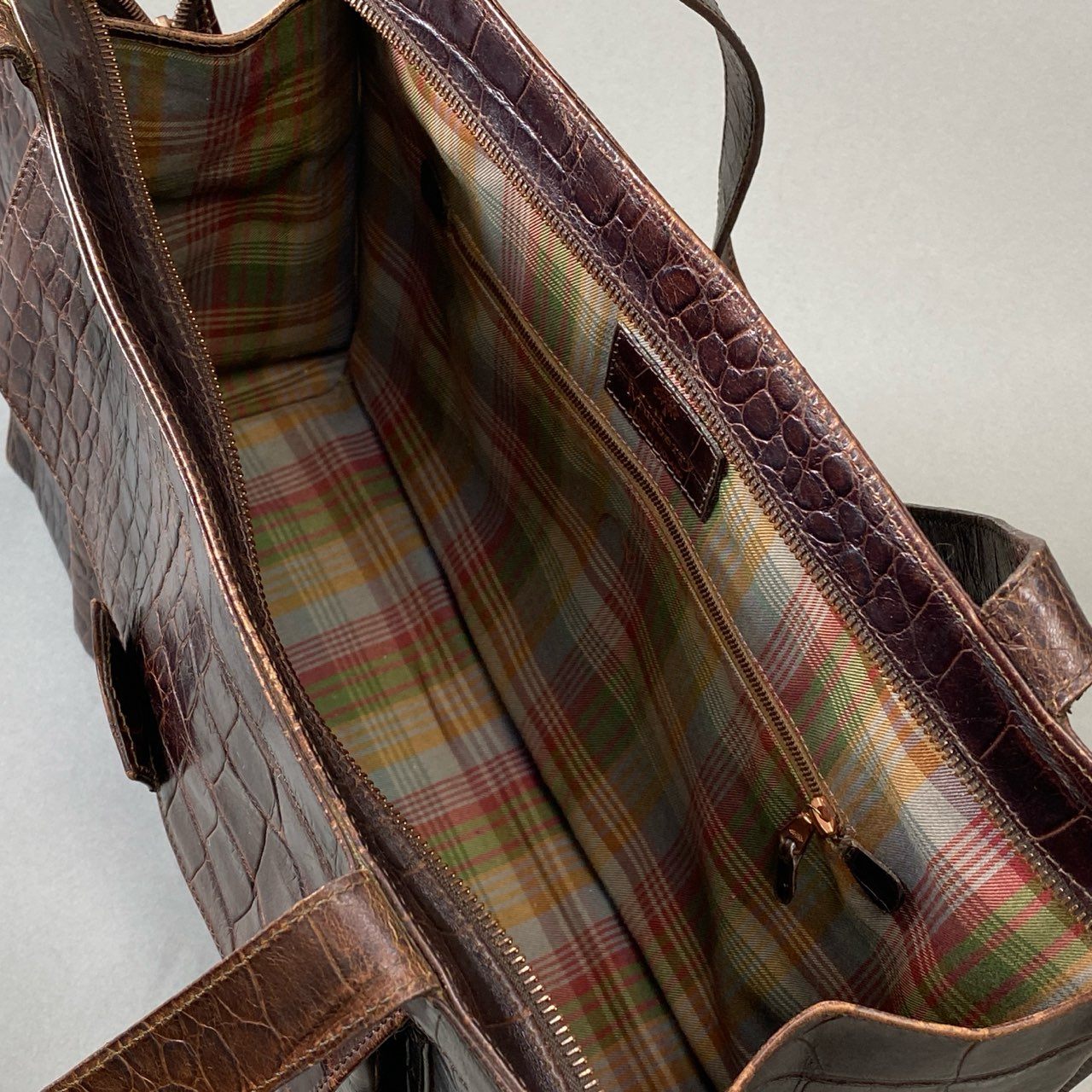 重厚感のあるダークブラウンのクロコ型押しレザーを使用したトートバッグです。写真からは光沢を帯びた艶感と深みのあるブラウンの濃淡が確認でき、落ち着きの中に高級感を漂わせています。大容量ながらスタイリッシュなフォルムで、内外ポケットが備わっており整理収納も容易。ビジネスバッグとしてはもちろん、旅行や休日のお出かけにも活躍します。上質レザーならではの経年変化も楽しめる、大人のための実用性と品格を兼ね備えた逸品です。