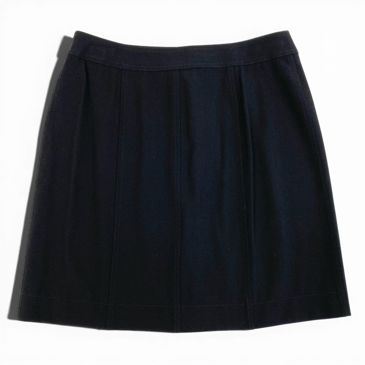 CHANEL1998年クルーズコレクションのミニスカートで、洗練されたオールブラックの佇まいが魅力です。マットで上質な生地感に、フロントのココマーク入りボタンがさりげないアクセントとなっています。無地で直線的なパネル切替が、シャネルらしい端正なシルエットを演出。ジャケット合わせのフォーマル寄りスタイルから、ニットやカットソーと合わせた都会的なカジュアルまで幅広く活躍する一着です。