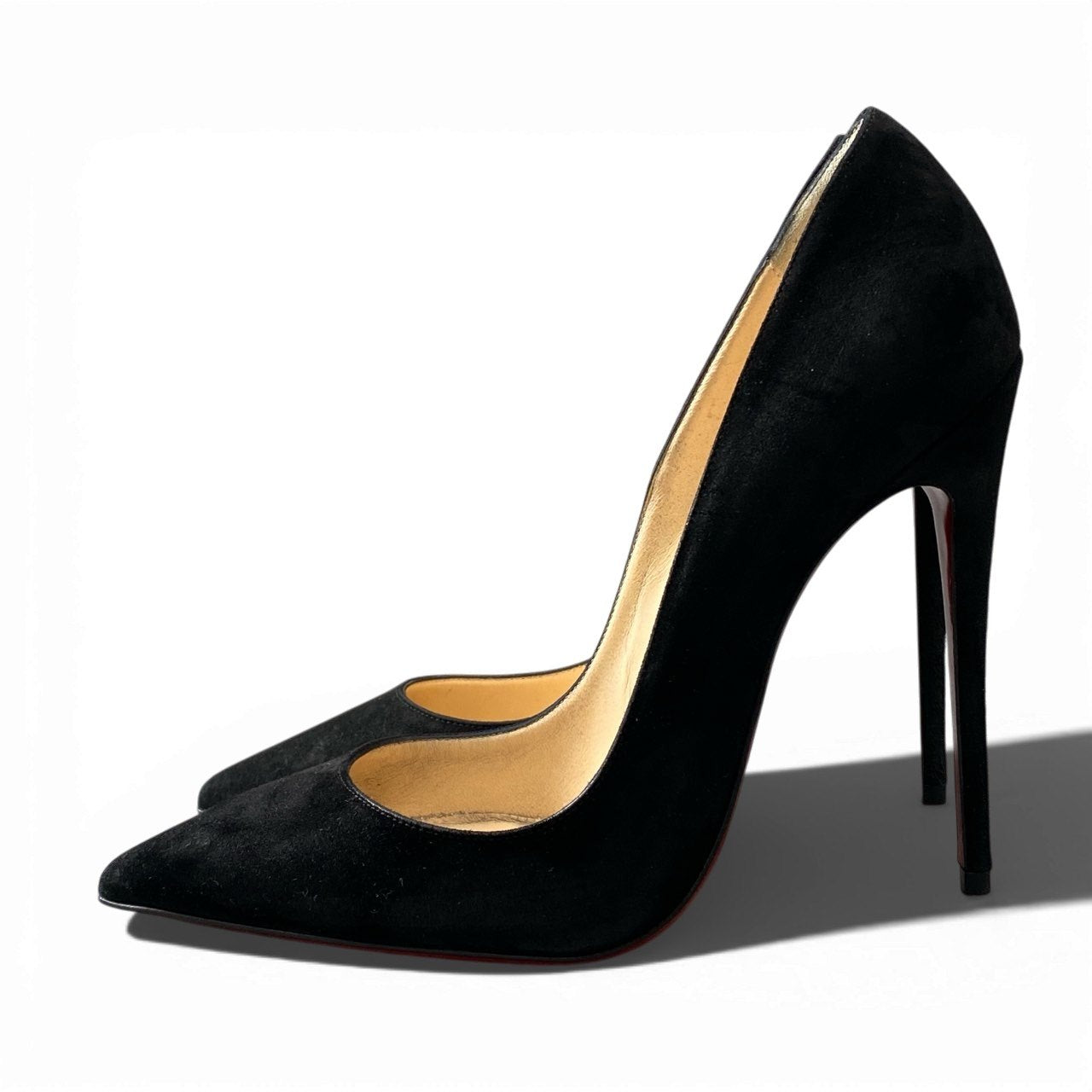 マットなブラックスエードが美しい、Christian Louboutinのピンヒールパンプスです。 シャープなポインテッドトゥと12.5cmヒールが脚線美を際立たせ、洗練された印象を演出します。 余計な装飾を省いたミニマルなデザインで、素材の上質さが際立つ一足。 フォーマルなパーティーや夜のお出かけ、特別な日のスタイリングに最適です。