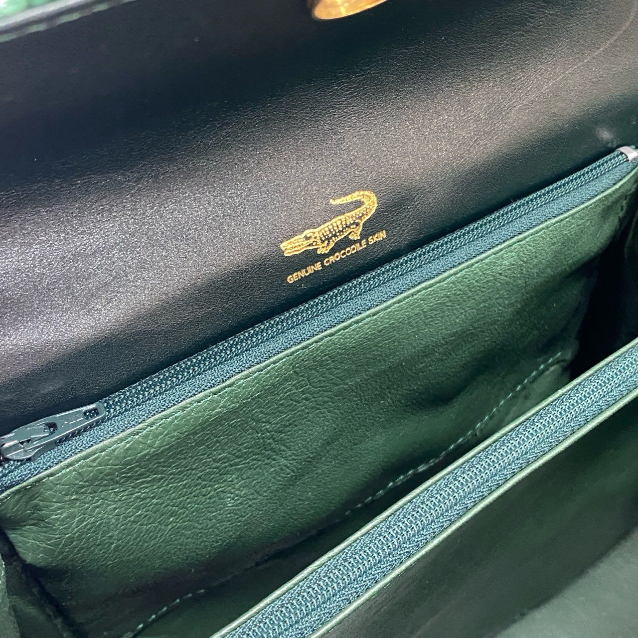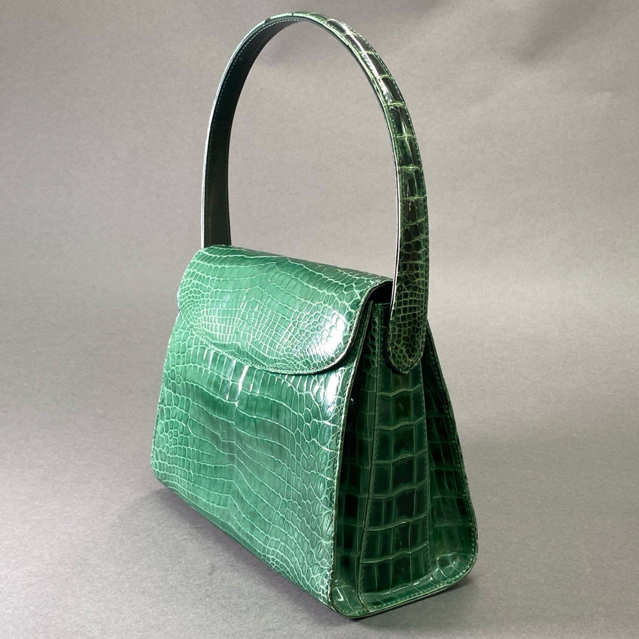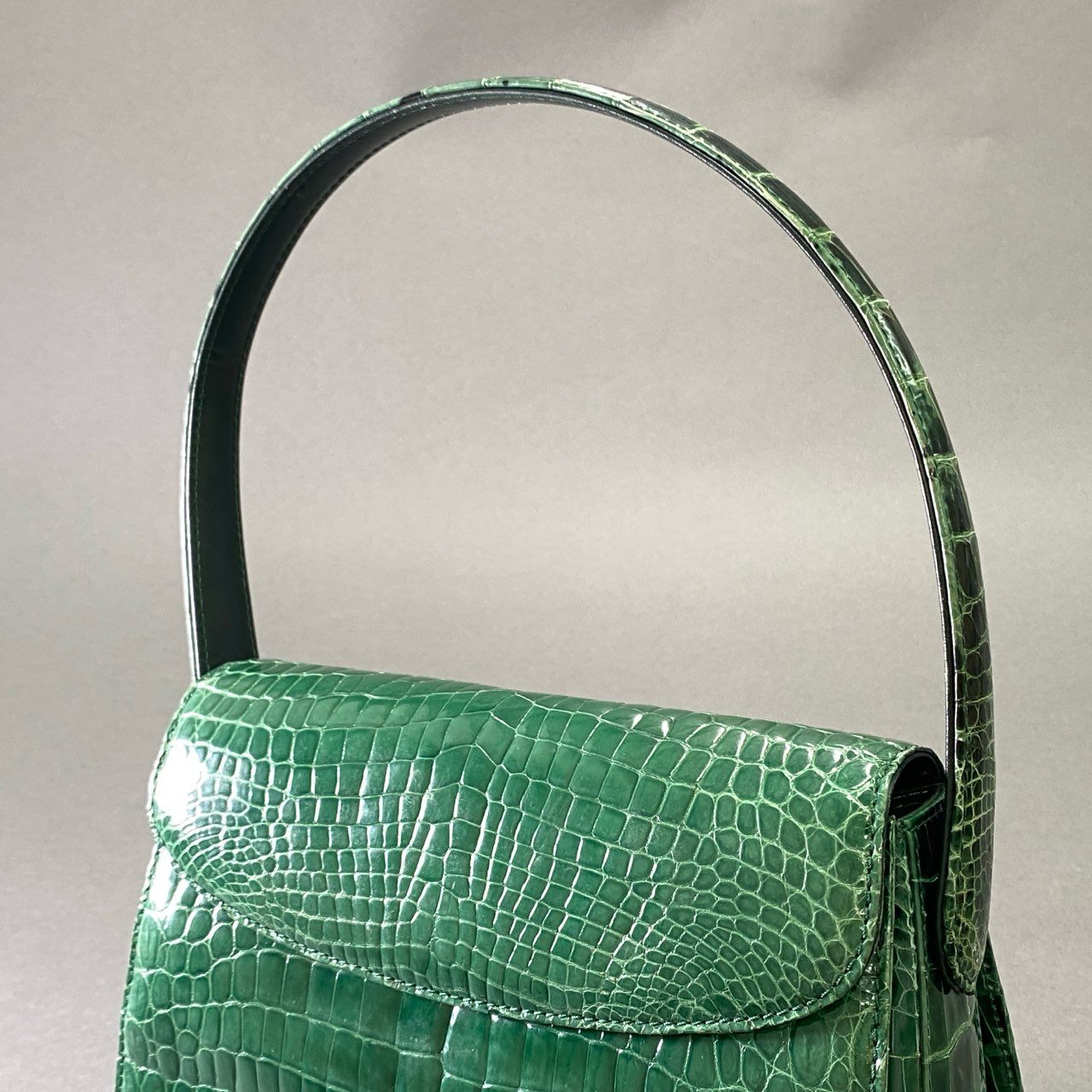 De18 本革 クロコダイルレザー センター取り ハンドバッグ ワンショルダーバッグ フラップ ワンハンドル グリーン シャイニングクロコダイル レディース 女性用 鞄