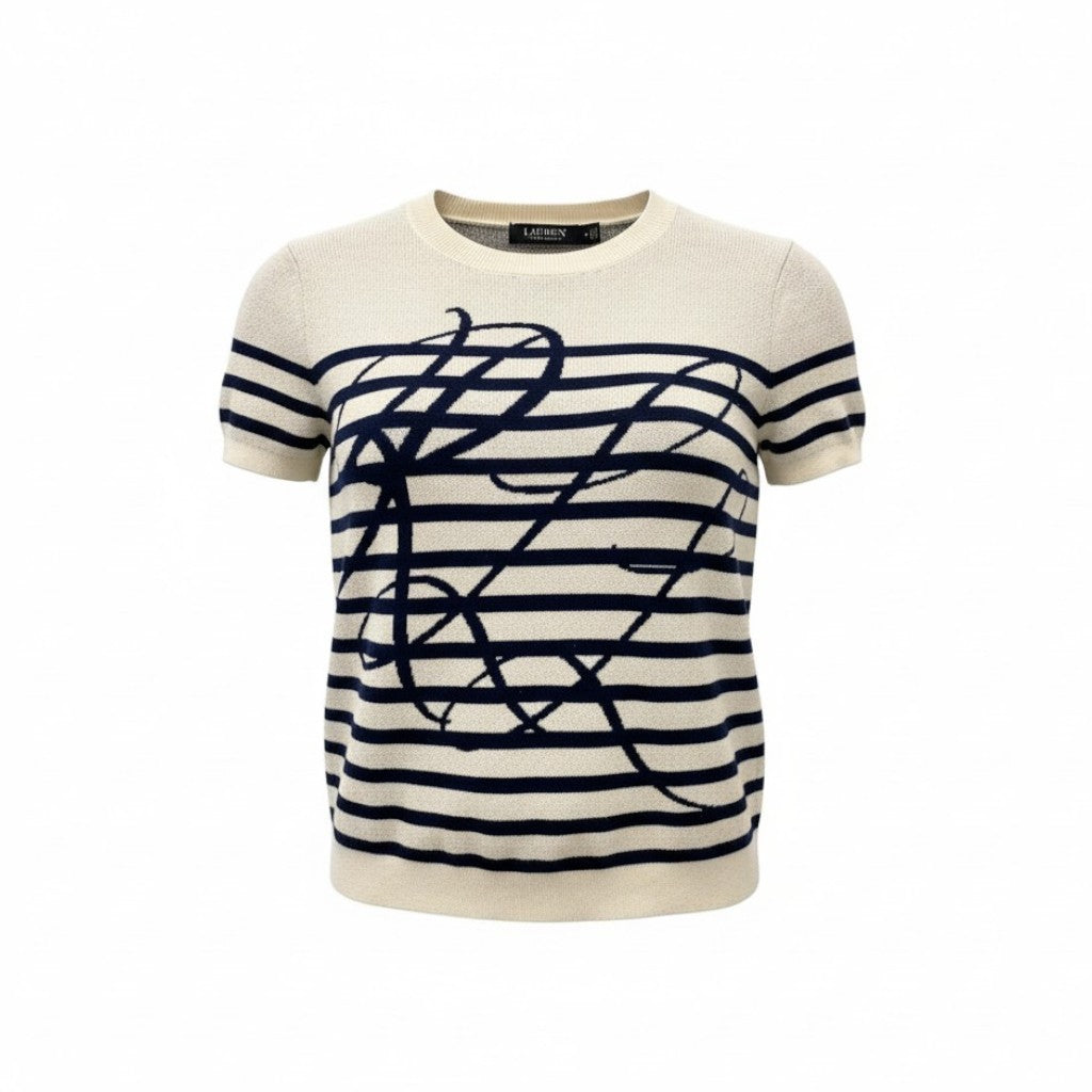 Lauren Ralph Lauren の半袖ニットサマーセーターです。アイボリーホワイトをベースにミッドナイトネイビーのボーダー柄が施され、フロントにはブランドを象徴する大きなLRロゴ風グラフィックがデザインされています。素材はマットで柔らかなコットンニットで、軽やかな着心地が特徴です。カジュアルなデニムからきれいめスカートまで合わせやすく、春夏シーズンのコーディネートのアクセントになる一着です。