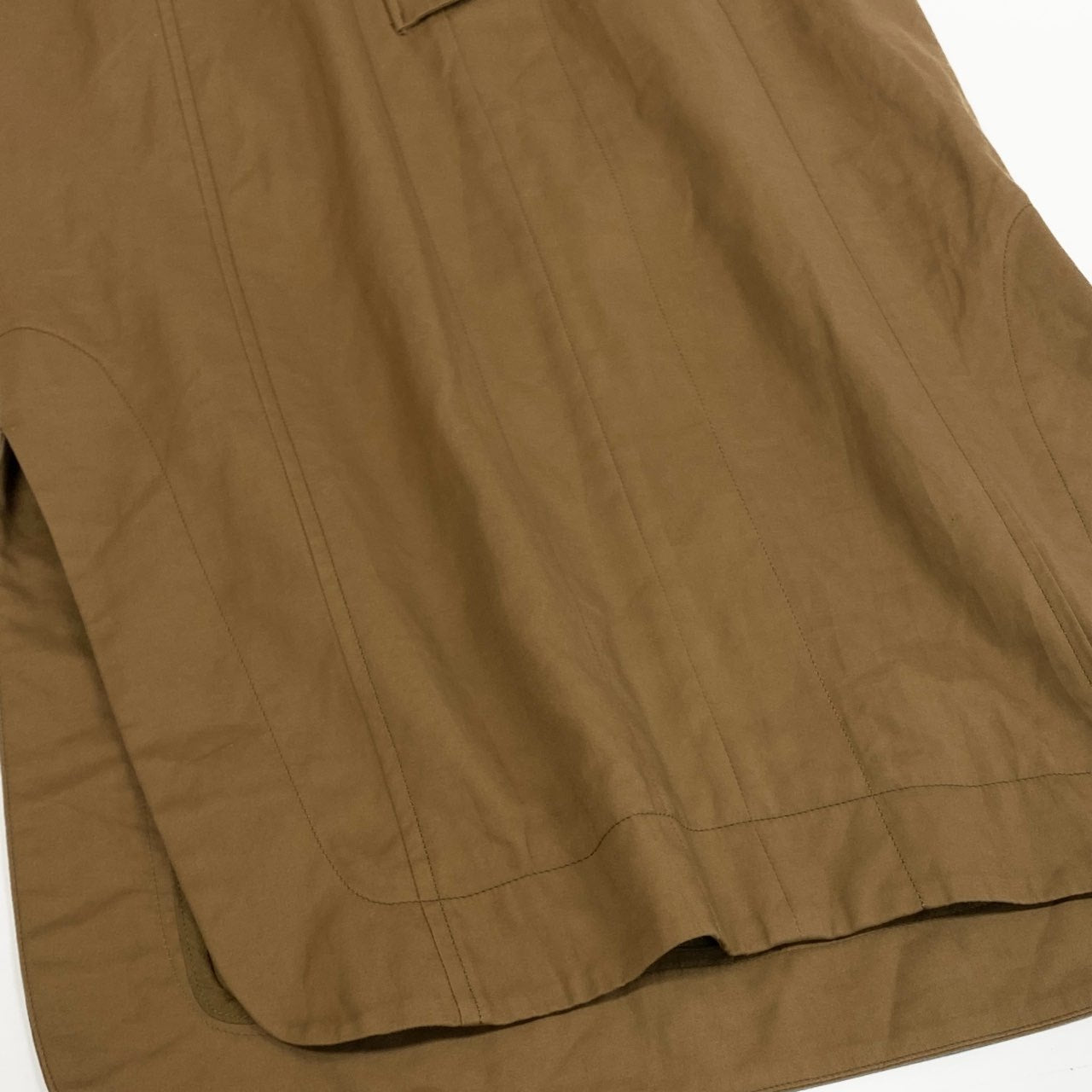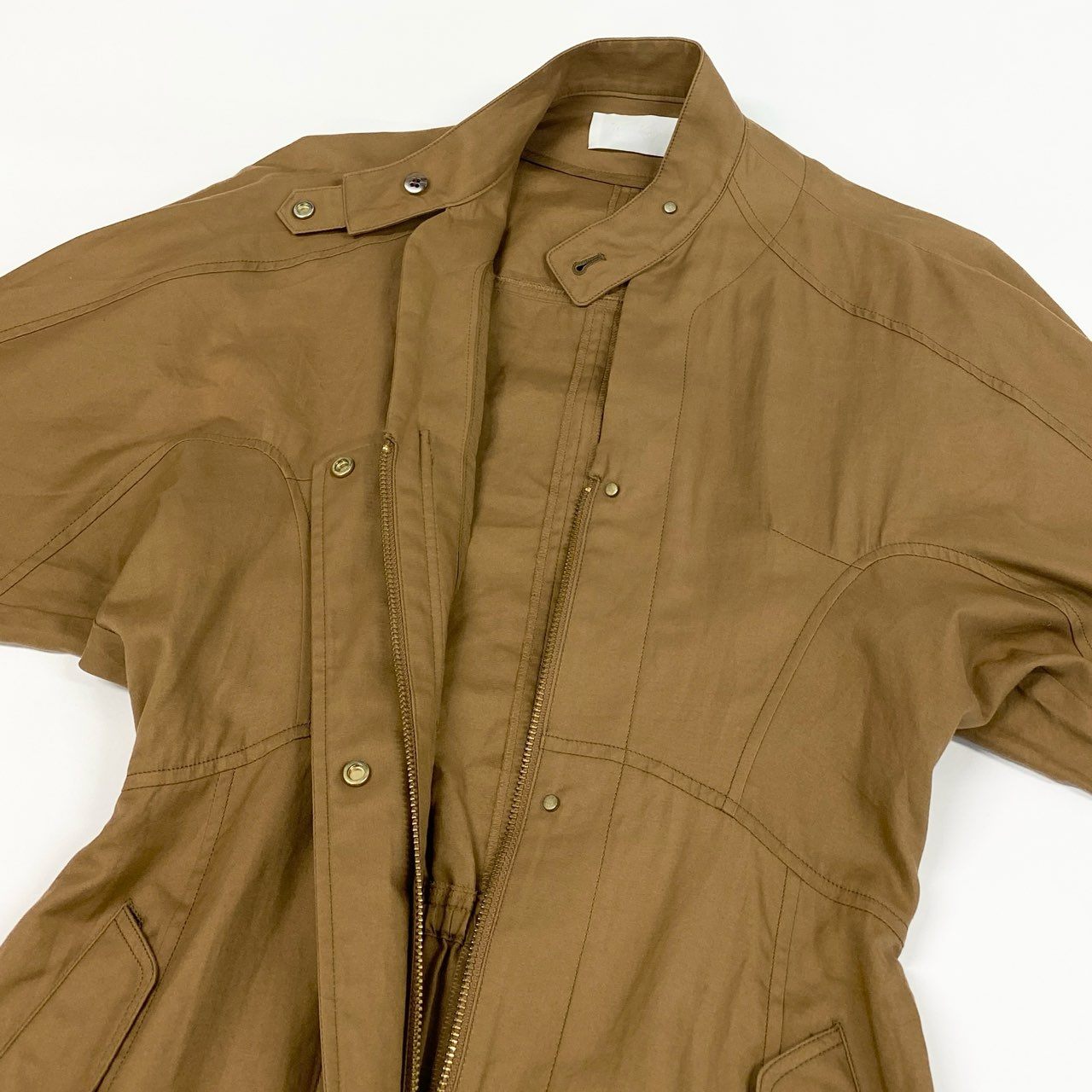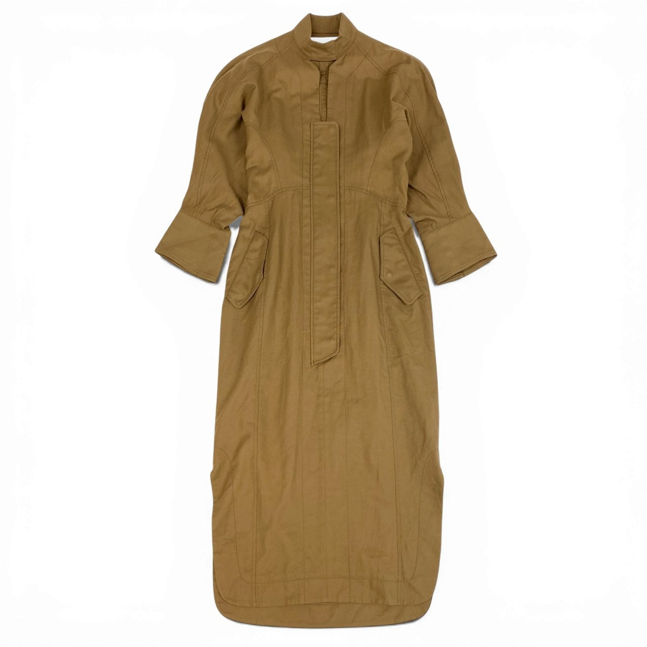 落ち着いたブラウン(キャメル寄り)が印象的な、Mame Kurogouchi のコットンダブルクロスドレス。マットなコットン100%素材で、ハリ感としなやかさを兼ね備えた上質な風合いです。立体的な切替ラインと比翼風フロントが、ミニマルながら洗練された存在感を演出。デイリーからモード寄りのお出かけ、秋冬の主役ワンピースとして活躍する一着です。