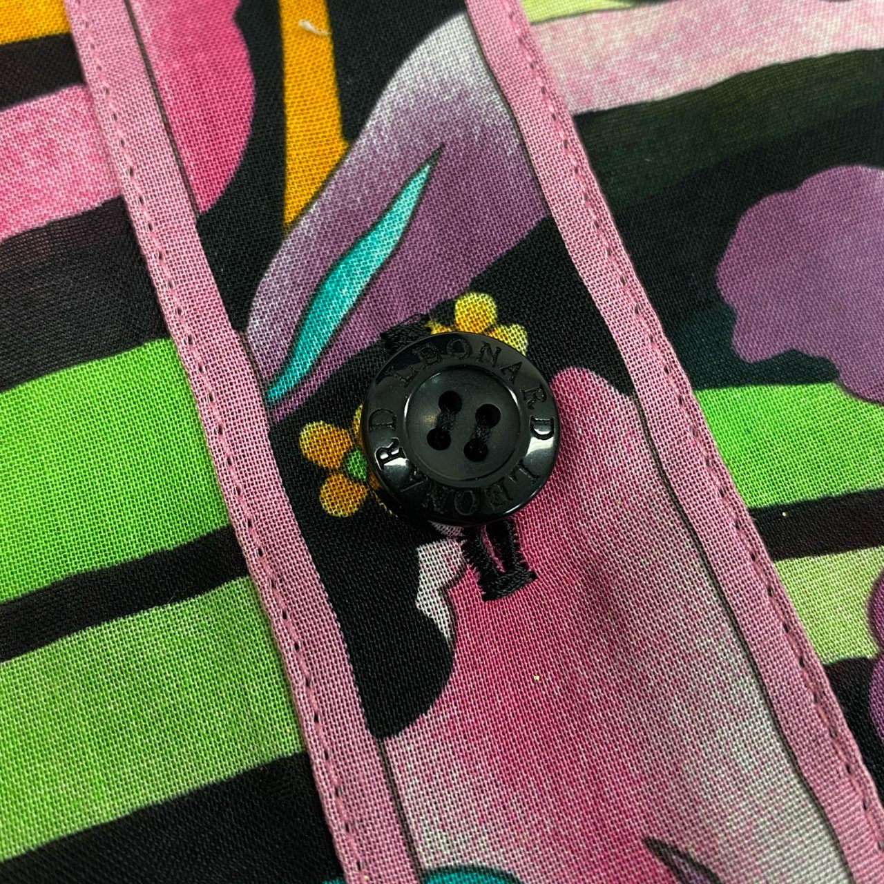 ブラックをベースに、エメラルドグリーン・ライムグリーン・ラベンダーパープル・フューシャピンク・マンダリンオレンジなどを大胆に重ねたボタニカル×ストライプ柄が印象的なレオナールのシアーシャツです。透け感のある軽やかな素材で、光を含んだような華やかさを演出します。フロントのブラックボタンとピンクの前立てラインがアクセントになっています。1枚で主役級の存在感があり、タンクトップに羽織るスタイルや、きれいめパンツとのコーディネートにも映えるエレガントな一着です。