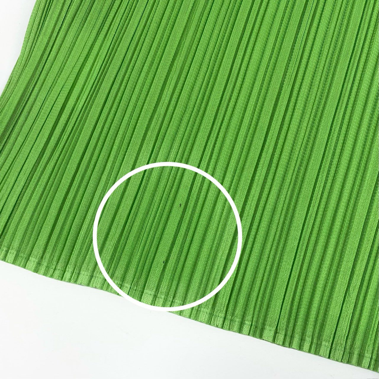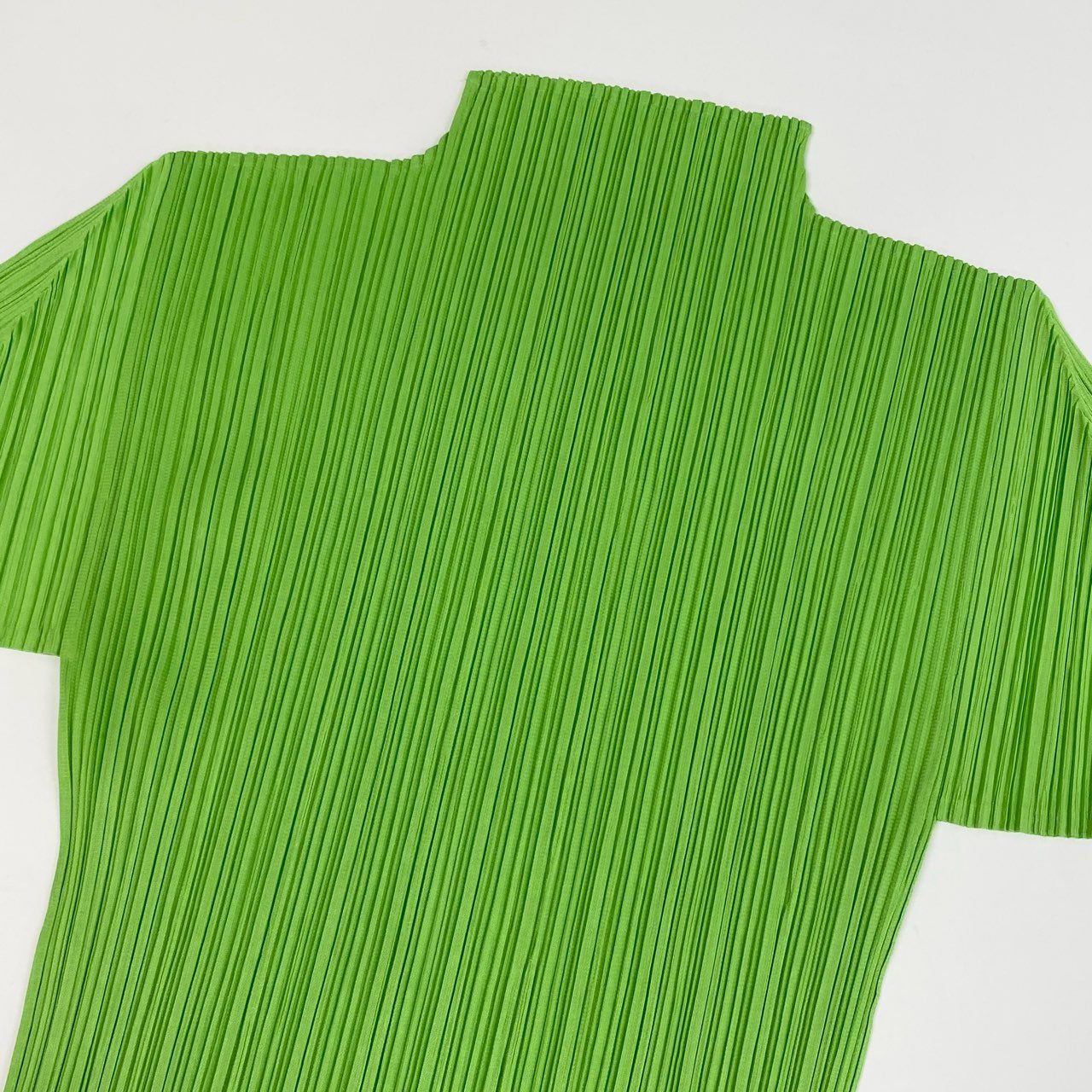 鮮やかなライムグリーンが目を惹く、PLEATS PLEASE(プリーツプリーズ)のハイネックカットソー。ブランド特有の縦プリーツが美しい立体感を生み、動きに合わせて自然に揺れる軽やかな仕上がりです。光沢を抑えたマットなポリエステル素材でシワになりにくく、お手入れも簡単。フィット感のあるシルエットながら快適なストレッチ性を備え、レイヤードや単体コーデにもおすすめの一枚です。
