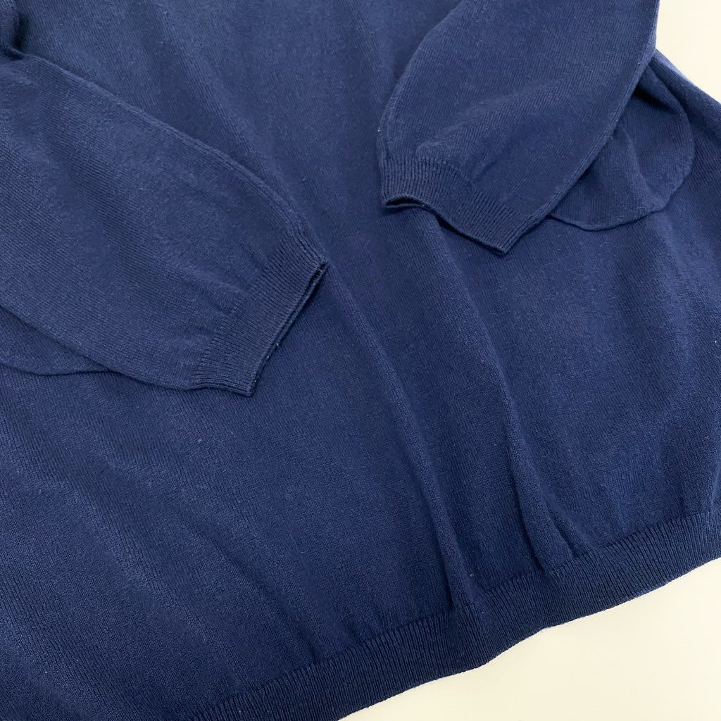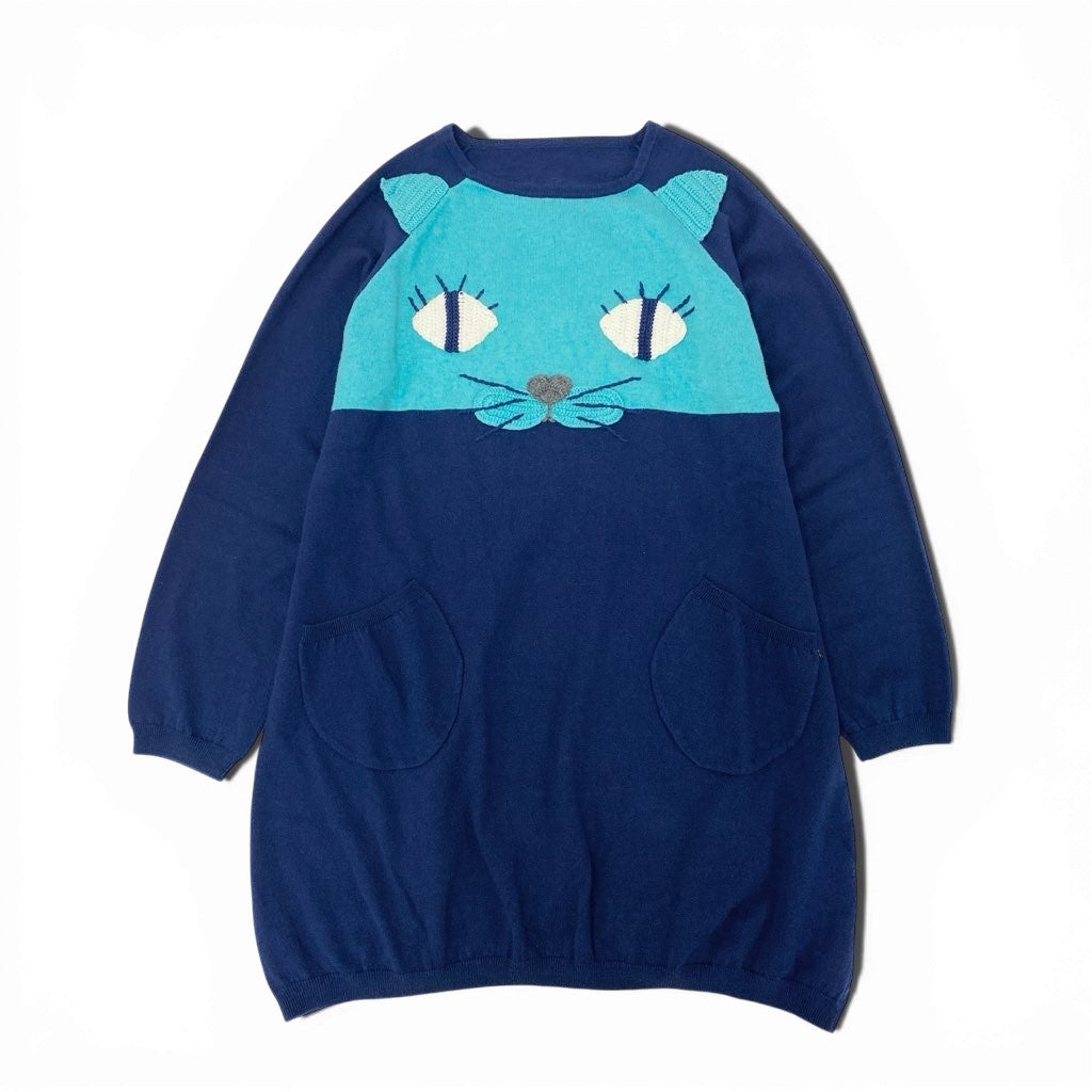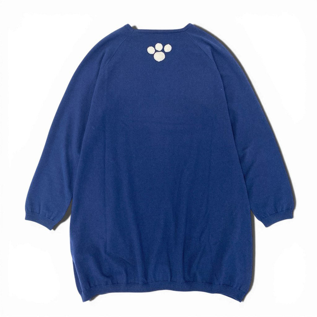 深みのあるネイビーブルーをベースに、ライトブルーで表現された猫モチーフが印象的なチュニックワンピースです。 前後でデザインが異なり、フロントはフェイス柄、バックには肉球モチーフを配した遊び心ある一着。 マットなコットンニット素材で肌触りが良く、長時間の着用でも快適です。 一枚着はもちろん、レギンスや細身パンツとのレイヤードでカジュアルに楽しめ、普段使いからちょっとした外出まで幅広く活躍します。