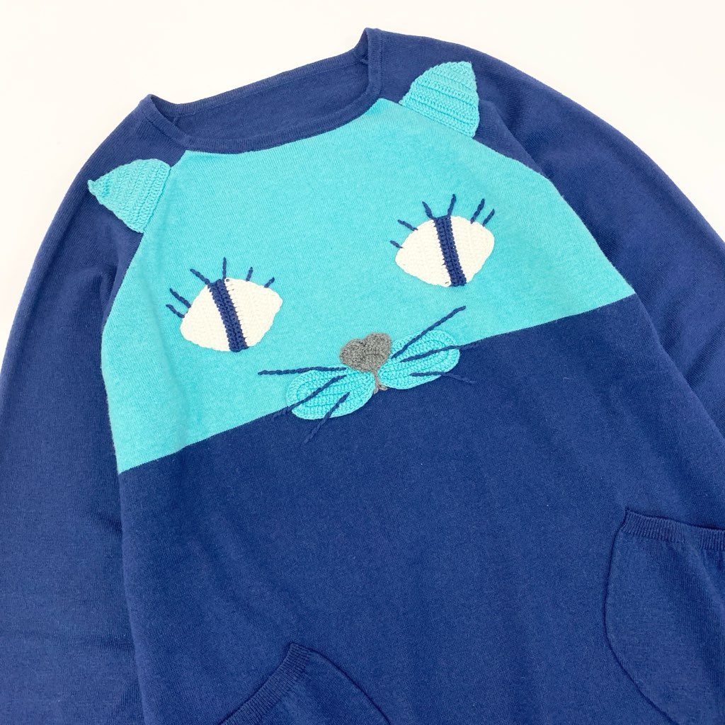 5a12 TOKUKO 1er VOL トクコプルミエヴォル チュニックワンピース ロングスリーブ ニットワンピース 猫刺繍 レディース 女性用 サイズ9 ブルー ライトブルーu02t