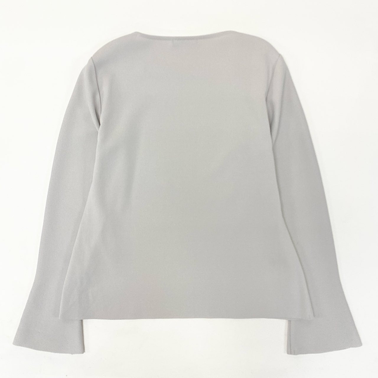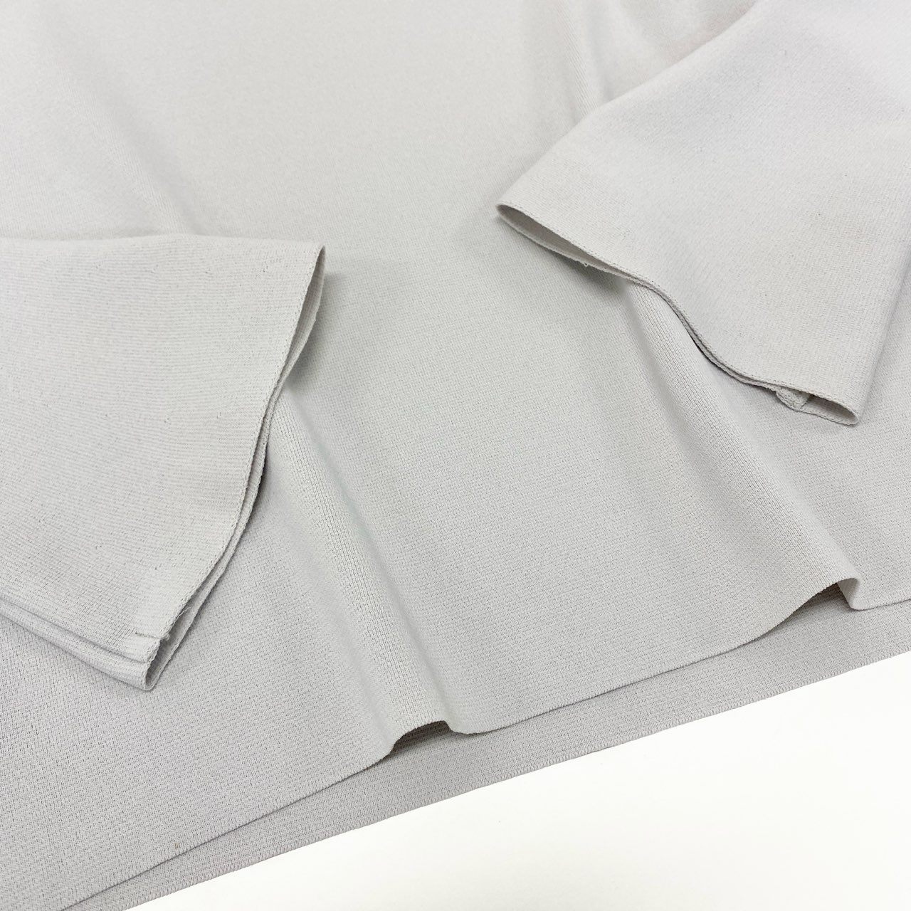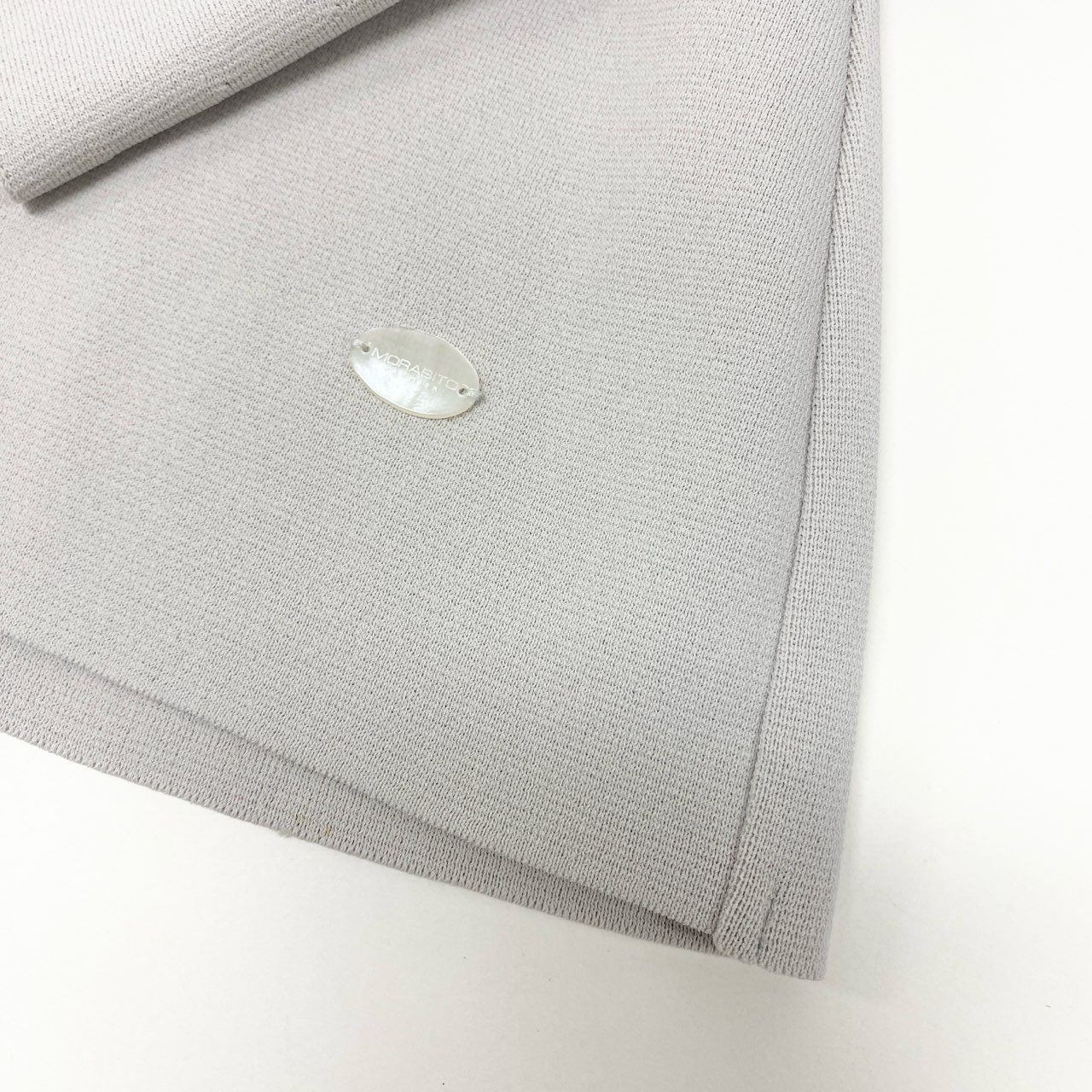 モラビトの長袖ニット、品番9049-51204です。カラーは上品なグレーで、無地のシンプルデザインにスクエアネックが特徴。マットな質感のニット素材で、きれいめスタイルからカジュアルまで合わせやすい一着です。裾部分にはさりげないブランドロゴモチーフがあしらわれ、落ち着いた印象ながら高級感を演出します。オフィスやディナーなどフォーマル寄りのシーンにもおすすめです。