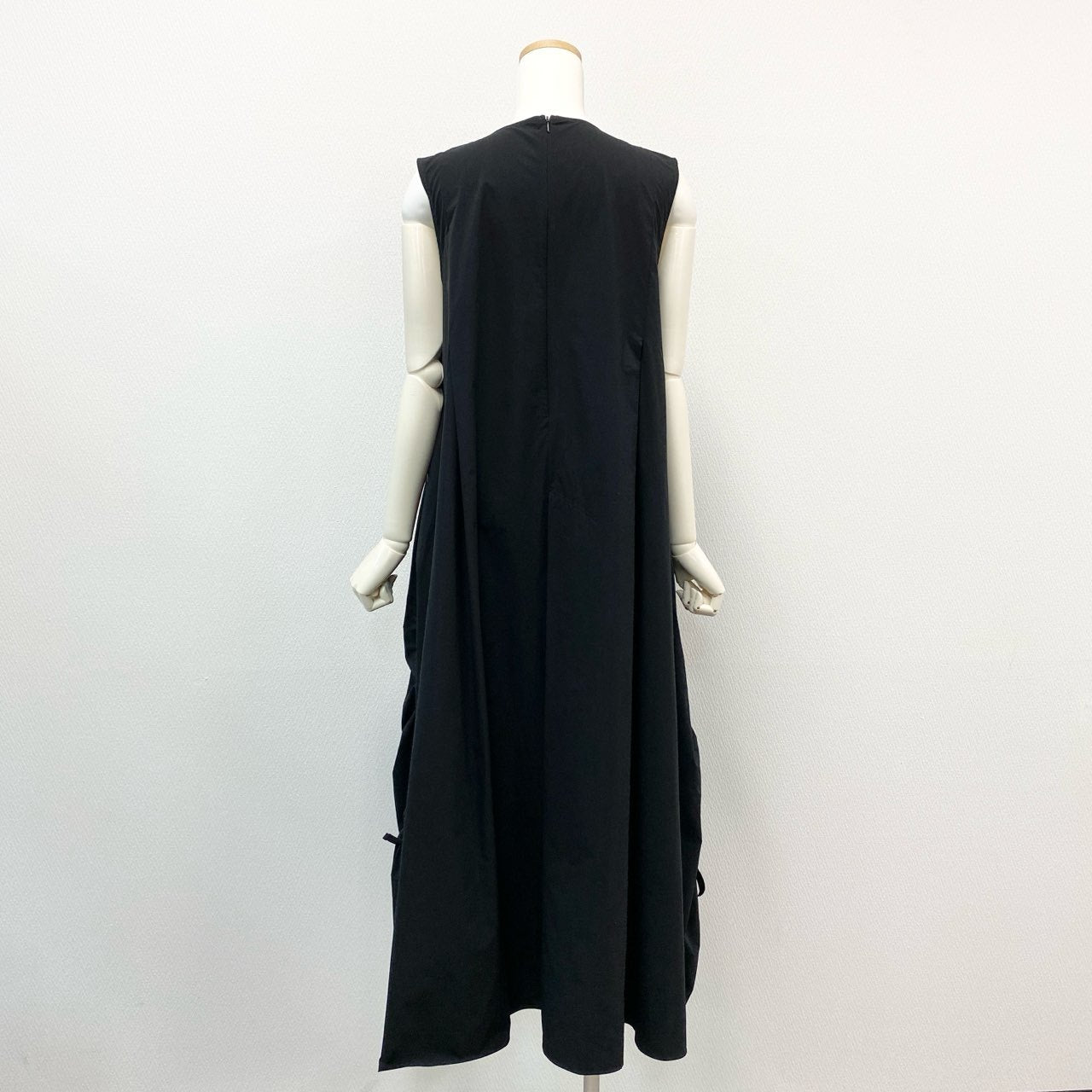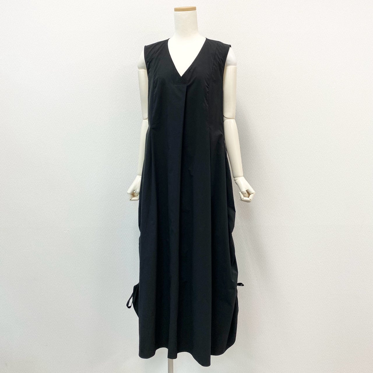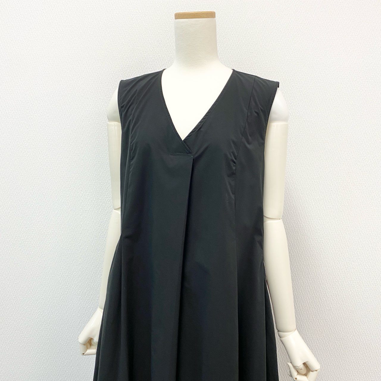 モラビトの「ノースリーブワンピース」、カラーはシックなブラックです。Vネックとサイドドロスト仕様が特徴で、シルエットに変化をつけられるデザイン性があります。軽やかでマットな質感の素材が上品な印象を与え、日常使いからディナーやお出かけシーンまで幅広く活躍。装飾にはさりげないラインストーンが施され、華やかさをプラスしています。シンプルながらも洗練された存在感を放つ一着です。