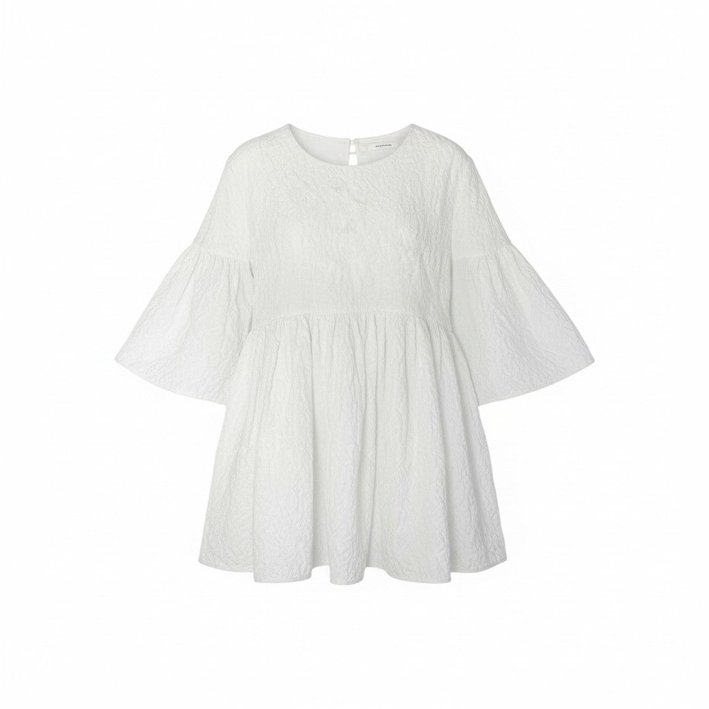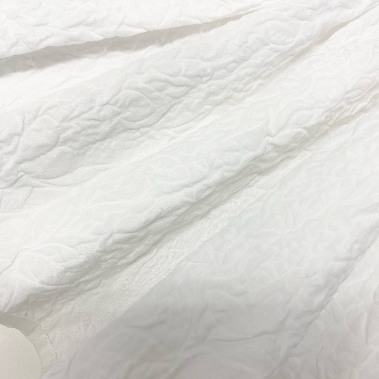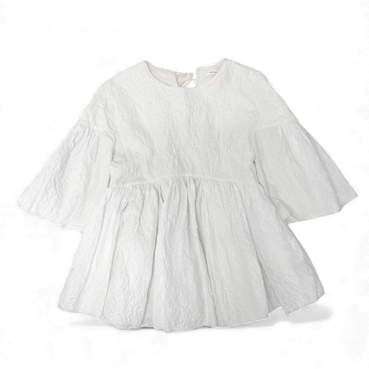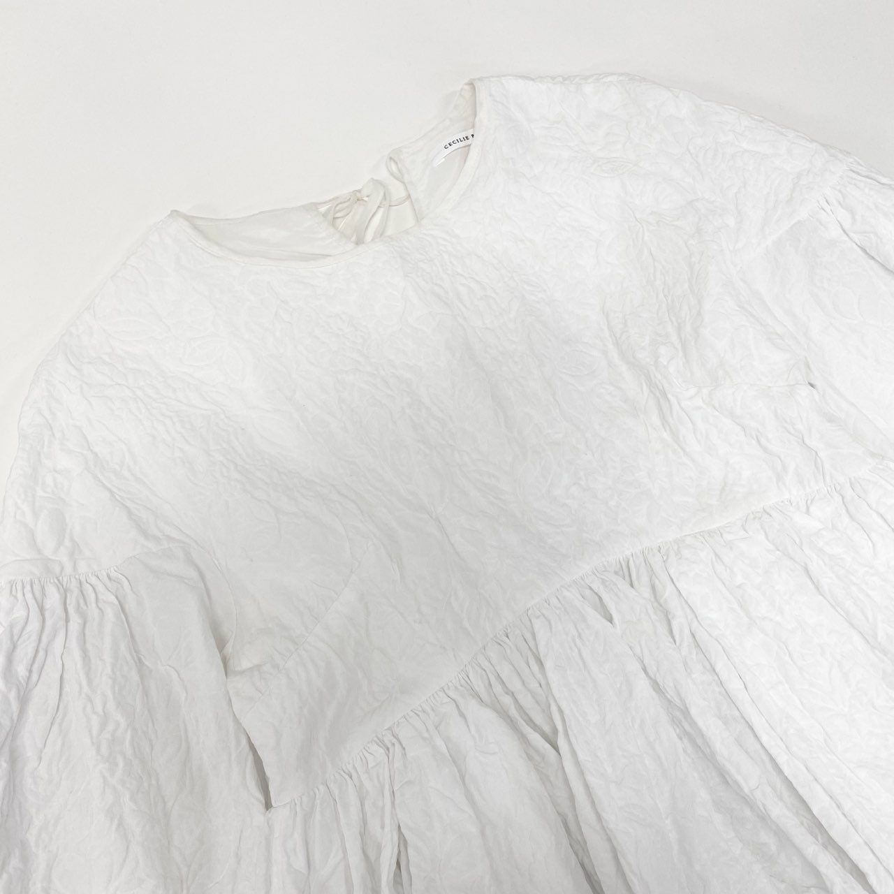 セシリーバンセンらしい立体感のある フラワーエンボス生地 を贅沢に使った、上品なホワイトブラウスです。 袖にたっぷりとギャザーを入れた ボリュームスリーブ と、バックの レースアップデザイン が後ろ姿まで美しく演出します。 軽やかに広がるAラインシルエットで、デニムからスカートまで幅広くコーディネート可能。 特別なシーンはもちろん、日常のスタイリングにも取り入れやすい1着です。