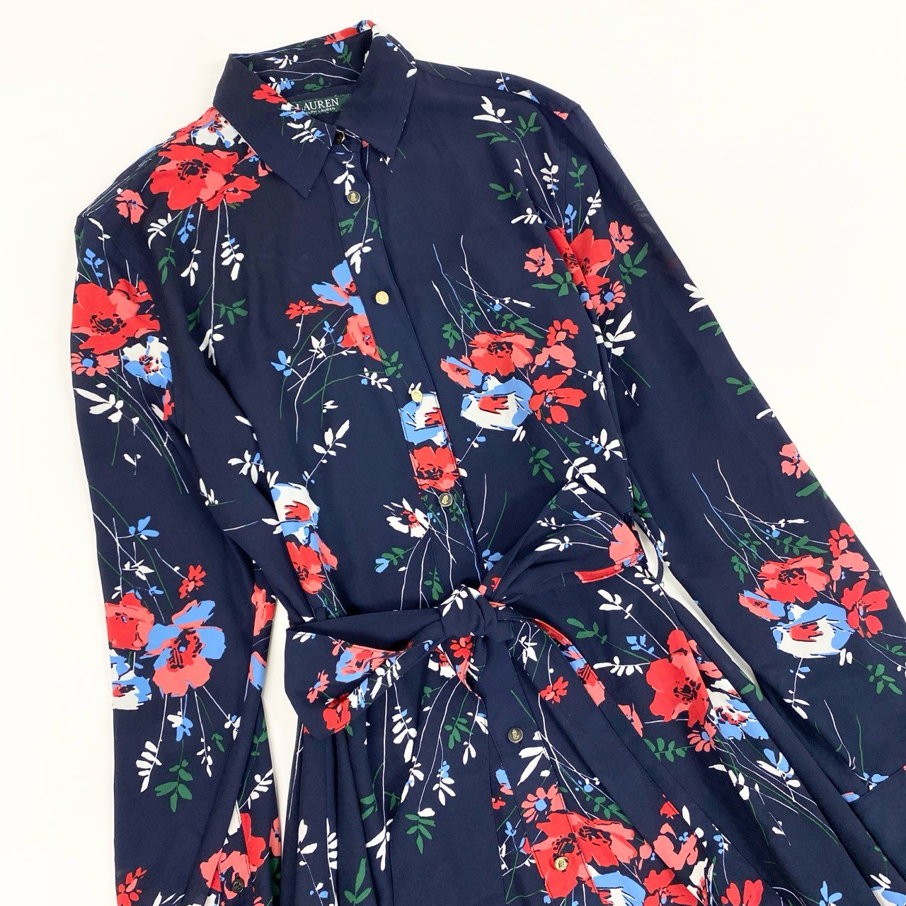 ミッドナイトネイビーをベースに、レッド・サックスブルー・ホワイトのフラワープリントが映える華やかなワンピースです。 マットでとろみのあるポリエステル素材で、動くたびにしなやかなドレープを演出します。 ゴールドボタンと共布ベルトが上品なアクセントに。 シャツカラー仕様で、きちんと感とフェミニンさを兼ね備えたデザインです。 お出かけや食事会、セミフォーマルなシーンまで幅広く活躍する一着です。
