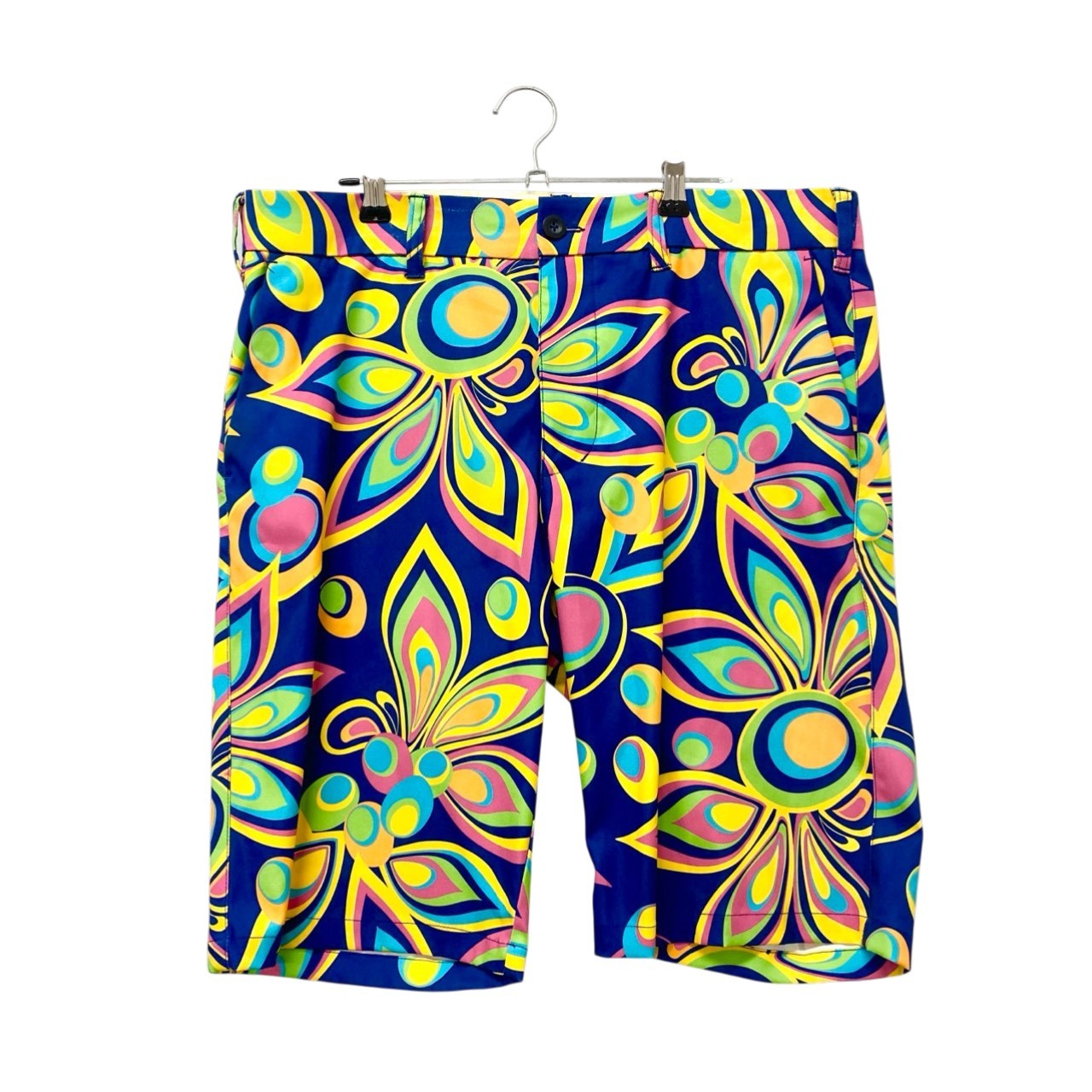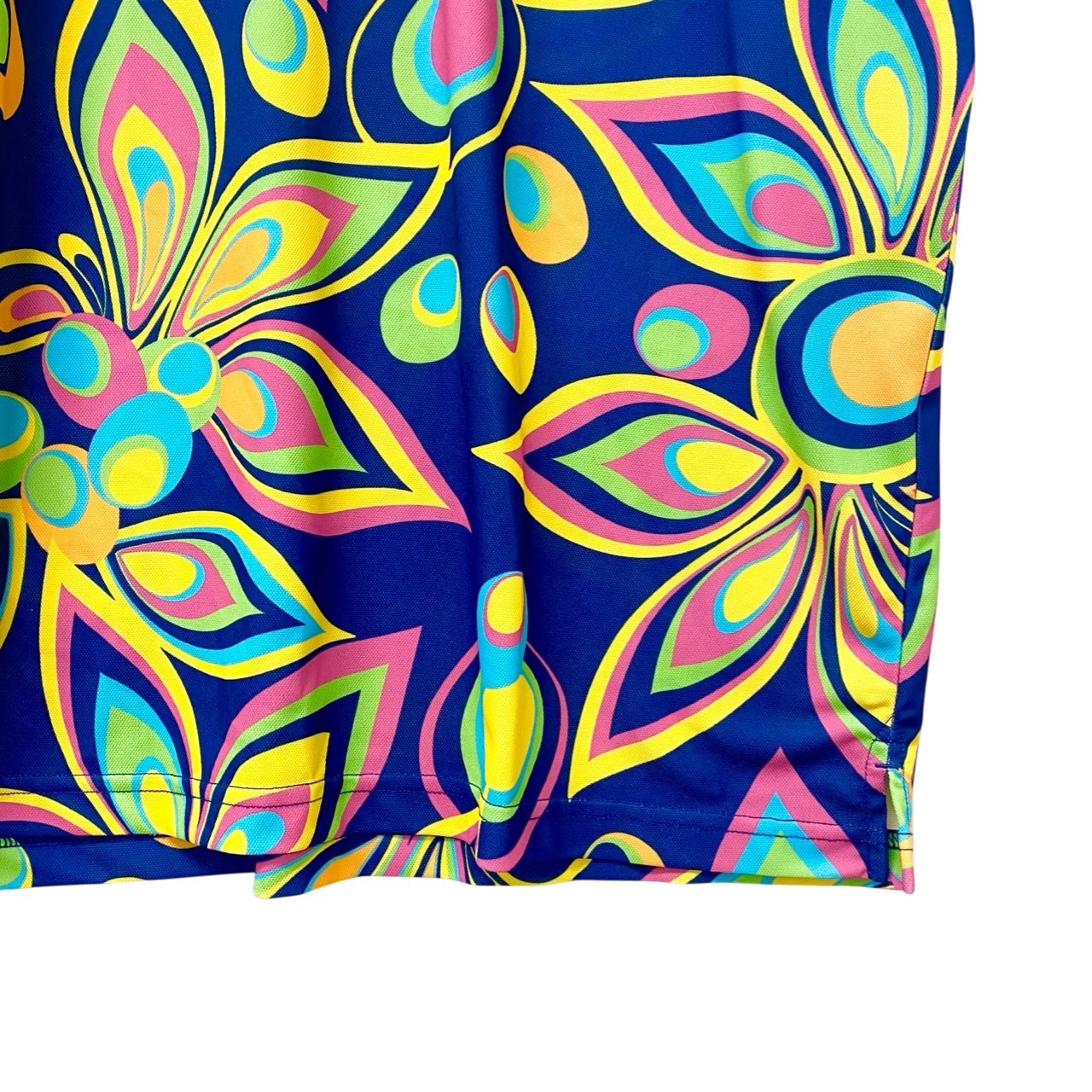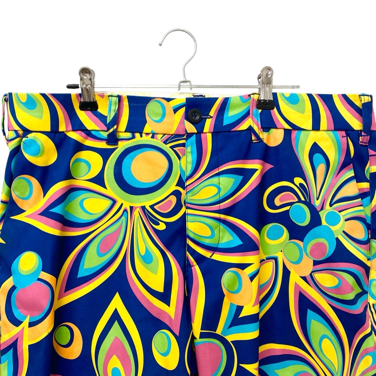 ネイビーベースにイエロー、グリーン、ピンクなどの鮮やかなカラーを組み合わせた、花柄風のサイケデリックパターンが印象的なLOUD MOUTHのゴルフウェアセットアップです。吸水速乾性に優れたポリエステル素材で、暑い季節のスポーツシーンでも快適に着用できます。半袖ポロシャツとハーフパンツのセットで、ゴルフやリゾート、アクティブなレジャーシーンにもおすすめの一着です。存在感のある大胆なデザインで、コーディネートの主役になるアイテムです。