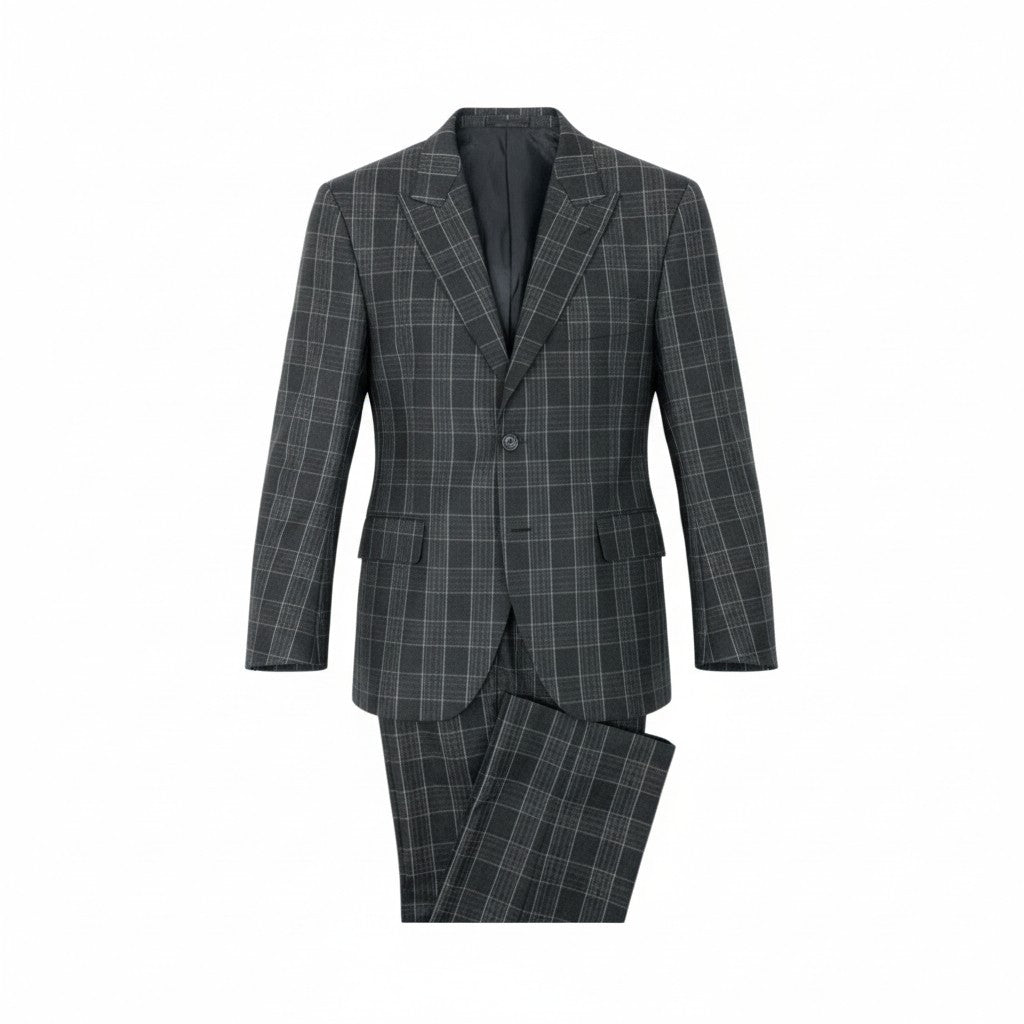 カラーは落ち着いたチャコールグレー × ホワイトラインのチェック柄で、大人の雰囲気を引き立てるモダンなセットアップスーツです。素材はマットで柔らかなウール調生地で、ビジネスシーンでも快適に着用できる上質な質感。ジャケットは2ボタン仕様で、肩まわりに程よく構築感がありスタイルがきれいに見えるデザインです。パンツはノータックのすっきりしたシルエットで、チェック柄ながら落ち着いたコーディネートがしやすい一着。普段のビジネスからフォーマル寄りのシーンまで幅広く活躍する万能スーツです。