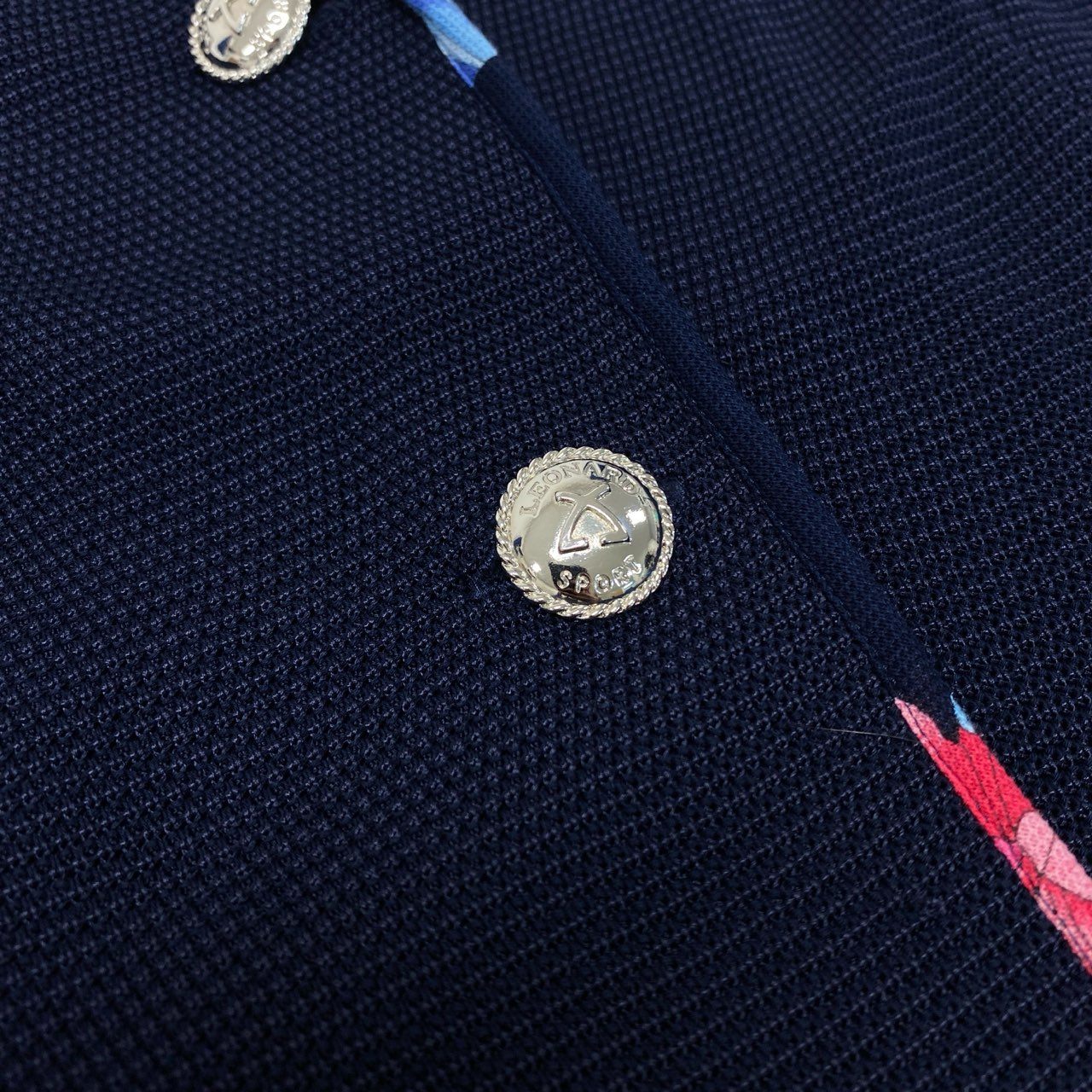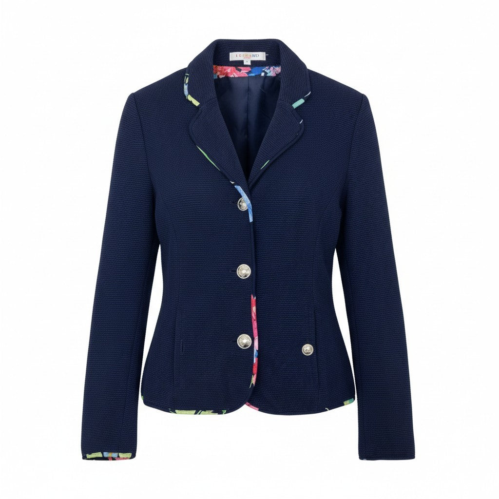 上品なミッドナイトネイビーに、襟元や前立て裏に施されたフローラル柄の配色トリミングが映える、LEONARDらしいエレガントなジャケットです。素材は立体感のある凹凸ワッフル調の上質ファブリックで、軽量ながら形がきれいに出るのが特徴。フロントにはメタルボタンを採用し、華やかさと高級感をプラスしています。オフィスシーンはもちろん、食事会やフォーマル寄りのコーデにも活躍する一着です。着るだけで女性らしいシルエットを引き立ててくれます。