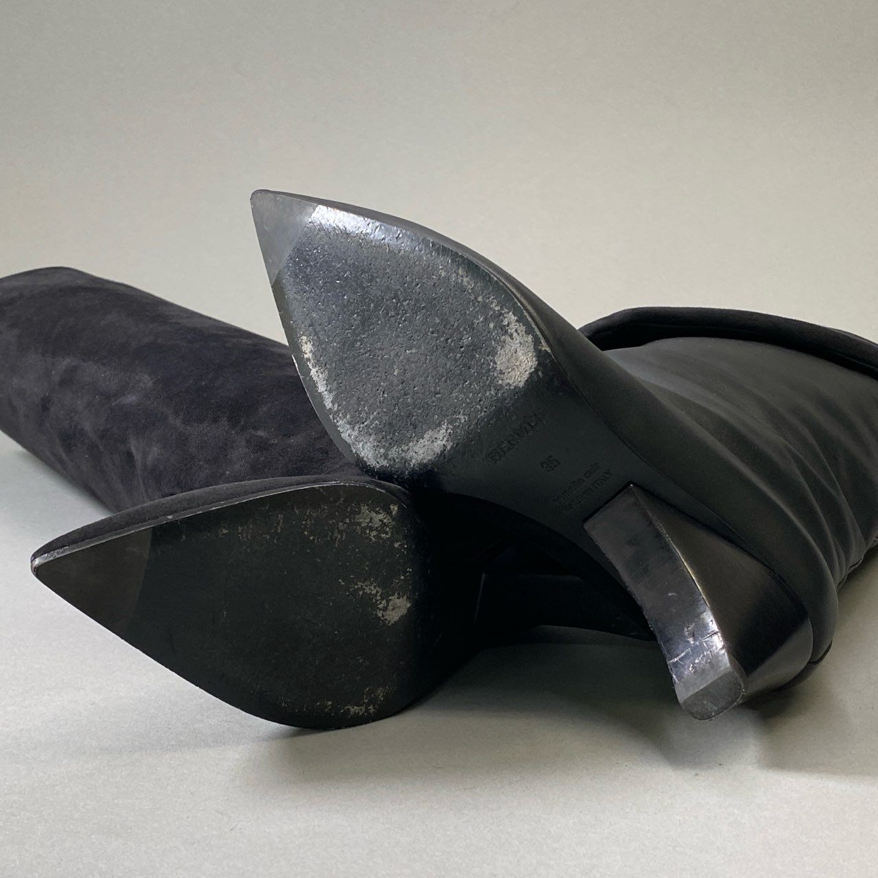 エルメスのロングブーツ「Stiefel Hilona 55」、ブラックのシェーブルヴェロアとヴォースープルを組み合わせた贅沢な素材使いが魅力です。スエード調のマットな質感と、しなやかなレザーの切り替えデザインが高級感を際立たせます。シャープなポインテッドトゥと5.5cmヒールが脚を美しく見せ、ワンピースやスカート、スリムパンツとの相性も抜群。秋冬の装いにエレガンスと洗練をプラスする一足です。