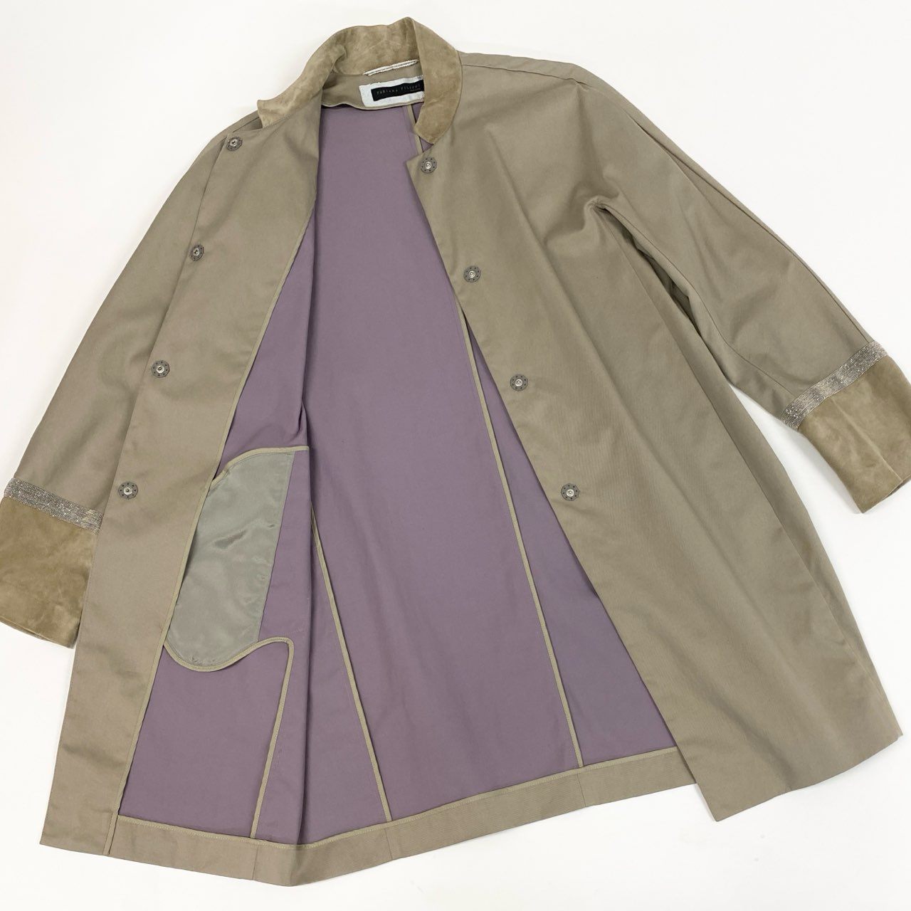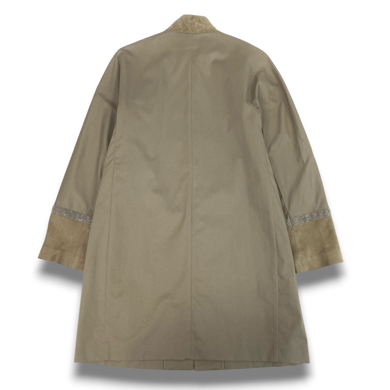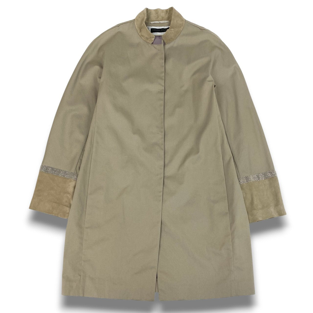 50b22 FABIANA FILIPPI ファビアナフィリッピ ステンカラーコート スプリングコート 薄手 ビーズ装飾 スエードレザー切替 レディース 女性服 XS ベージュu02t
