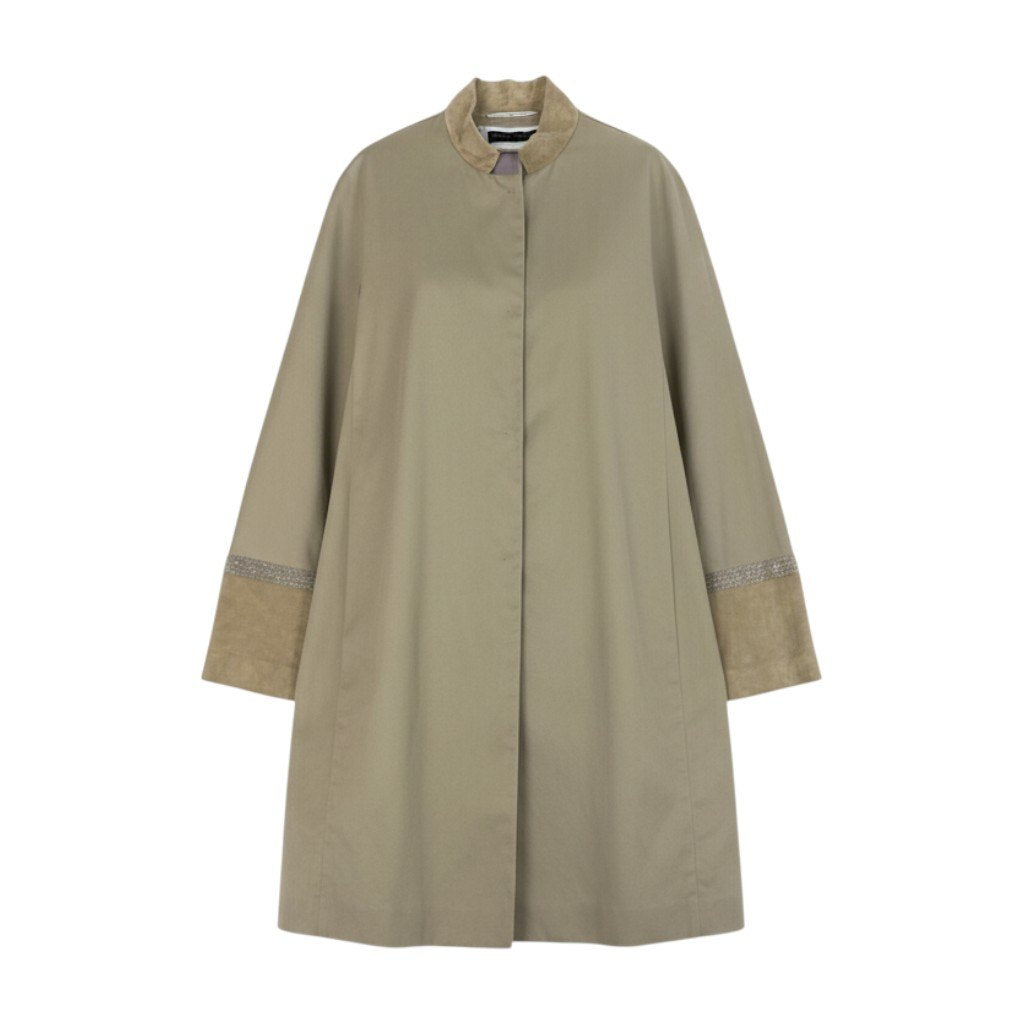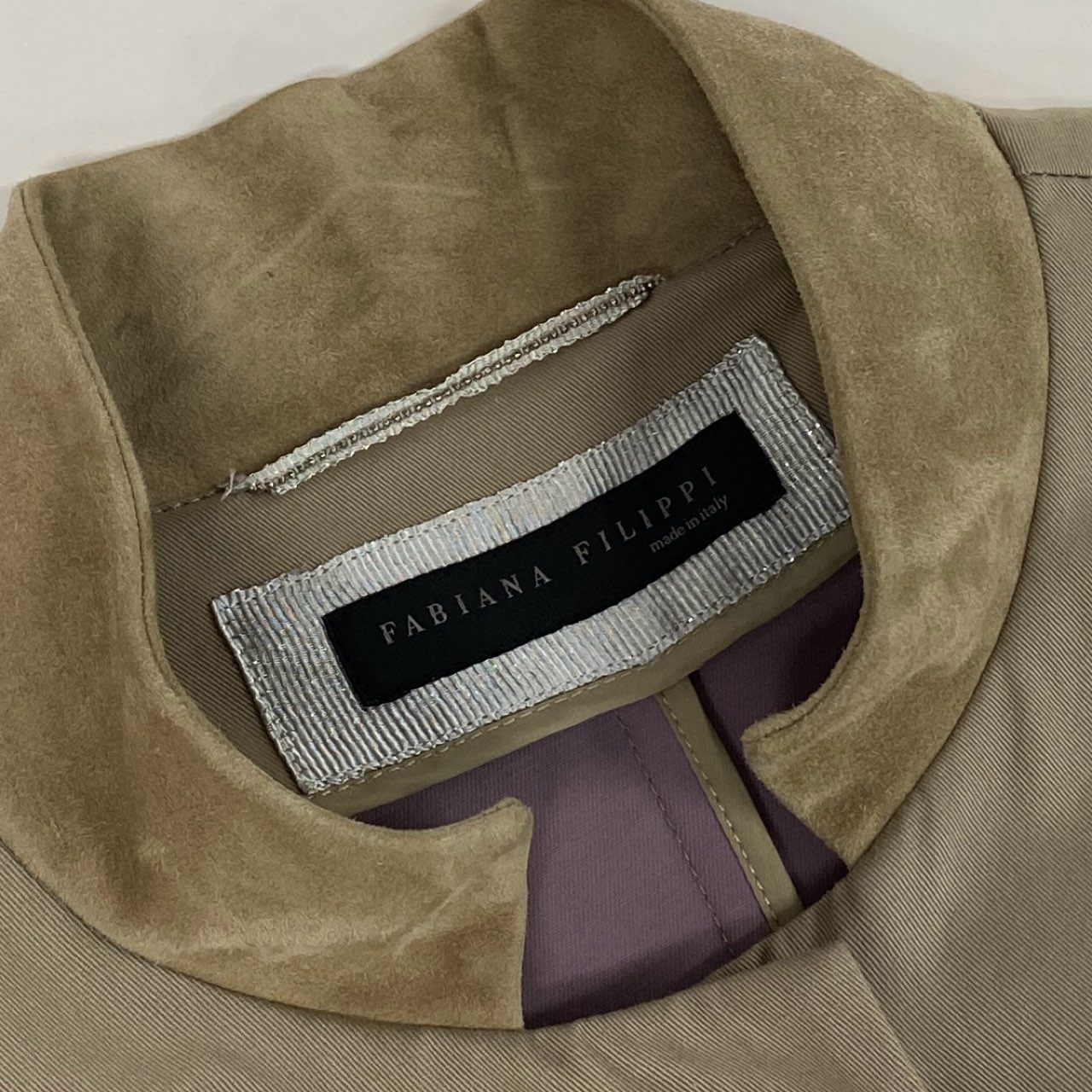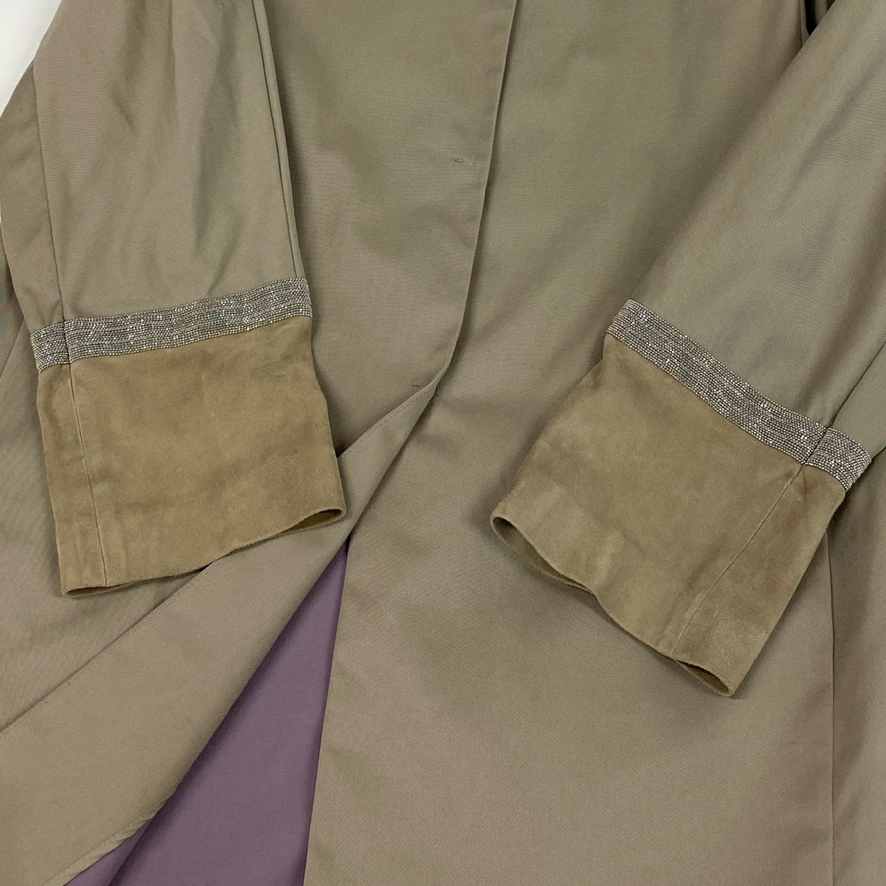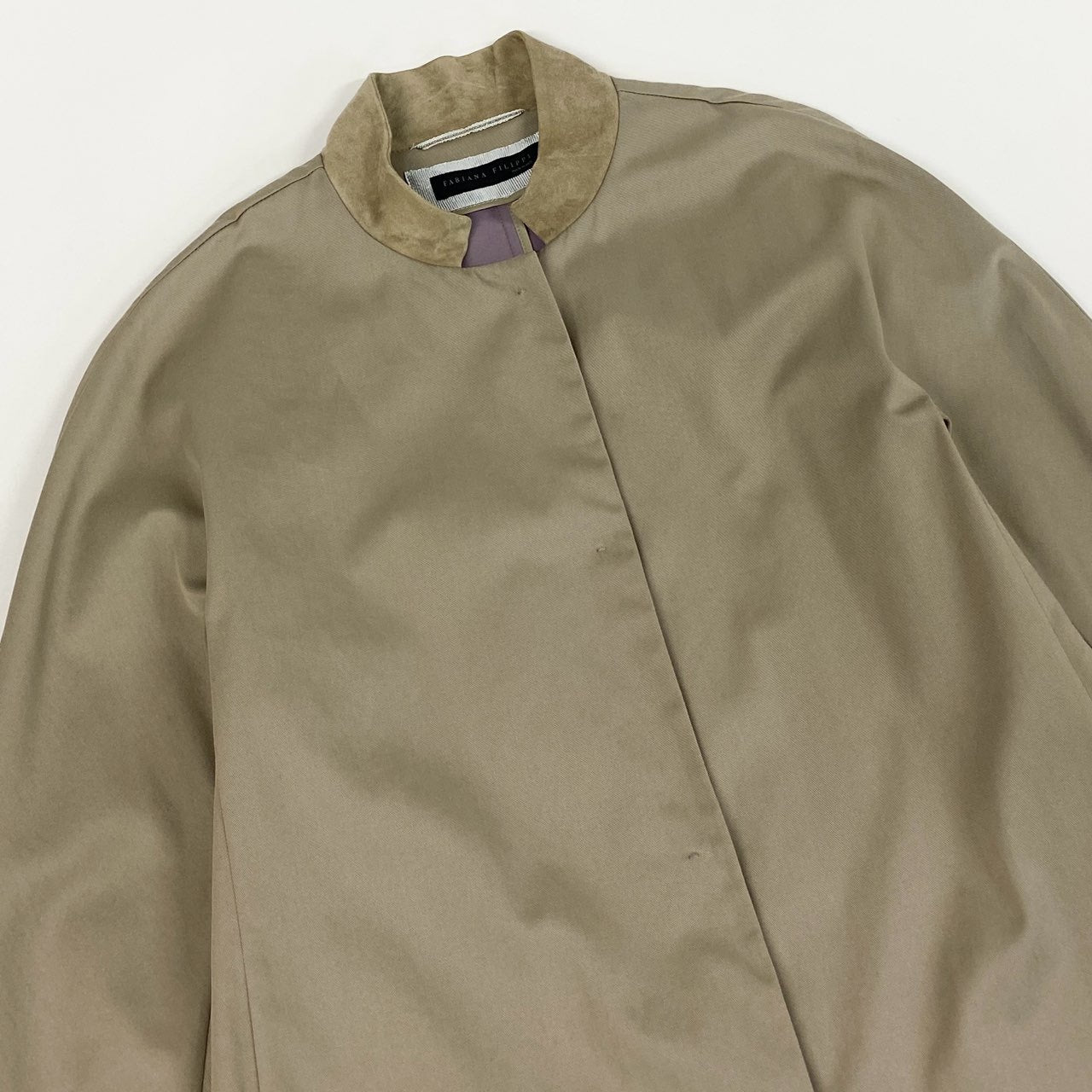 50b22 FABIANA FILIPPI ファビアナフィリッピ ステンカラーコート スプリングコート 薄手 ビーズ装飾 スエードレザー切替 レディース 女性服 XS ベージュu02t
