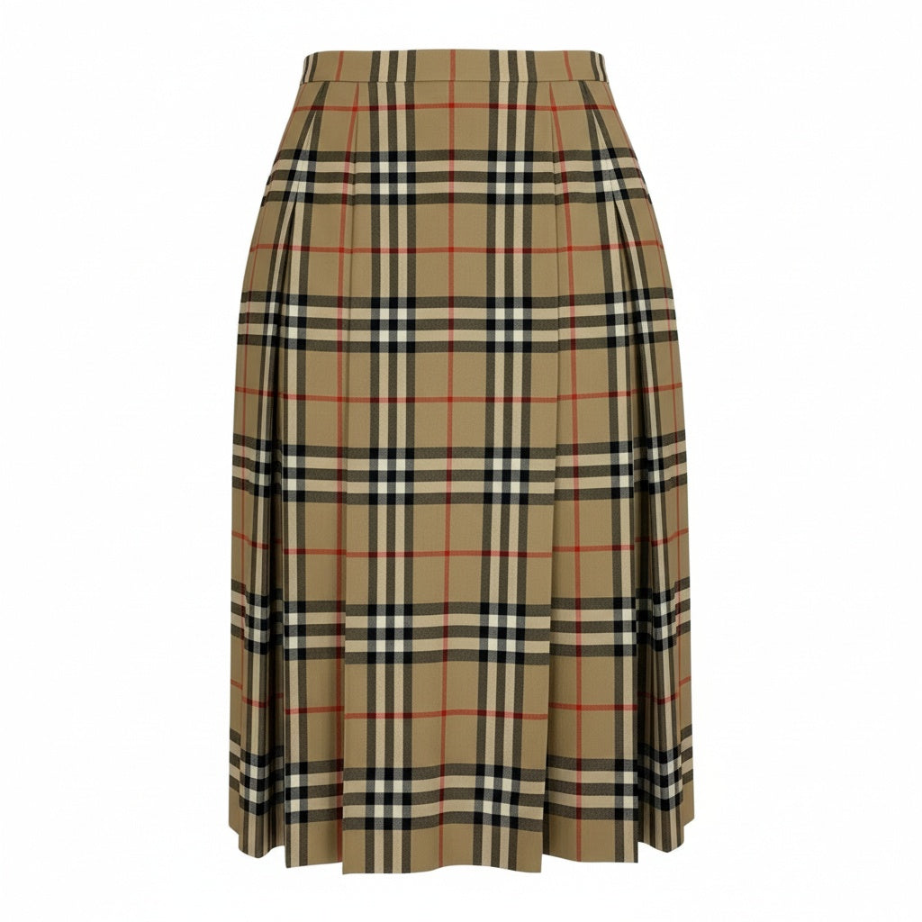 ベージュを基調にブラック・レッドラインを配したクラシックなチェック柄(ノバチェック)が印象的なバーバリーのフレアスカートです。ややハリ感のあるマットな素材が美しいドレープを生み、上品な立体感を演出。フロントタック入りで動きのあるシルエットが女性らしさを引き立てます。ジャケットと合わせたきれいめコーデから、ニット合わせの秋冬スタイルまで幅広く活躍する一着です。