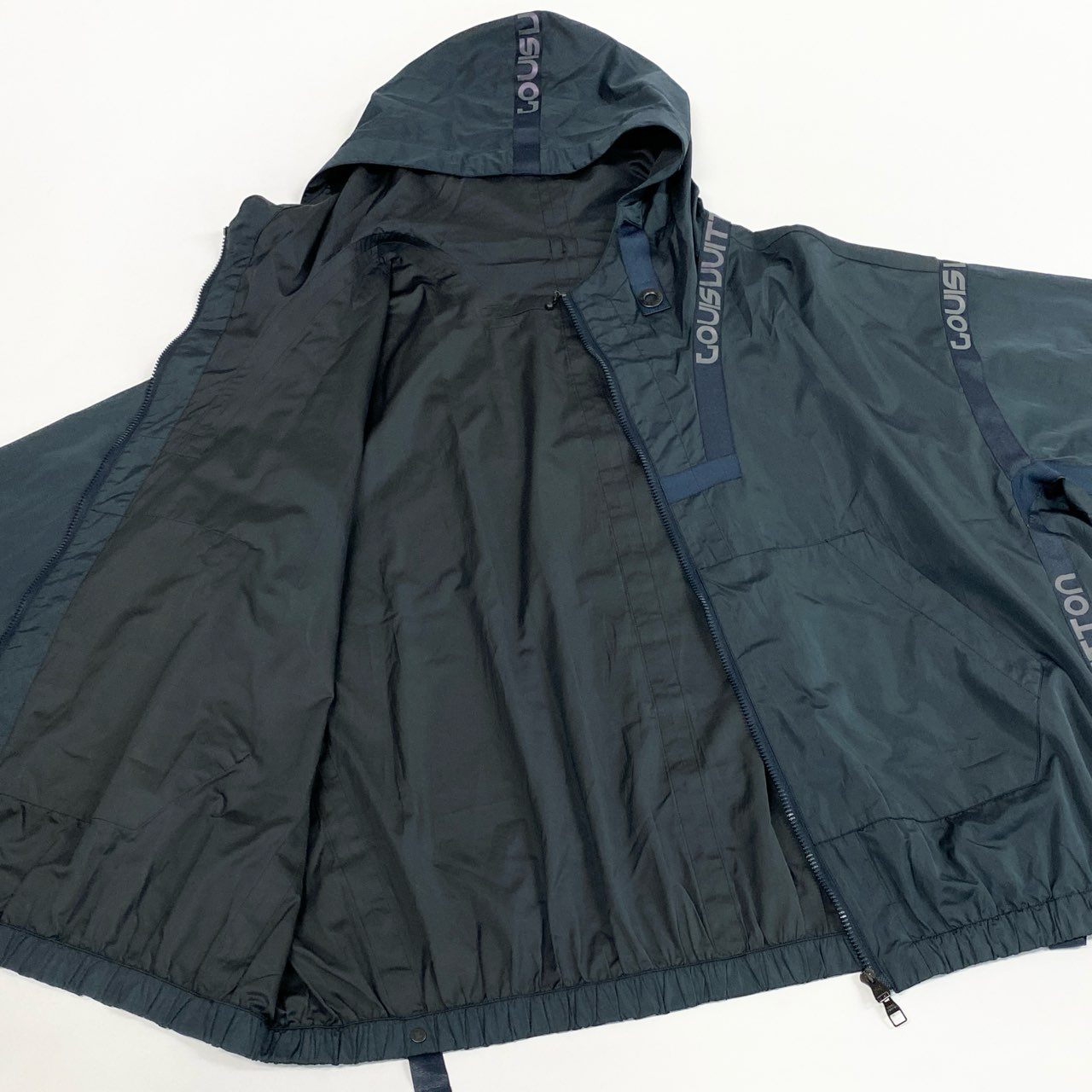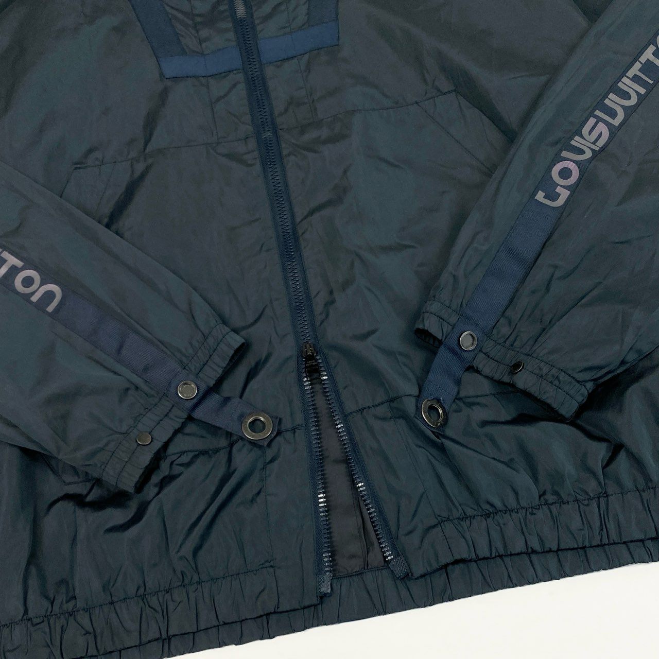 ルイヴィトンの2018SSコレクションより、テープロゴが映えるナイロンブルゾン。 ミッドナイトネイビーの落ち着いた色味に、ロゴディテールがアクセントとして映えます。 軽量ナイロン素材かつポケッタブル仕様で、携帯性・実用性ともに優秀。 タウンユースから旅行、ライトアウトドアまで幅広く活躍する一着です。