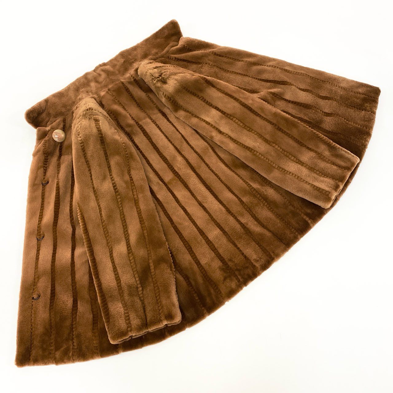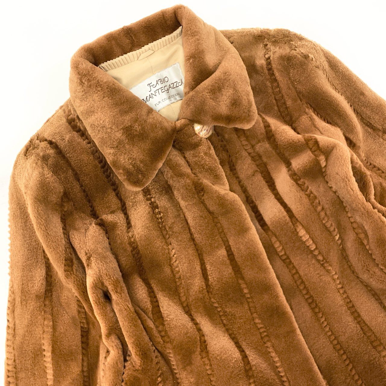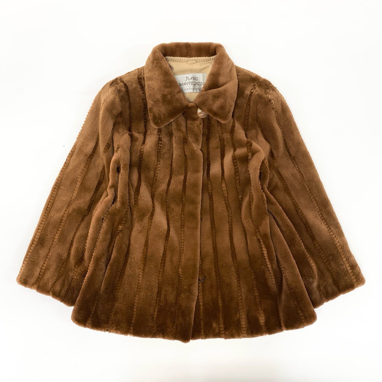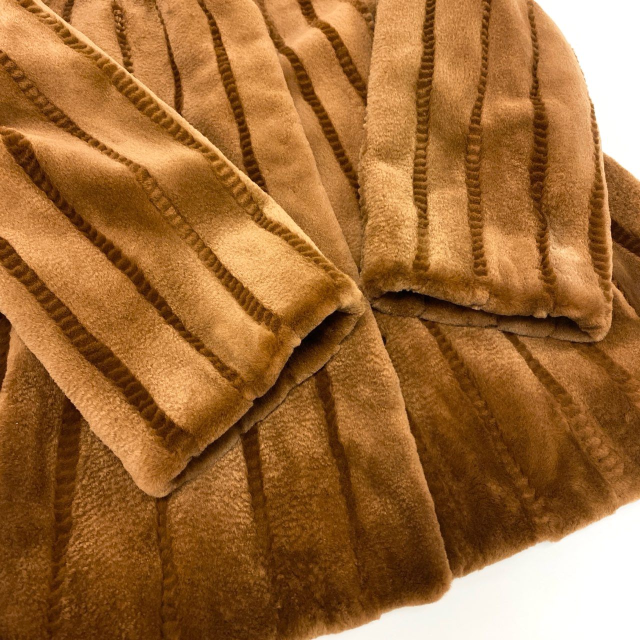 上質なシェアードミンクファーを使用した、SAGA MINKの銀サガラインによる高級毛皮コート。ウォームブラウン(キャメルブラウン)の染めカラーが柔らかな艶を引き立て、毛並みを整えたストライプ調の仕立てが上品な陰影を生み出します。軽やかで滑らかな肌触りに加え、広がりすぎないAラインシルエットがエレガント。秋冬の特別なお出かけやフォーマルシーンに最適な一着です。