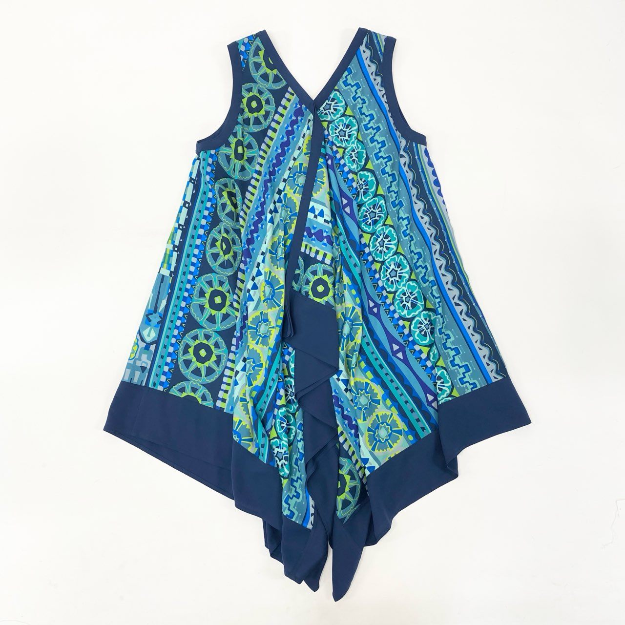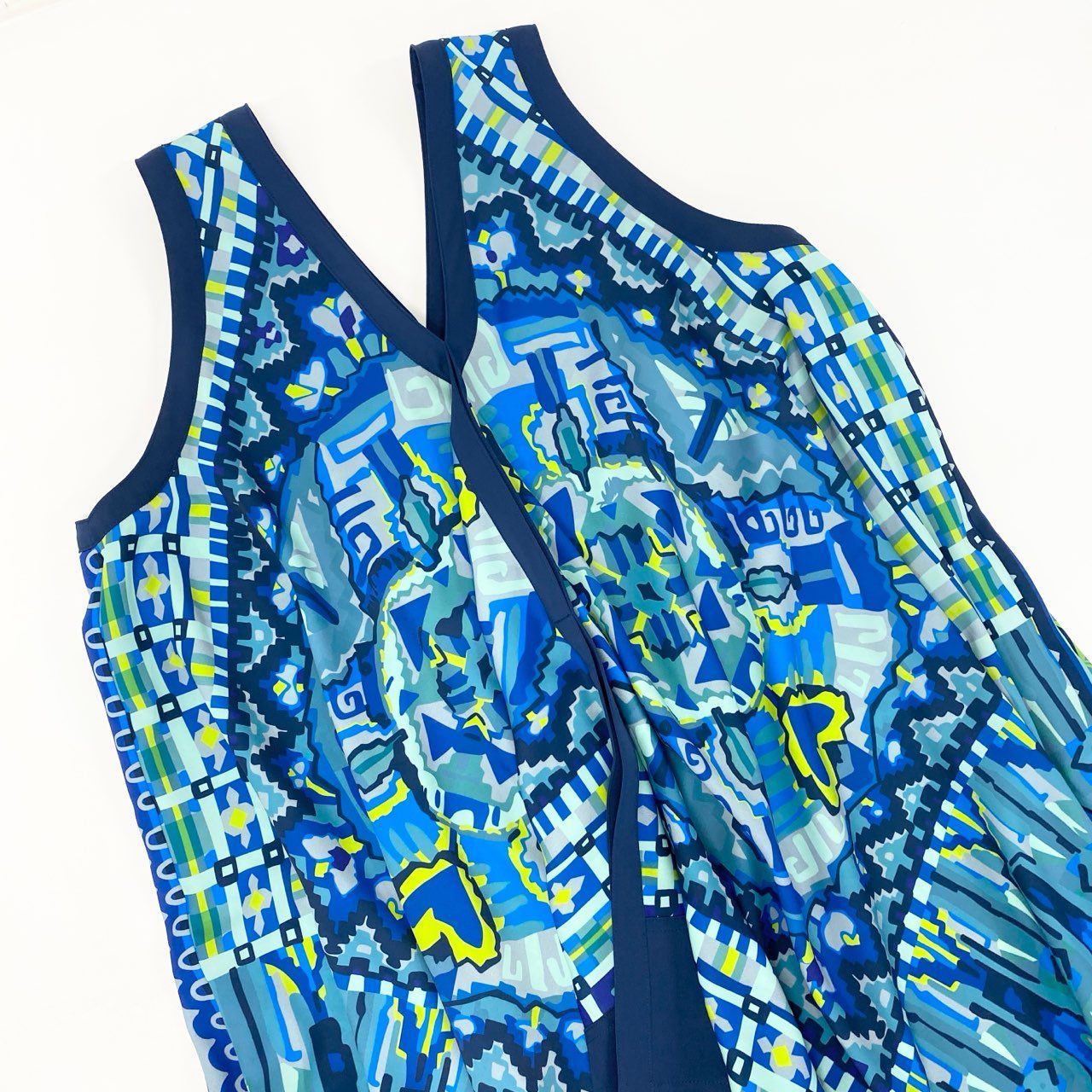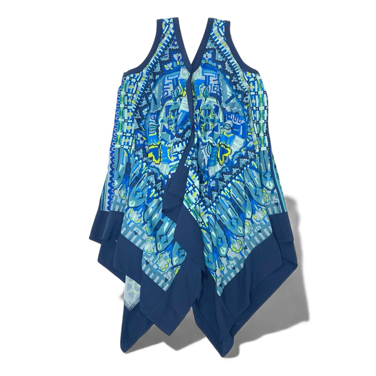 鮮やかなアクアブルー×ネイビーブルーを基調に、幻想的なアート柄プリントが広がるTOKUKO 1er VOLらしい個性的なワンピースです。軽やかなシフォン風素材で動くたびに揺れる裾が美しく、アシンメトリーなヘムラインが立体的なシルエットを演出。深めのVネックとゆったりとした身幅で、暑い季節でも快適に着られるストレスフリーなデザインです。リゾートシーンやお出かけ、アートイベントなど、華やかな場面にぴったりの一枚です。