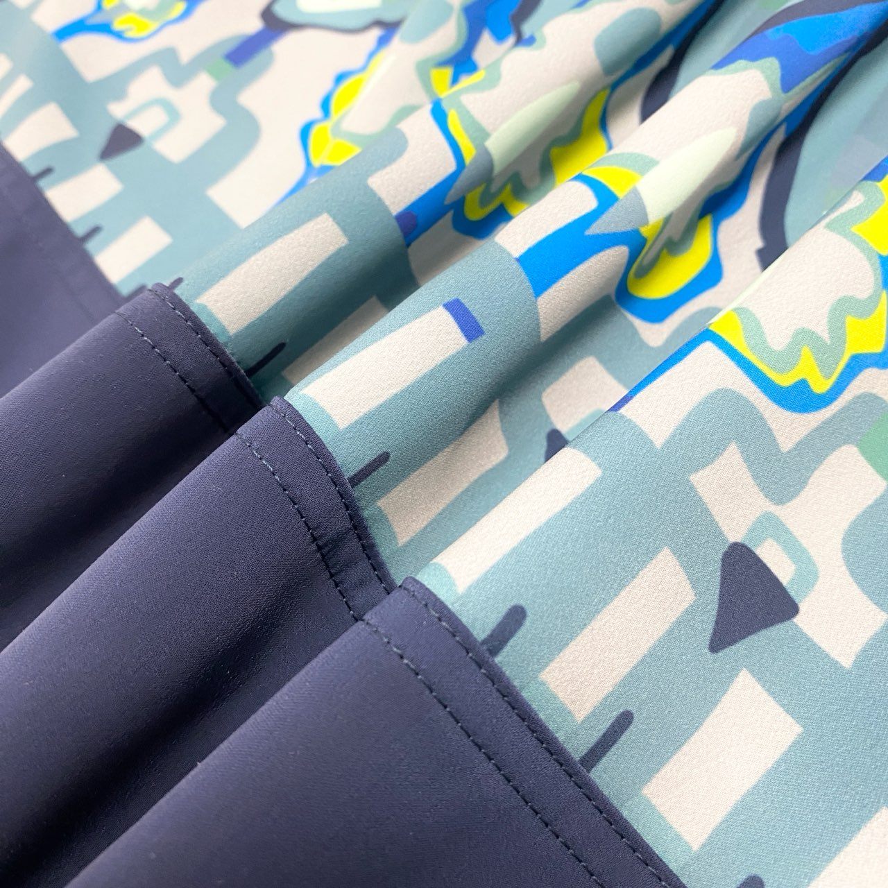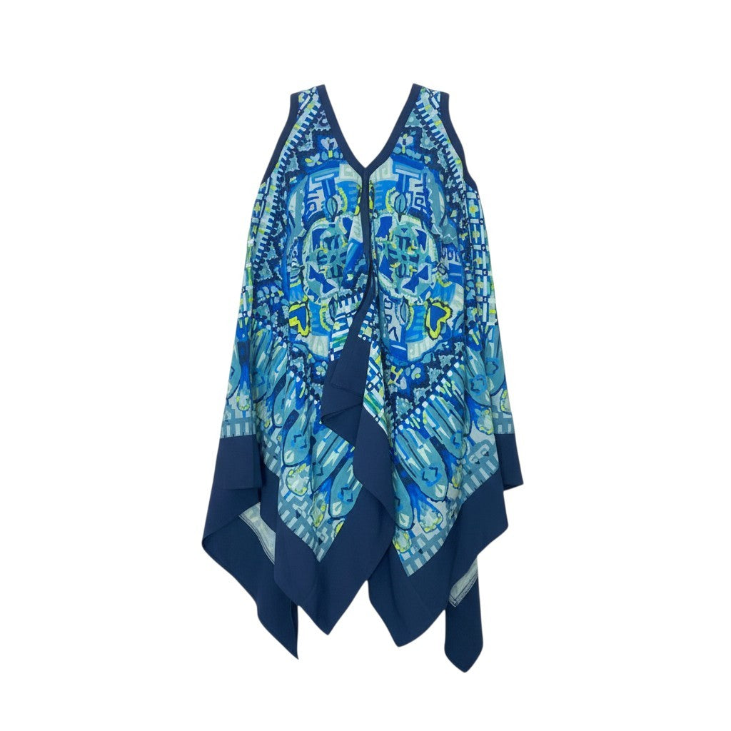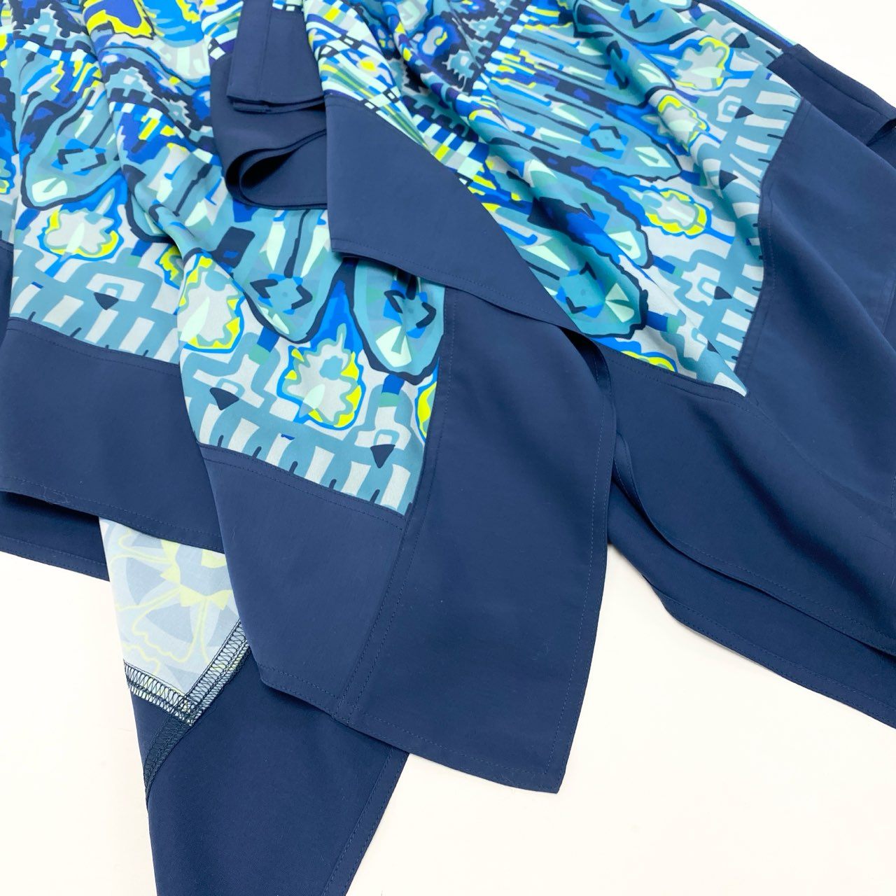 鮮やかなアクアブルー×ネイビーブルーを基調に、幻想的なアート柄プリントが広がるTOKUKO 1er VOLらしい個性的なワンピースです。軽やかなシフォン風素材で動くたびに揺れる裾が美しく、アシンメトリーなヘムラインが立体的なシルエットを演出。深めのVネックとゆったりとした身幅で、暑い季節でも快適に着られるストレスフリーなデザインです。リゾートシーンやお出かけ、アートイベントなど、華やかな場面にぴったりの一枚です。