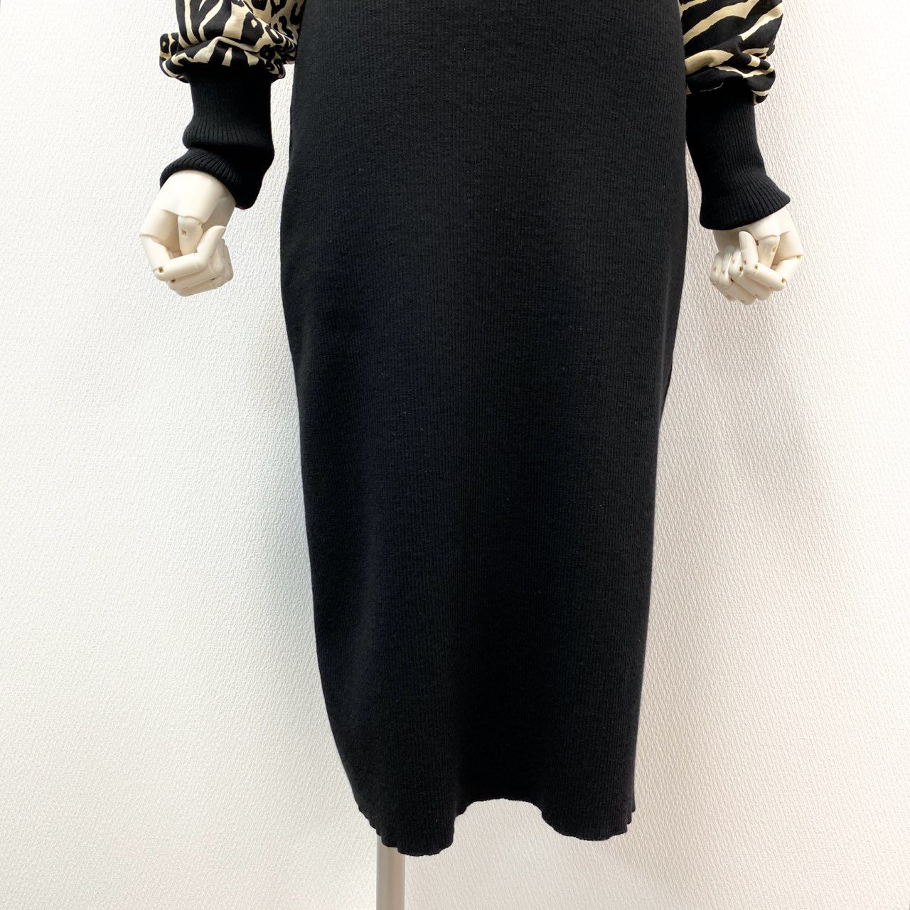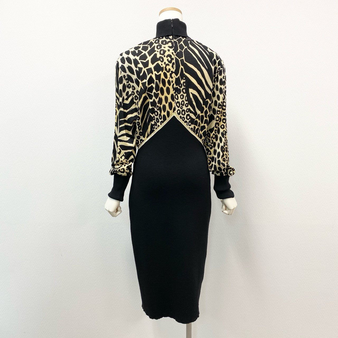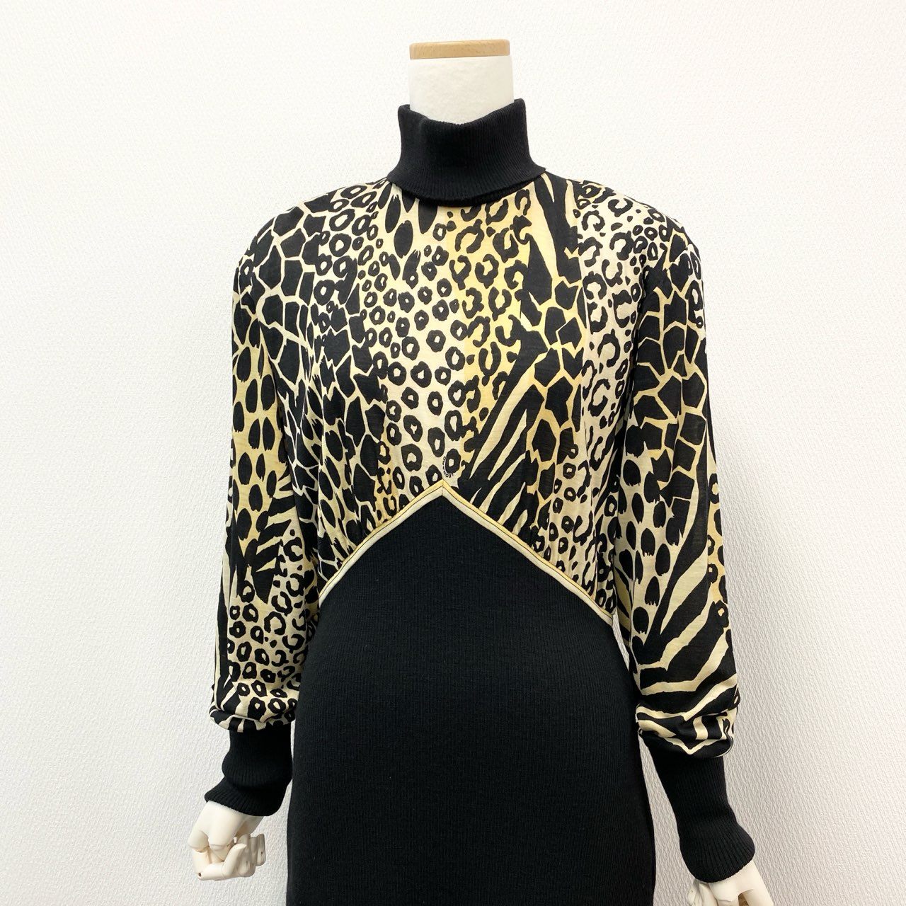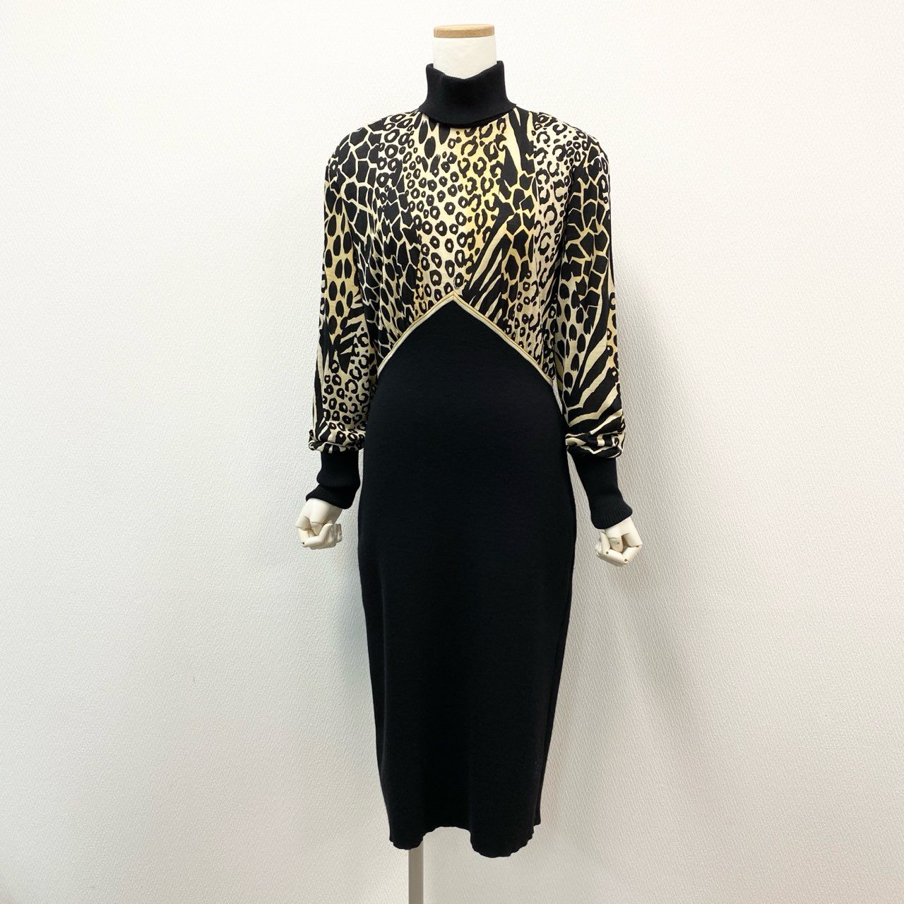 ブラックをベースに、ベージュ〜ゴールド系のアニマル柄を大胆に配したLEONARDのニットワンピース。異素材のコントラストが高級感を演出します。ハイネックとドルマンスリーブがモードな印象を与えつつ、ボディラインを美しく引き立てるデザイン。ディナーシーンやパーティーなど、華やかな場にふさわしい一着です。