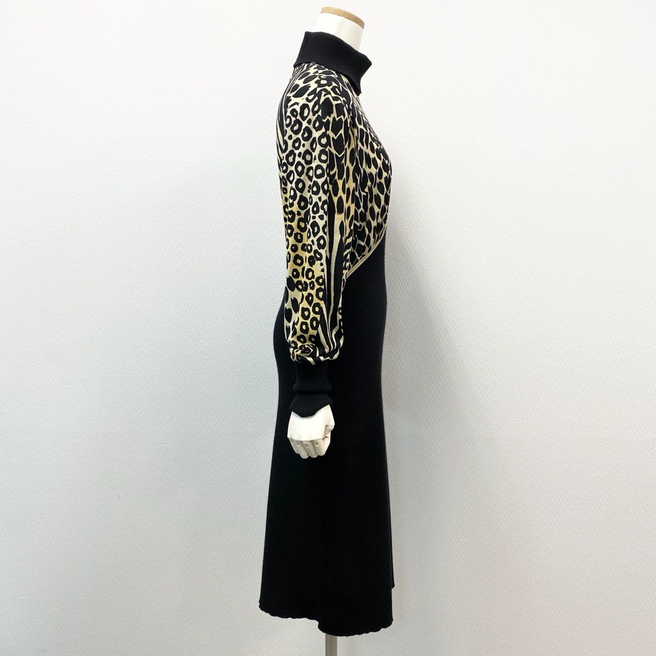 59k1 LEONARD レオナール イタリア製 レオパード柄 長袖 ハイネック ニットワンピース ドレス ブラック ウール シルク レディースo07t