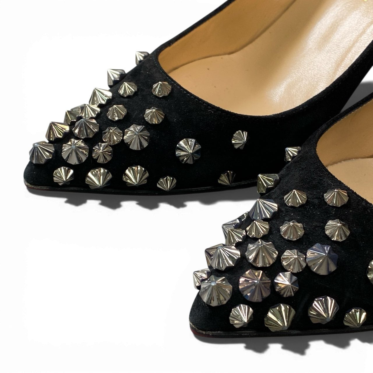 ブラックのスエード素材に、シルバースタッズが大胆にあしらわれたChristian Louboutinのピンヒールパンプスです。 毛足のあるマットなスエードが上品さを演出し、シャープなポインテッドトゥが脚元を美しく見せます。 トゥ部分に集約されたメタルスタッズが、エッジの効いたラグジュアリー感をプラス。 ドレスアップした夜のお出かけやパーティーシーンで、コーディネートの主役になる一足です。