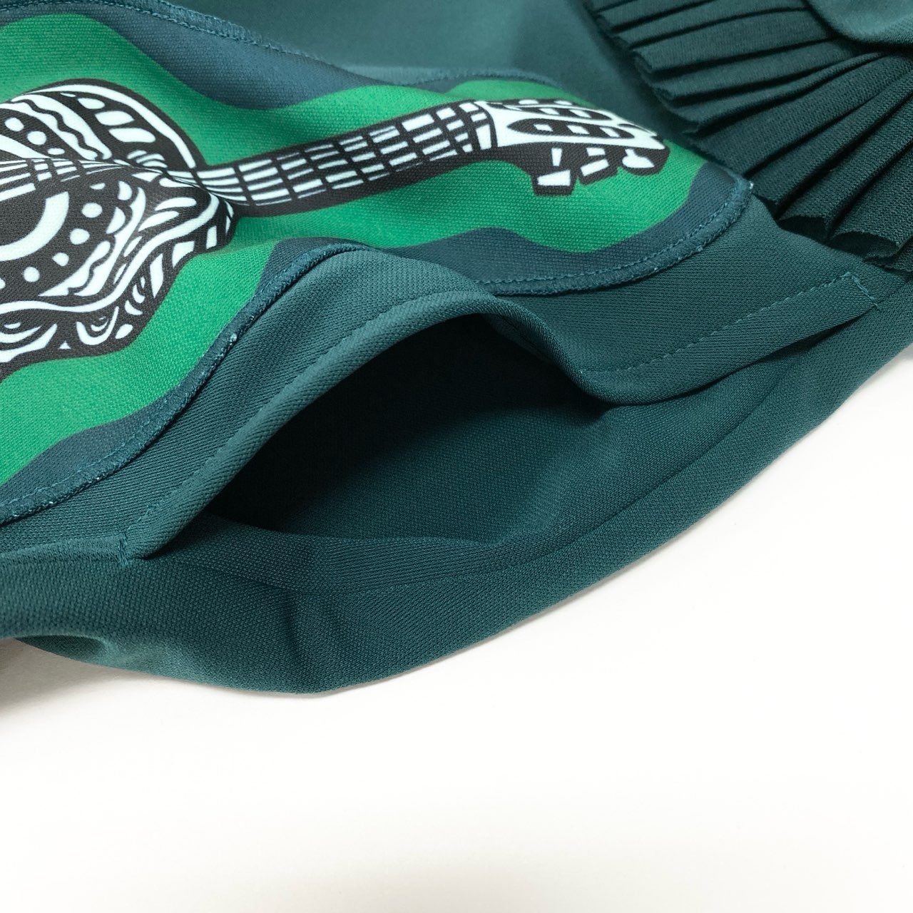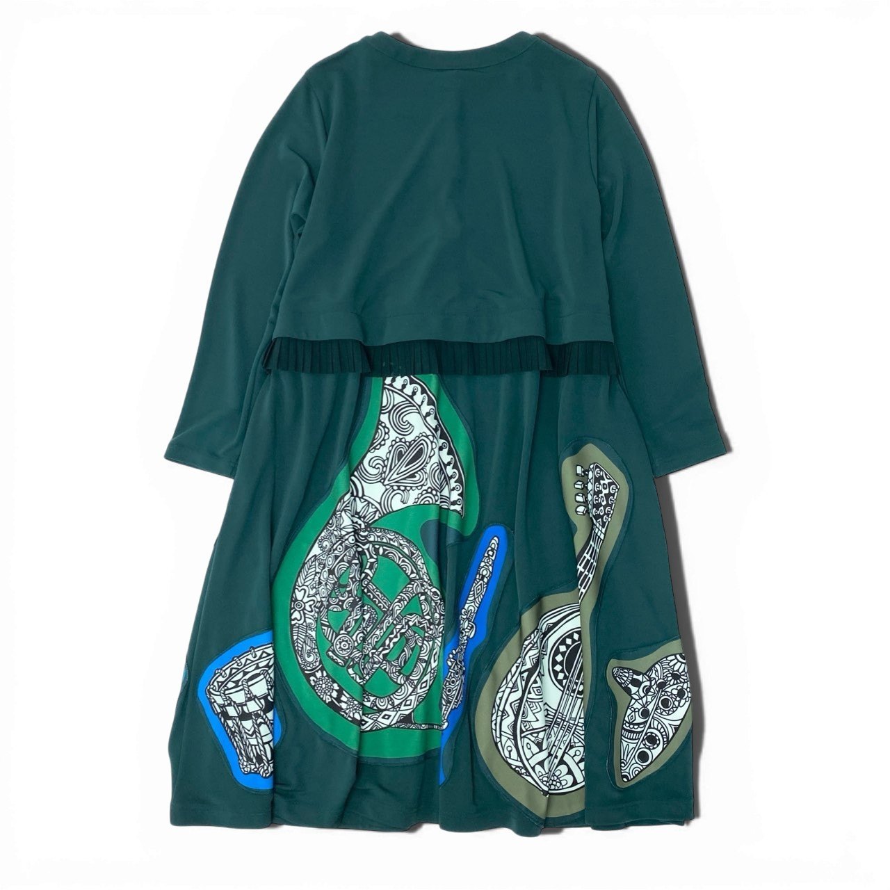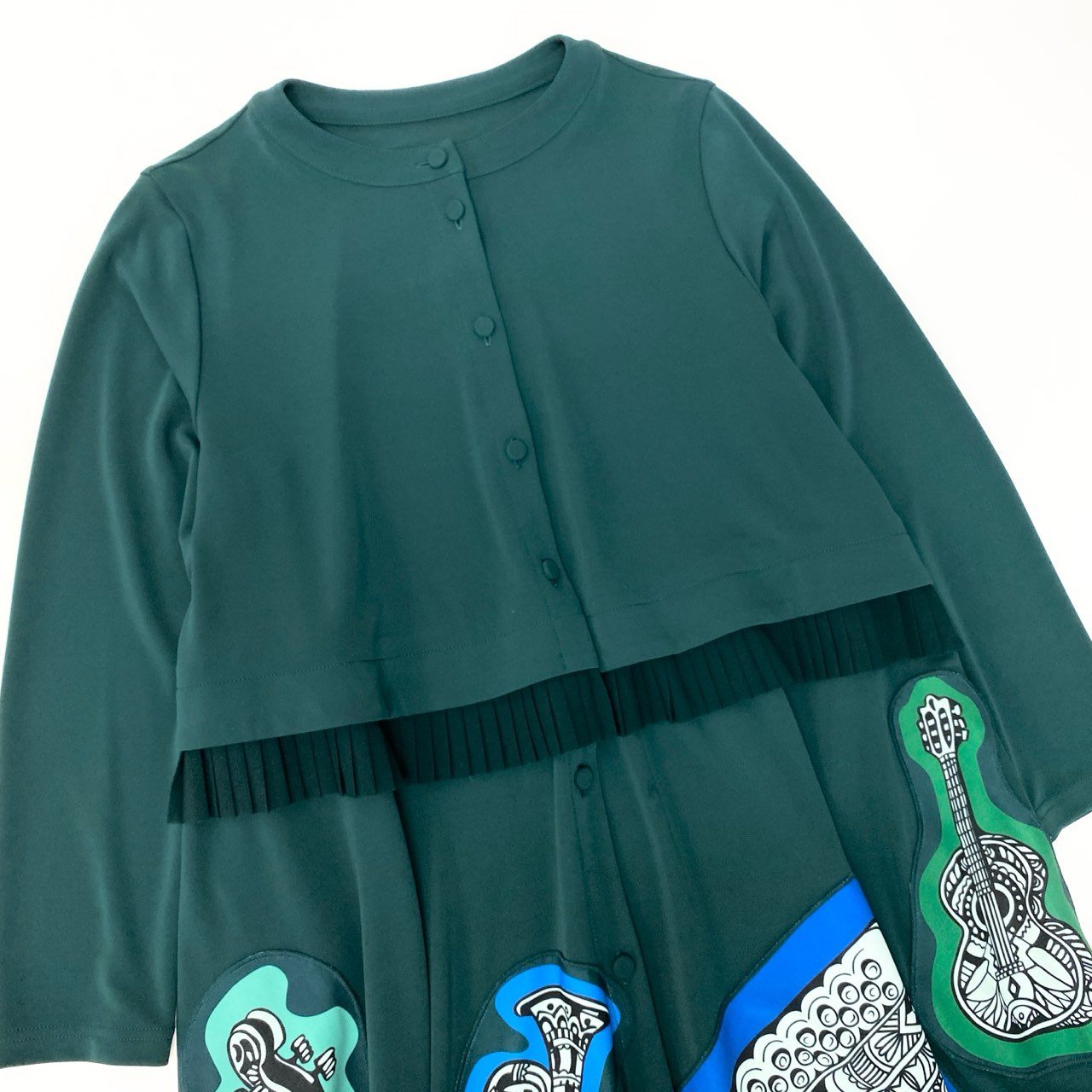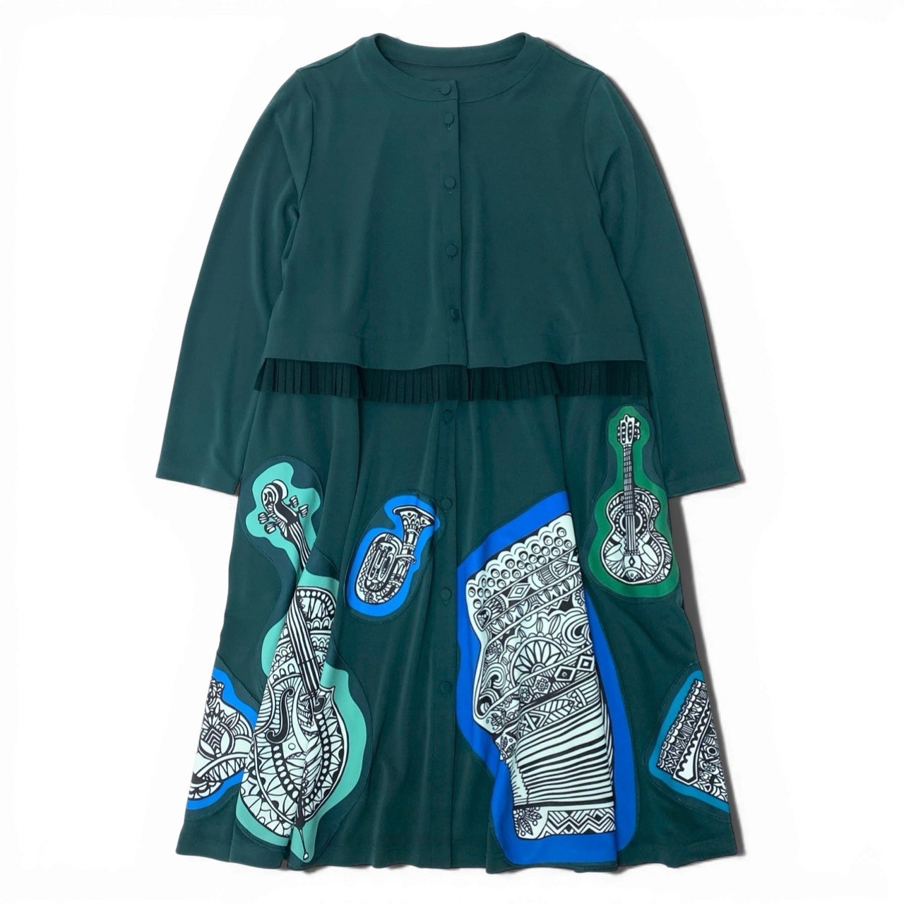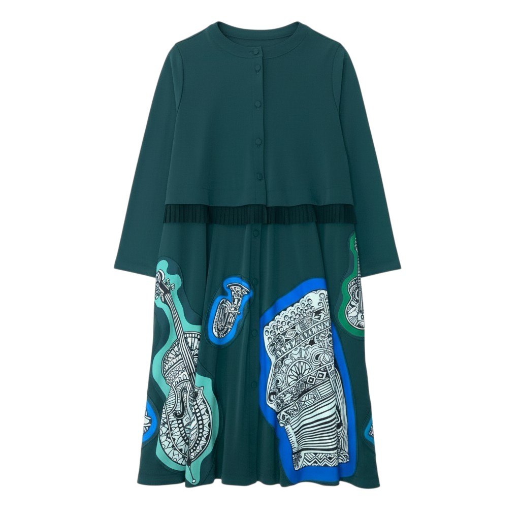 深みのあるダークグリーン(フォレストグリーン)をベースに、ブルーやミントグリーンの縁取りで楽器モチーフを配したアーティスティックなデザイン。ギターやホルンなどの楽器柄が大胆に描かれた総柄プリントです。 マットでなめらかなストレッチ素材を使用し、動きやすく快適な着心地。ウエスト部分にはプリーツ切替が施され、自然なフレアラインを演出します。 フロントボタン仕様で羽織としても着用可能なロングシャツワンピース。 一枚で存在感があり、コンサートやお出かけ、旅行など個性を活かしたコーディネートにおすすめの一着です。