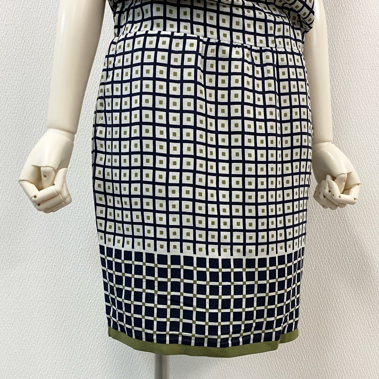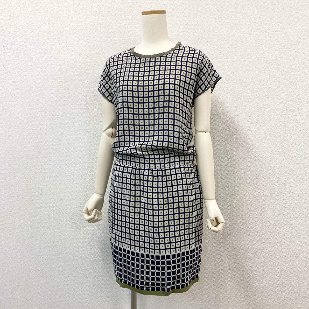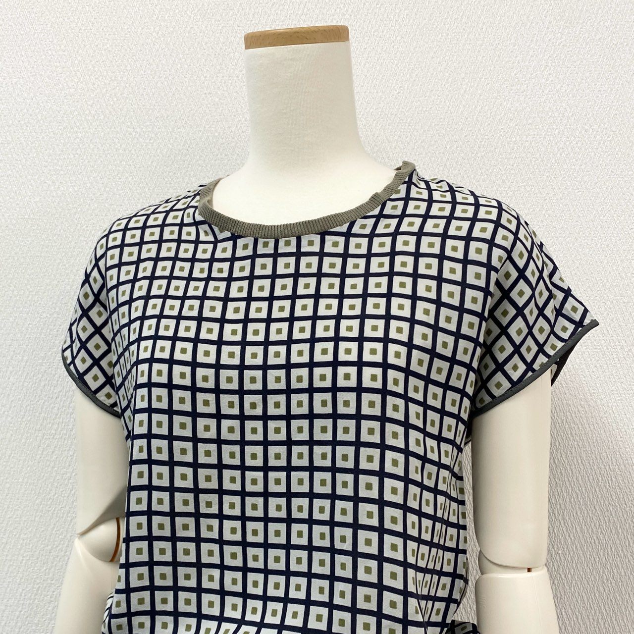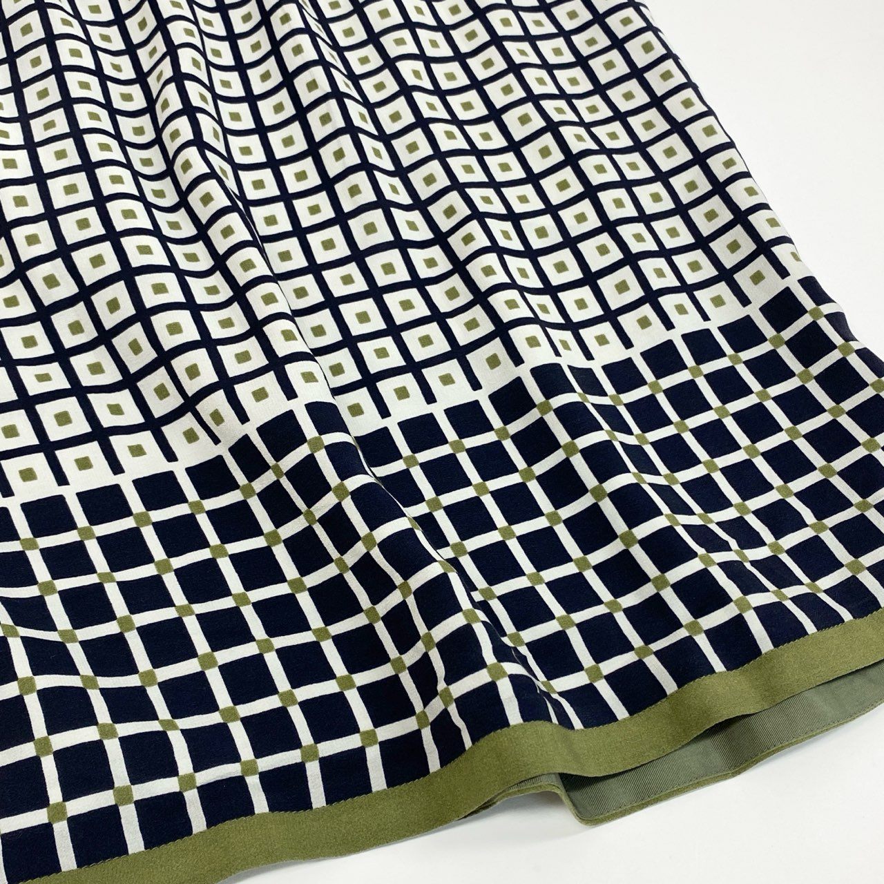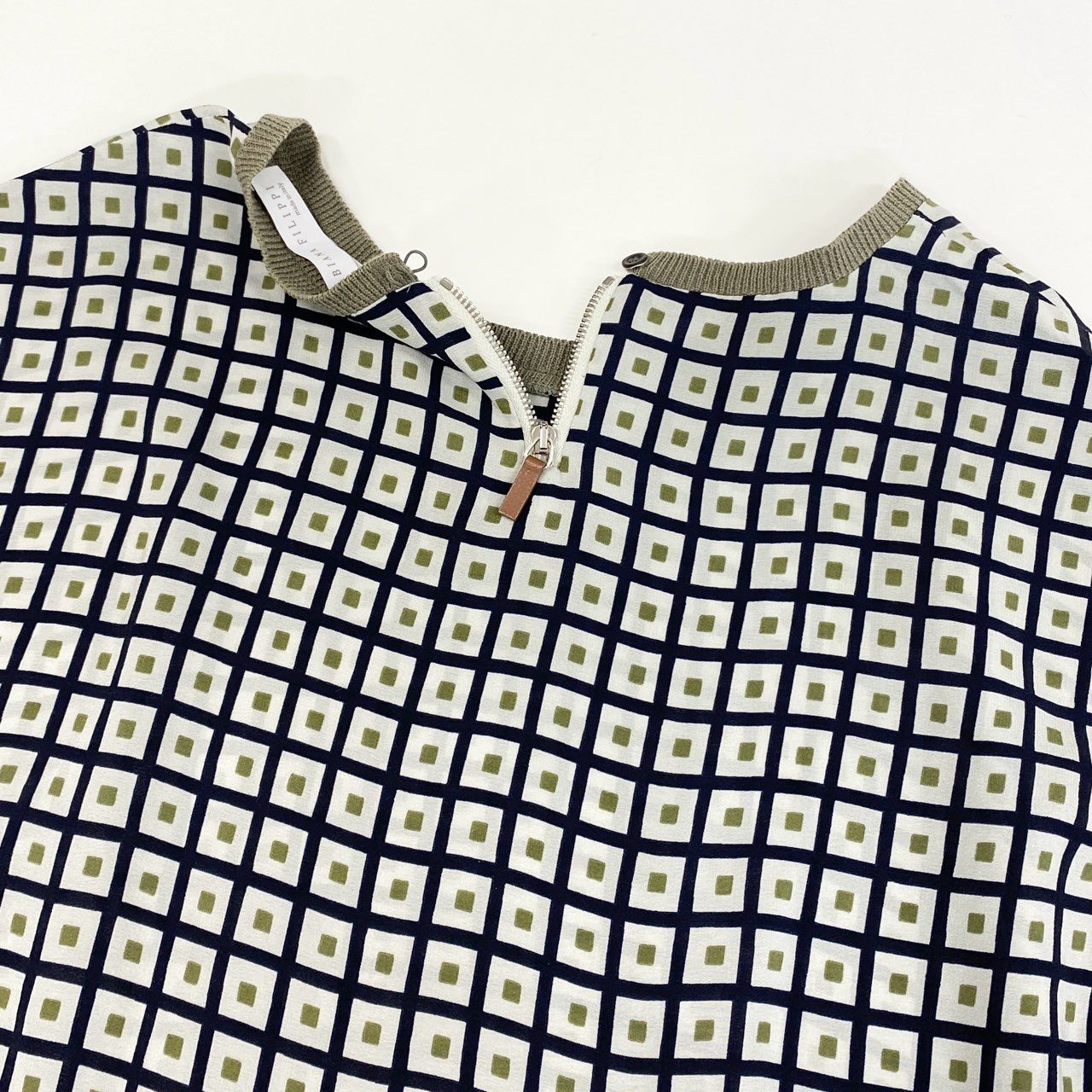 ファビアナフィリッピらしい上品さを感じる、ネイビー×ホワイトの幾何学柄ワンピースです。細かいスクエアパターンが全体に配され、裾には濃紺とカーキグリーンのラインがアクセント。マットな光沢を持つシルク素材が肌に滑らかに沿い、動くたびに軽やかなドレープを演出します。リブ仕様のネックがカジュアルさを添え、ジャケットやカーディガンとのレイヤードにも最適。オフィススタイルからディナーシーンまで、幅広く活躍する一着です。