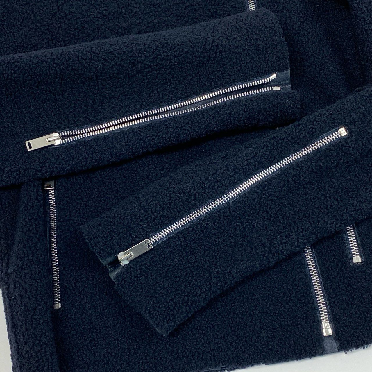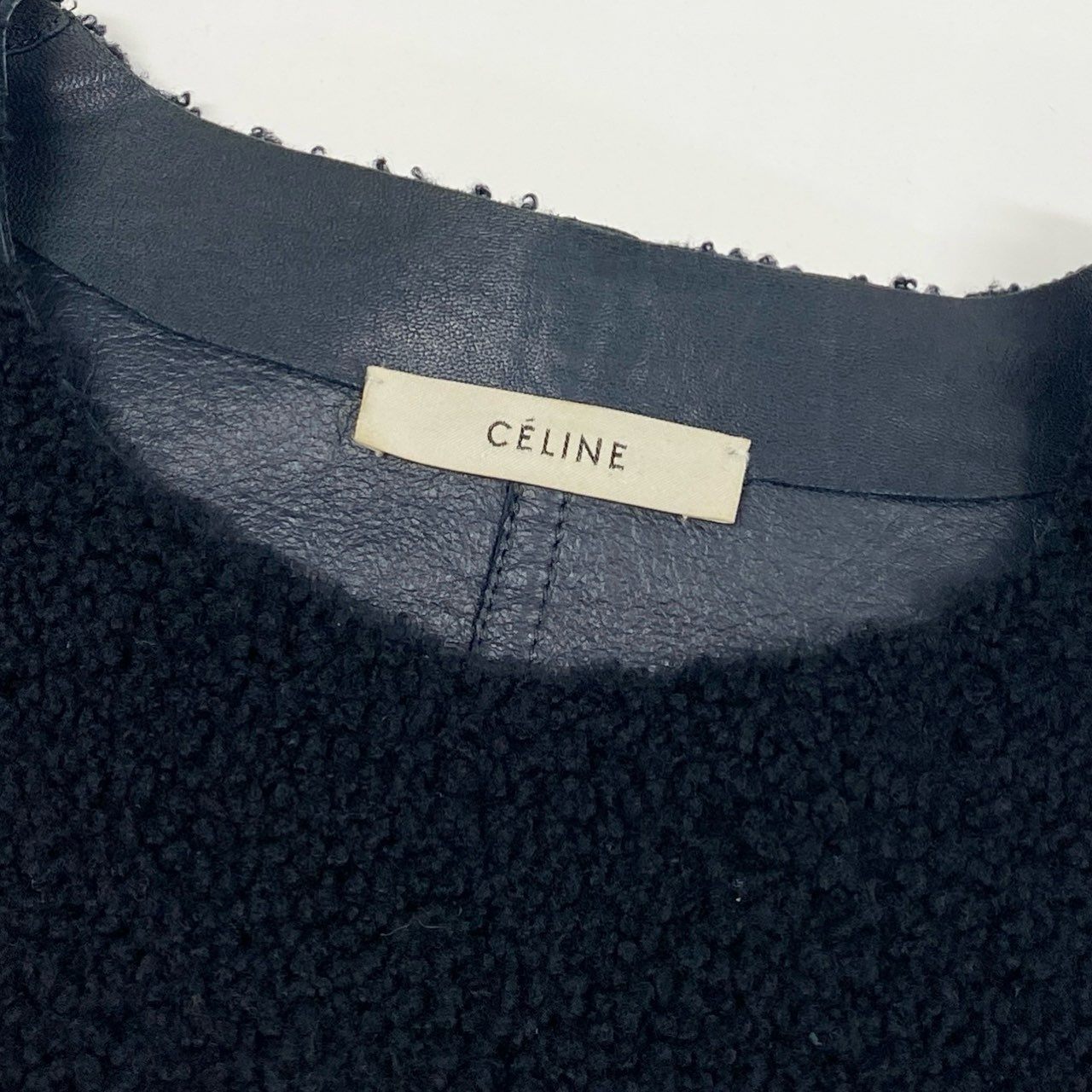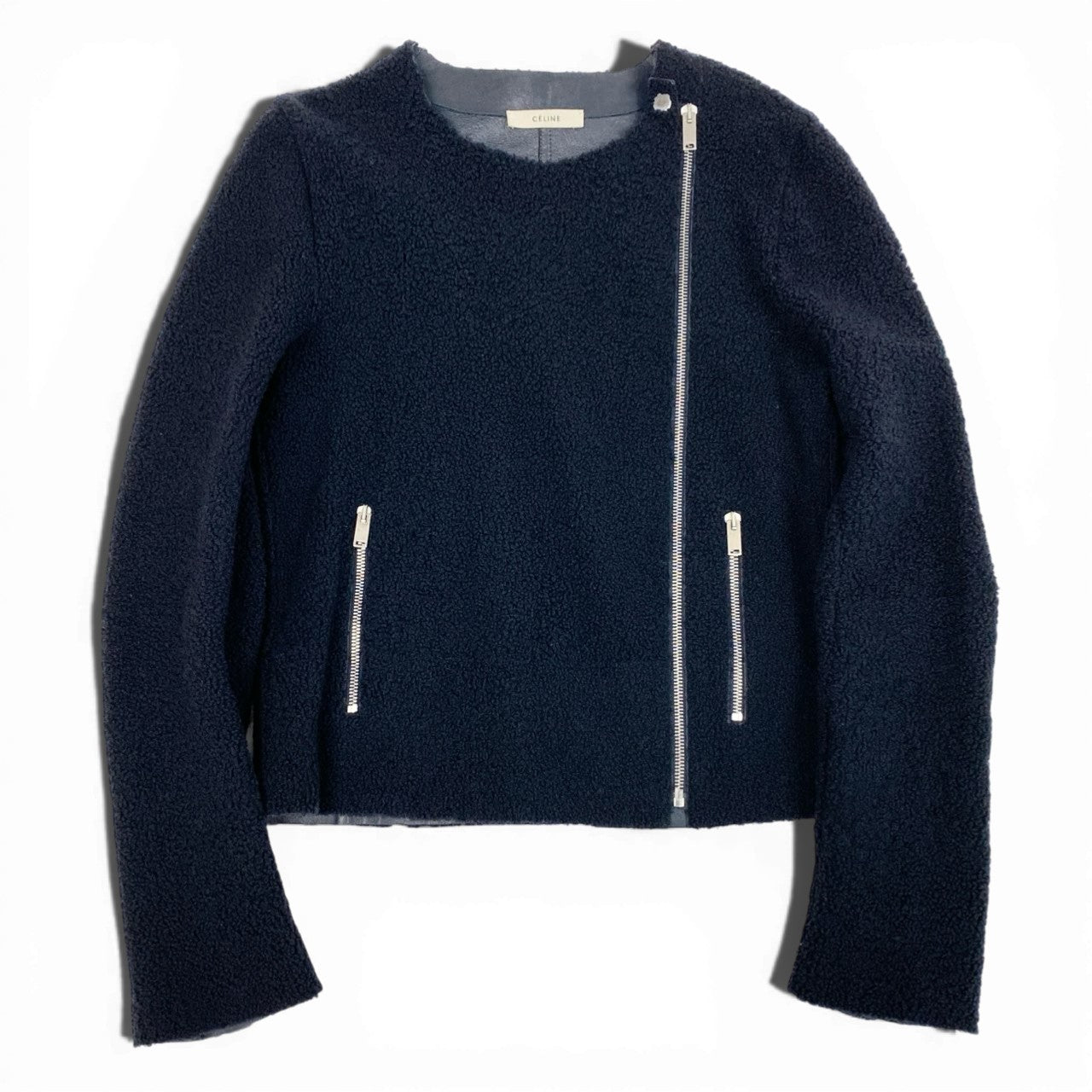 セリーヌのミッドナイトネイビーのラムレザーライダースジャケットです。毛足のあるボア風素材で、無地デザインながら立体感のある表情が魅力です。シルバージップ仕様のアシンメトリーフロントとポケットディテールがモードな印象を演出します。コンパクトなシルエットで、ワンピースやハイウエストボトムスと好相性な一着です。