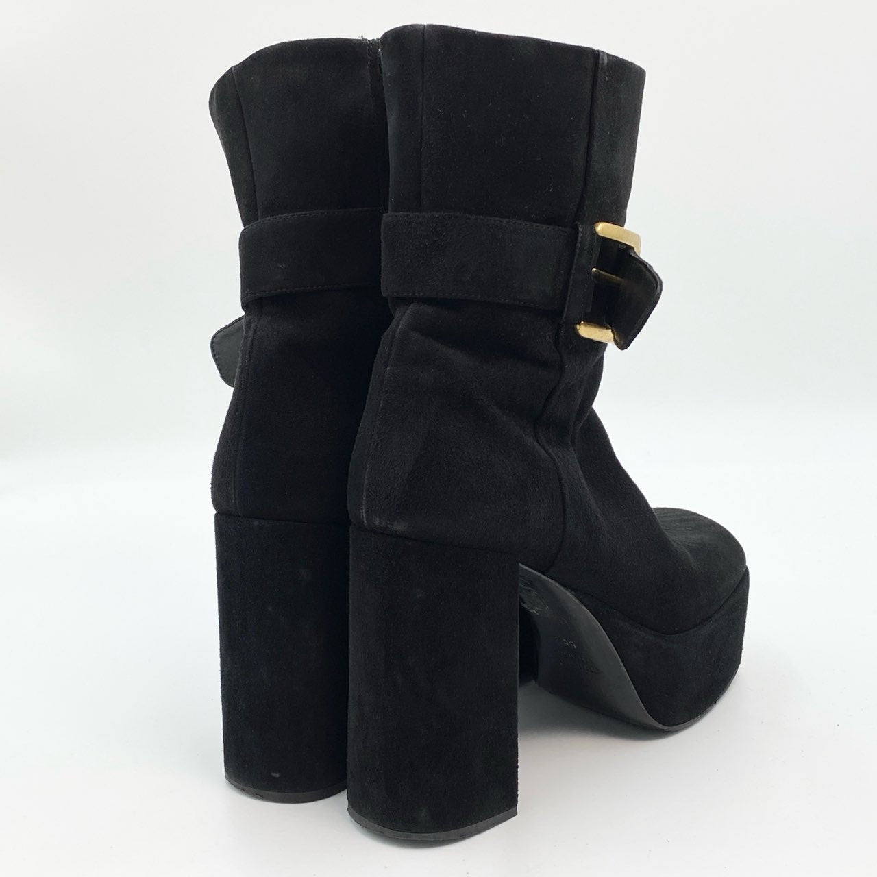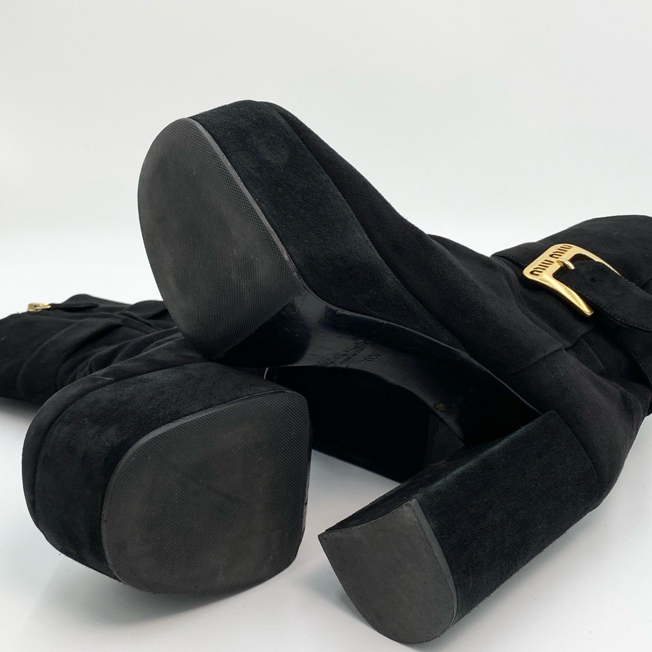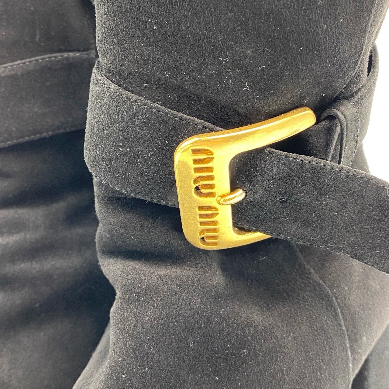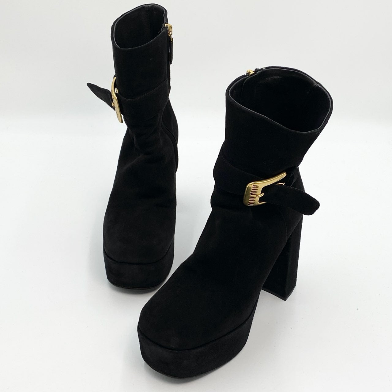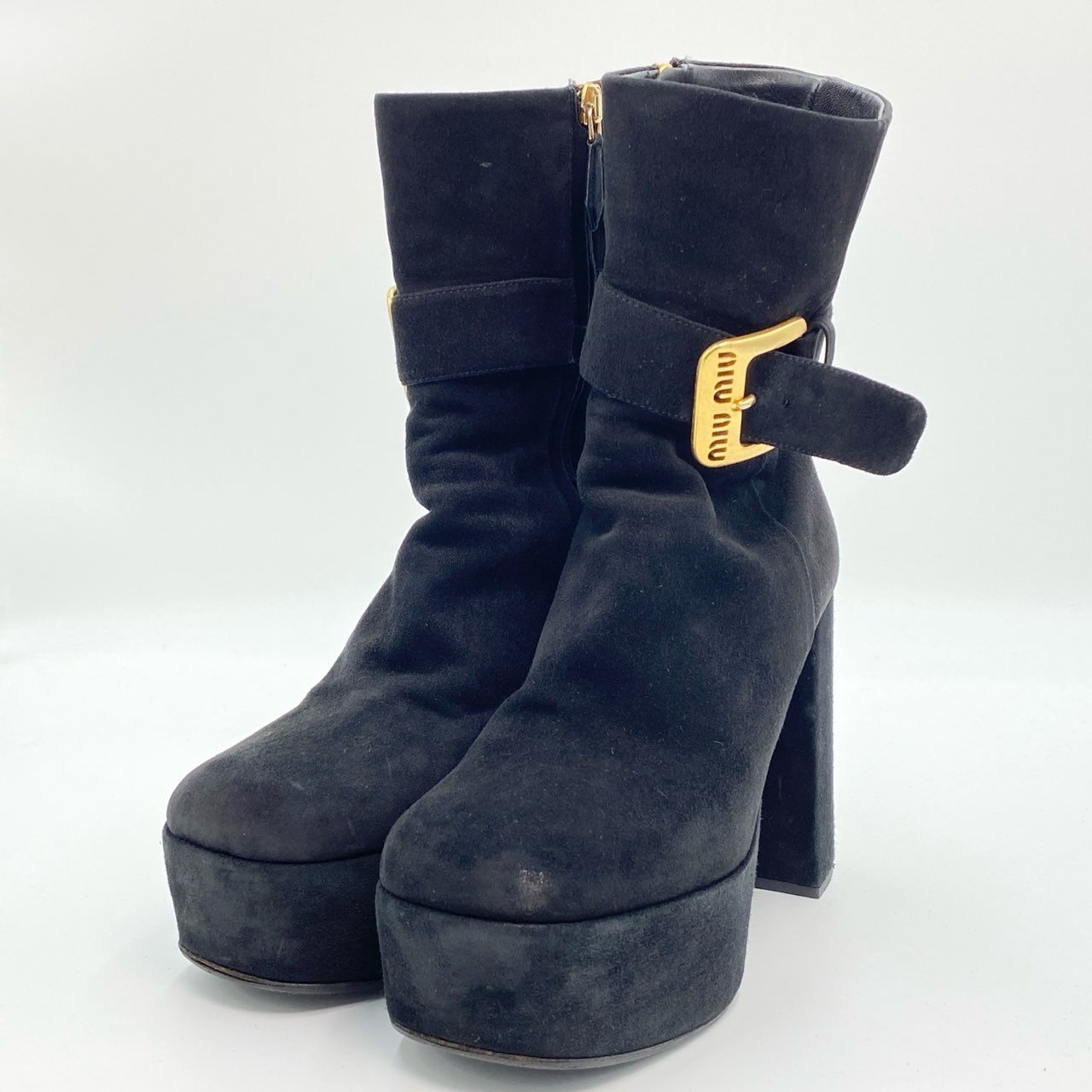 3i30 miu miu ミュウミュウ ロゴバックル ヒールブーツ ショートブーツ サイズ36.5 ブラック スエード レディースk02i