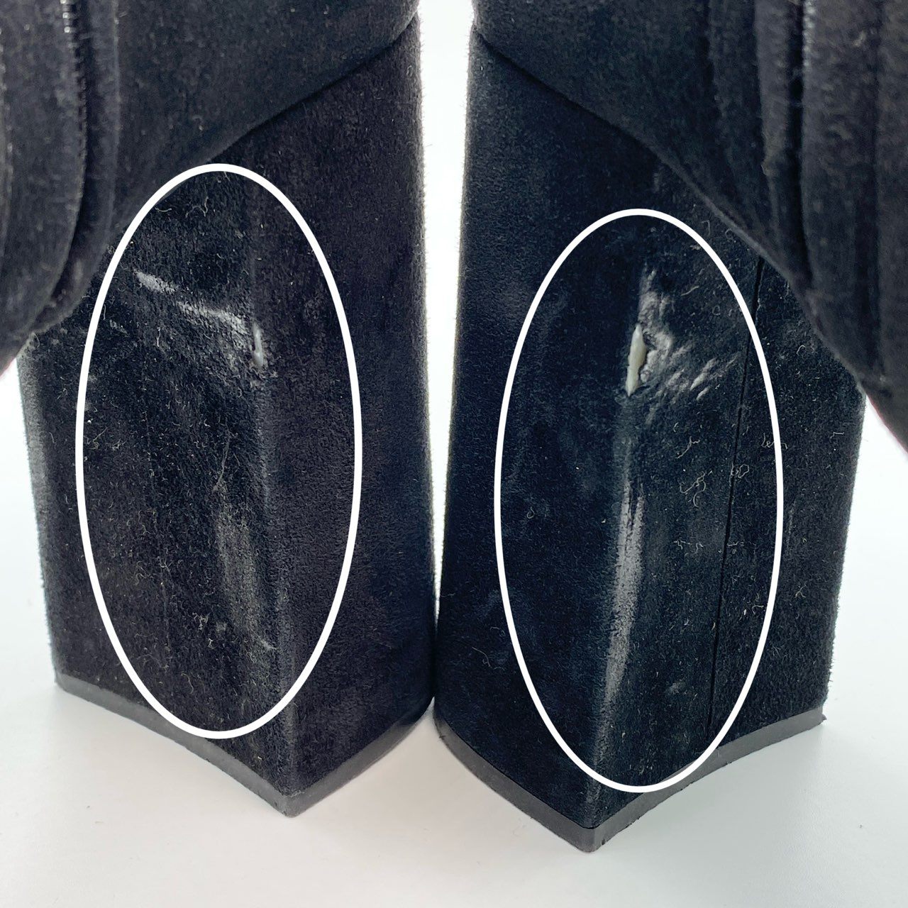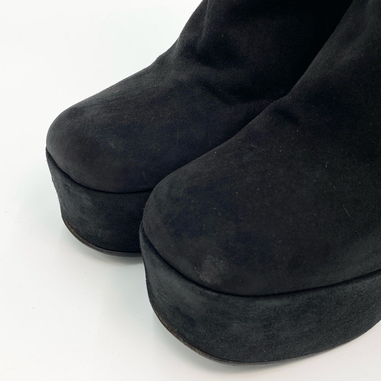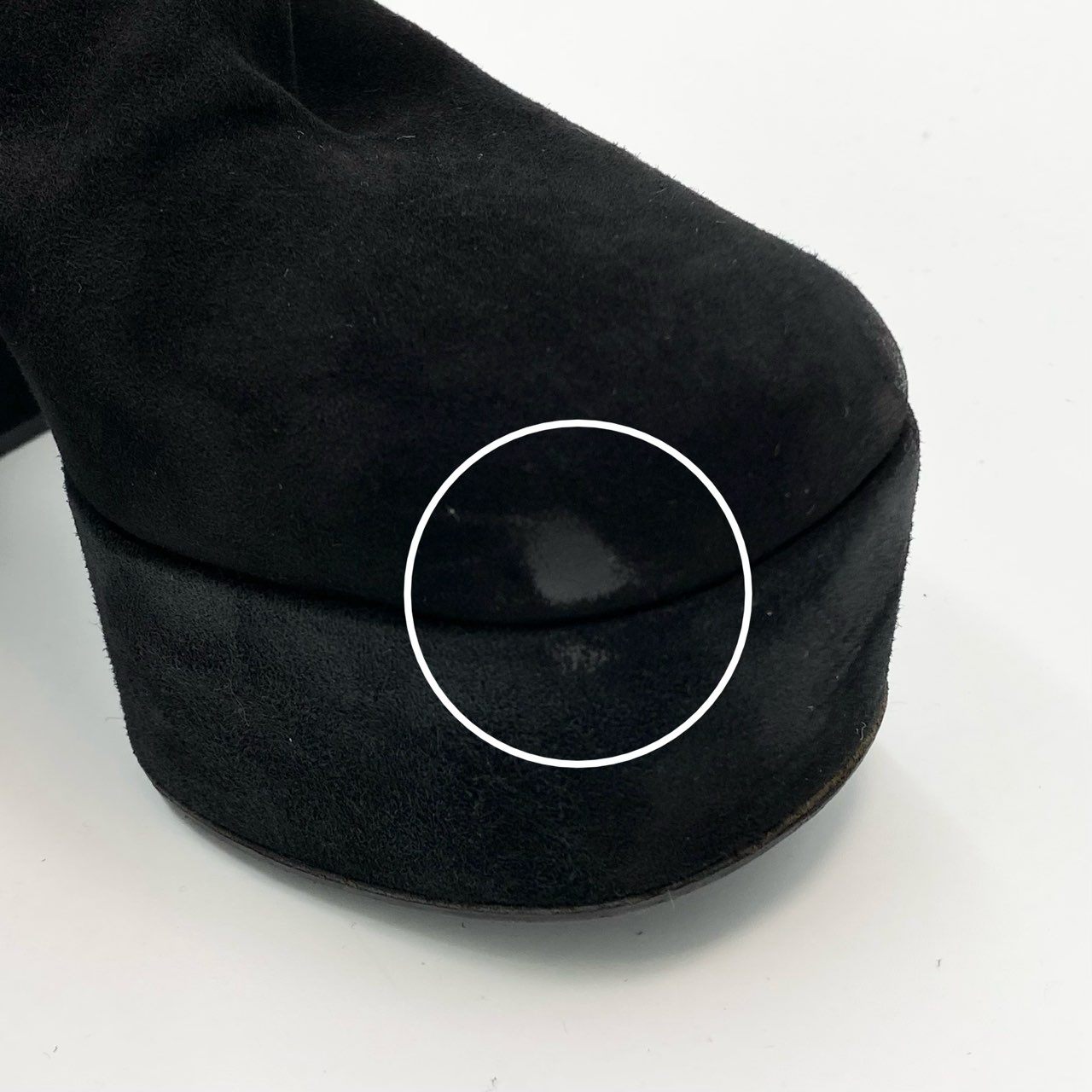 miumiuのブラックスエードヒールブーツ。毛足の短いスエード素材が上品な雰囲気を演出し、サイドにあしらわれたゴールドの「miumiu」ロゴバックルが華やかさをプラスしています。11cmのチャンキーヒールと厚めのプラットフォームがスタイルアップを叶えながら安定感も兼備。シンプルながら存在感のあるデザインで、デイリースタイルからパーティーシーンまで幅広く活躍するアイテムです。