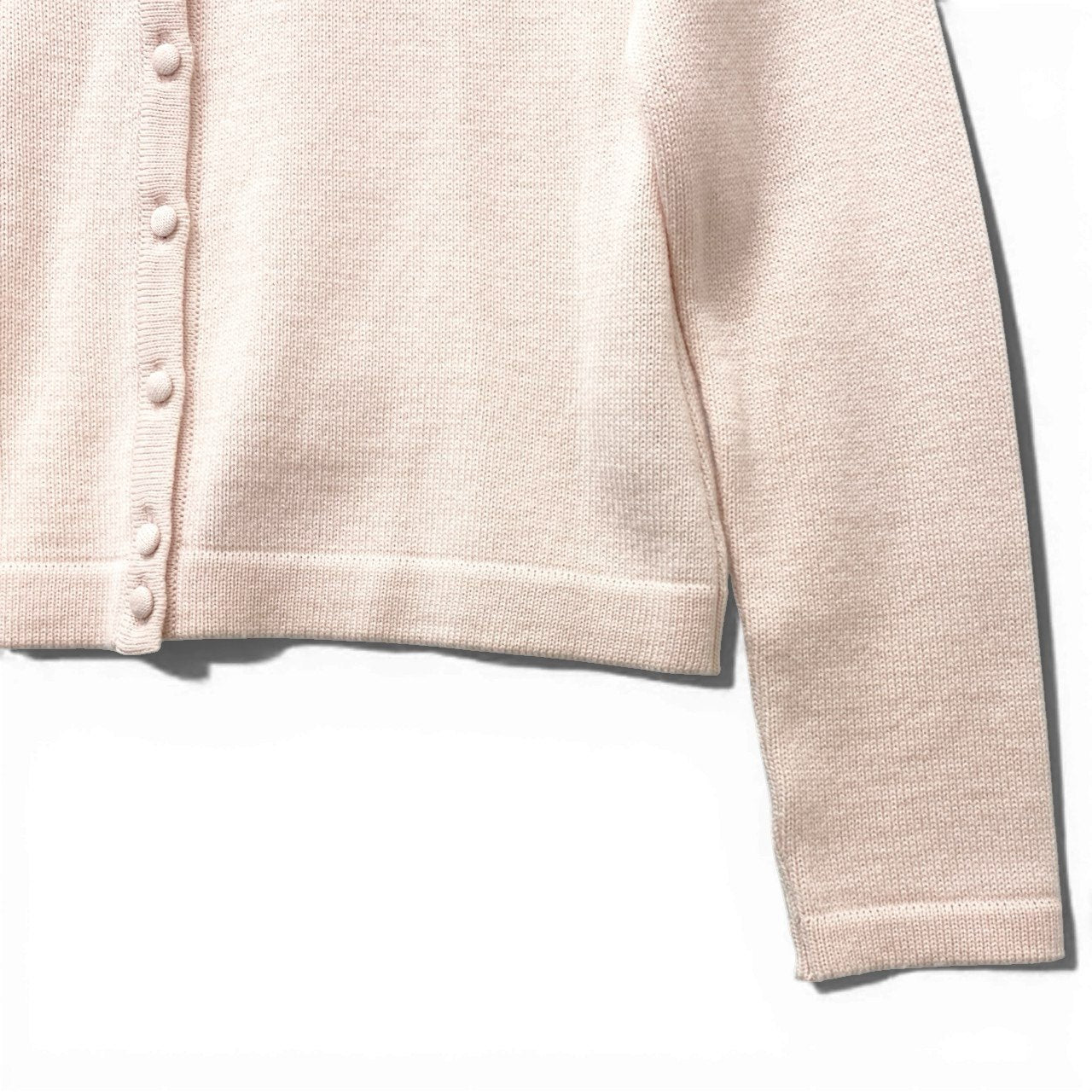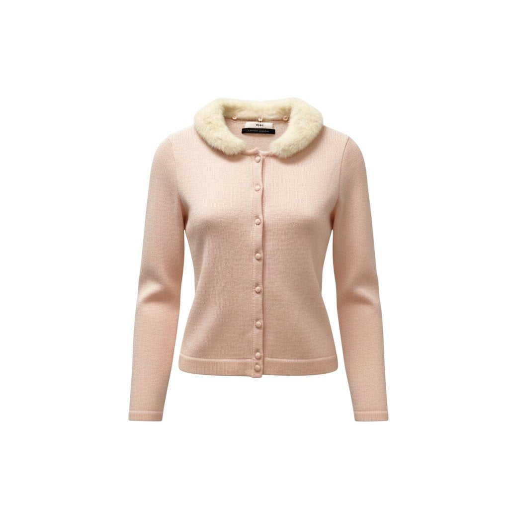 やさしいベビーピンクが上品な印象のニットカーディガンです。しなやかでマットなウール100%素材に、毛足のあるアイボリーミンクファー襟が華やかさを添えます(取り外し可)。フロントは共布くるみボタン仕様で、フェミニンかつクラシカルなデザイン。スカートにもワンピースにも好相性で、デイリーからフォーマルシーンまで幅広く活躍する一着です。