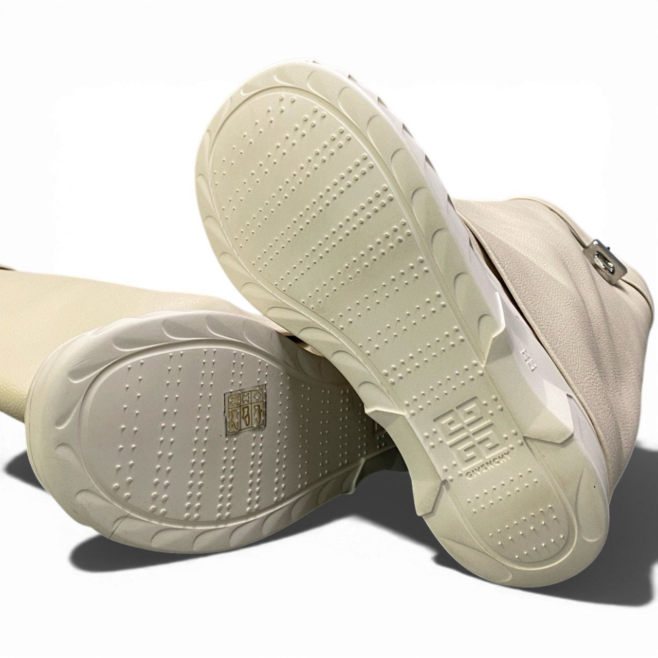 アイボリーベージュ系の上品なカラーが印象的なジバンシー シャークロックブーツです。 シボ感のあるマットなレザー素材で、高級感と柔らかさを兼ね備えています。 履き口にはアイコニックなメタルロック金具が配され、モードなアクセントに。 ボリュームソールとロング丈デザインが存在感を放ち、コーディネートの主役になる一足です。