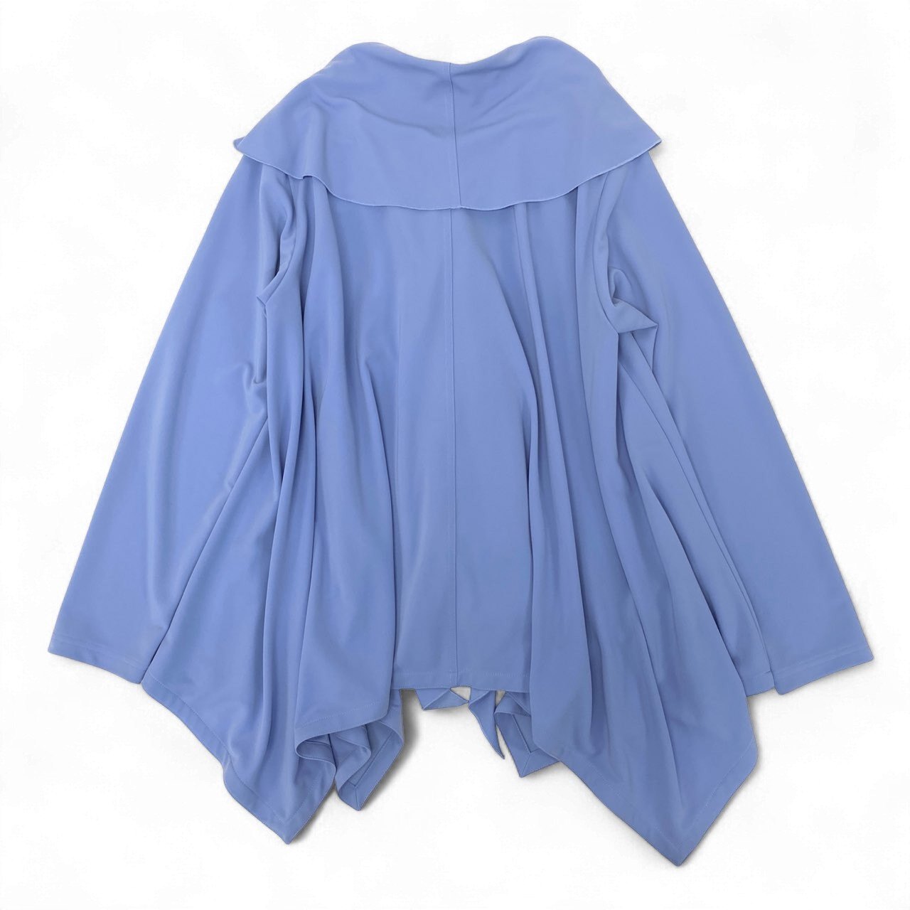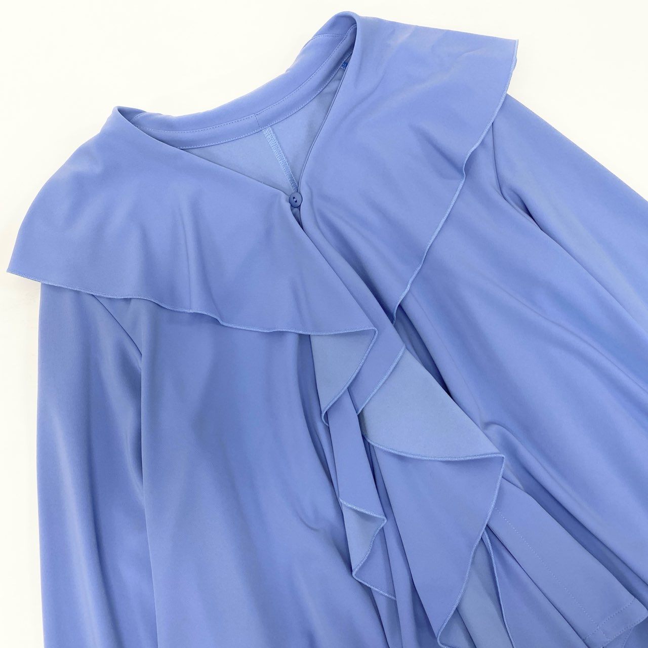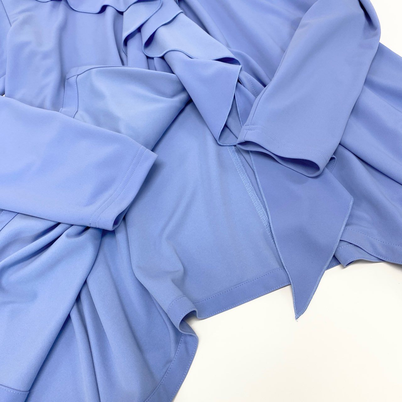 淡い「ペールスカイブルー」が美しい、TOKUKO 1er VOL のフリルカーディガンです。マットで柔らかな落ち感のある素材を使用し、前身頃に流れるような立体フリルが華やかなアクセントになっています。裾はアシンメトリーのドレープシルエットで、動くたびに揺れるエレガントなデザインが魅力。軽い羽織りとして長いシーズン活躍し、ワンピースやシンプルなパンツスタイルのアクセントにもおすすめです。上品でありながら普段使いしやすい一着です。
