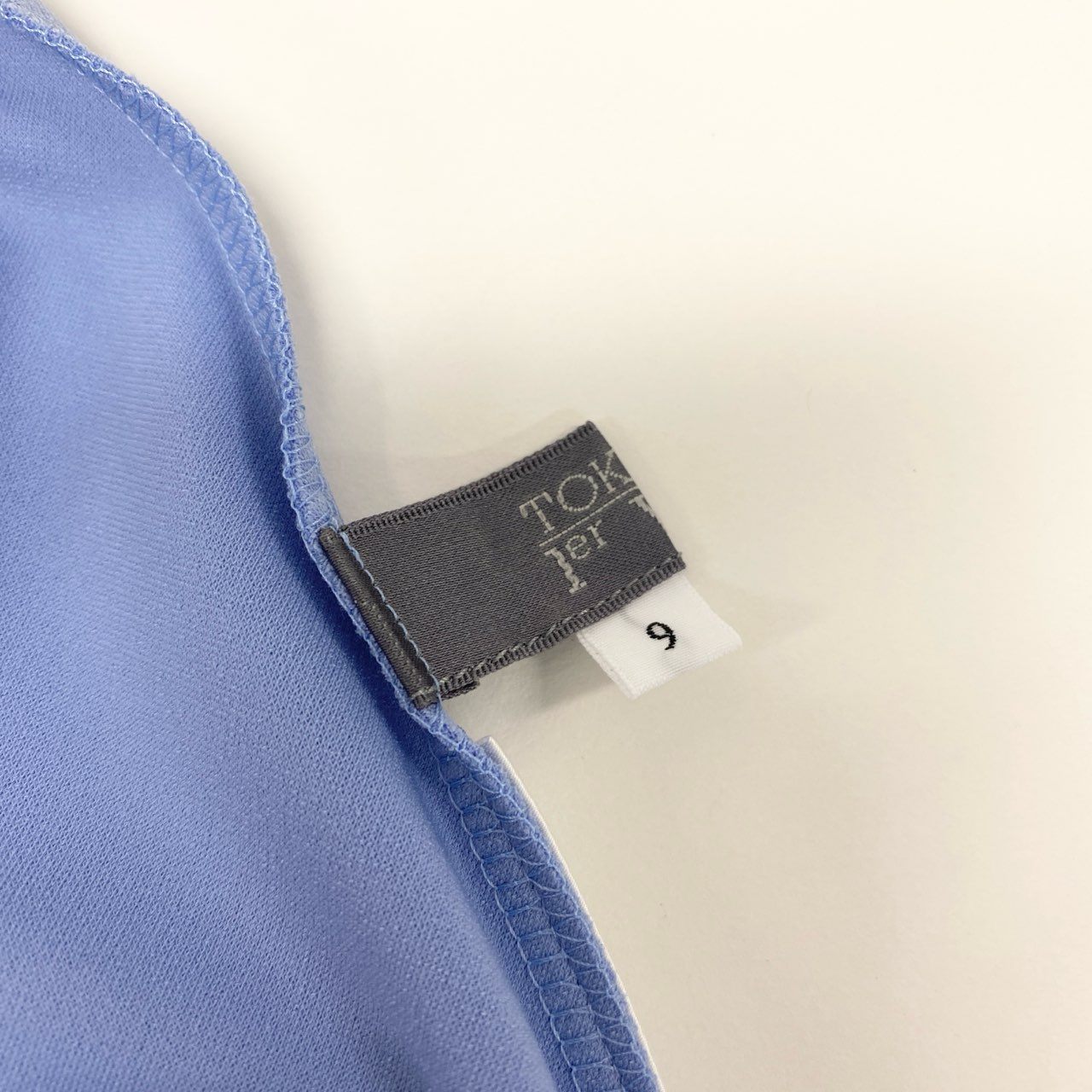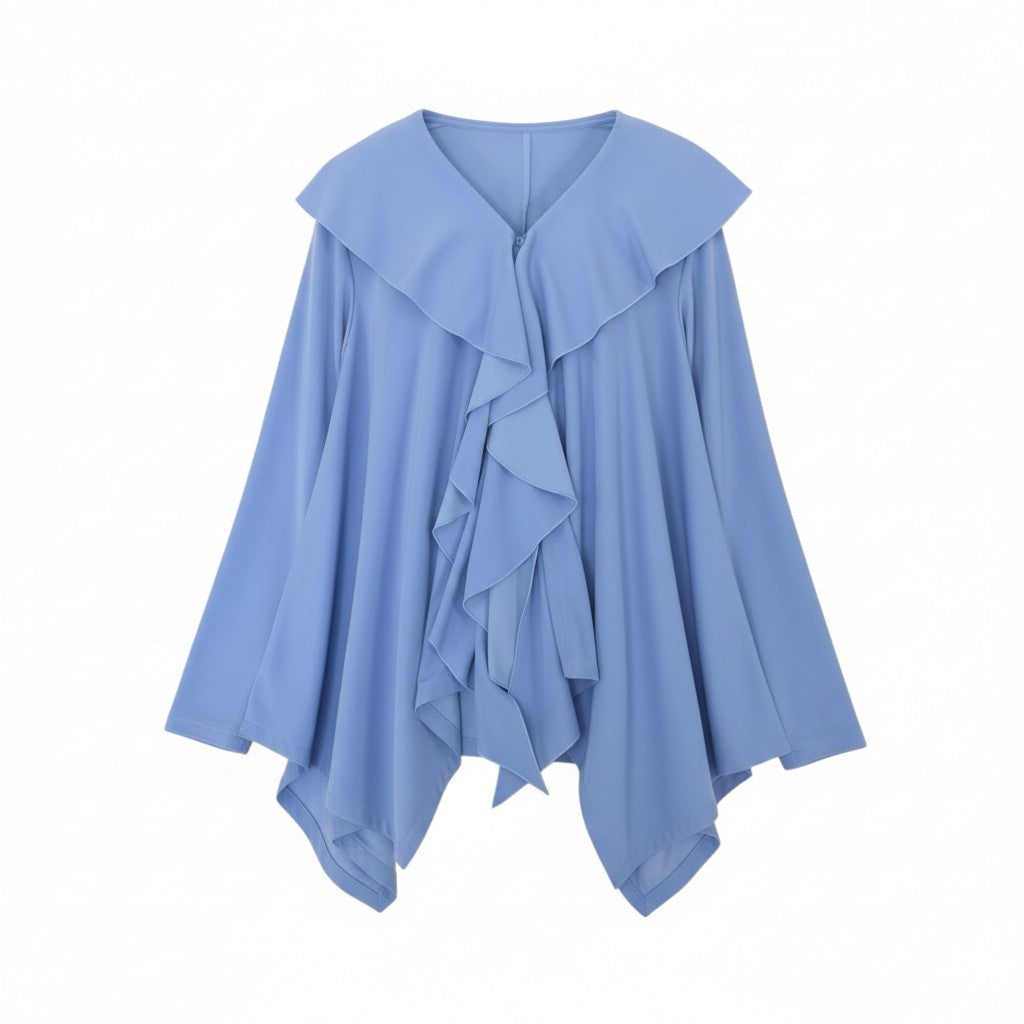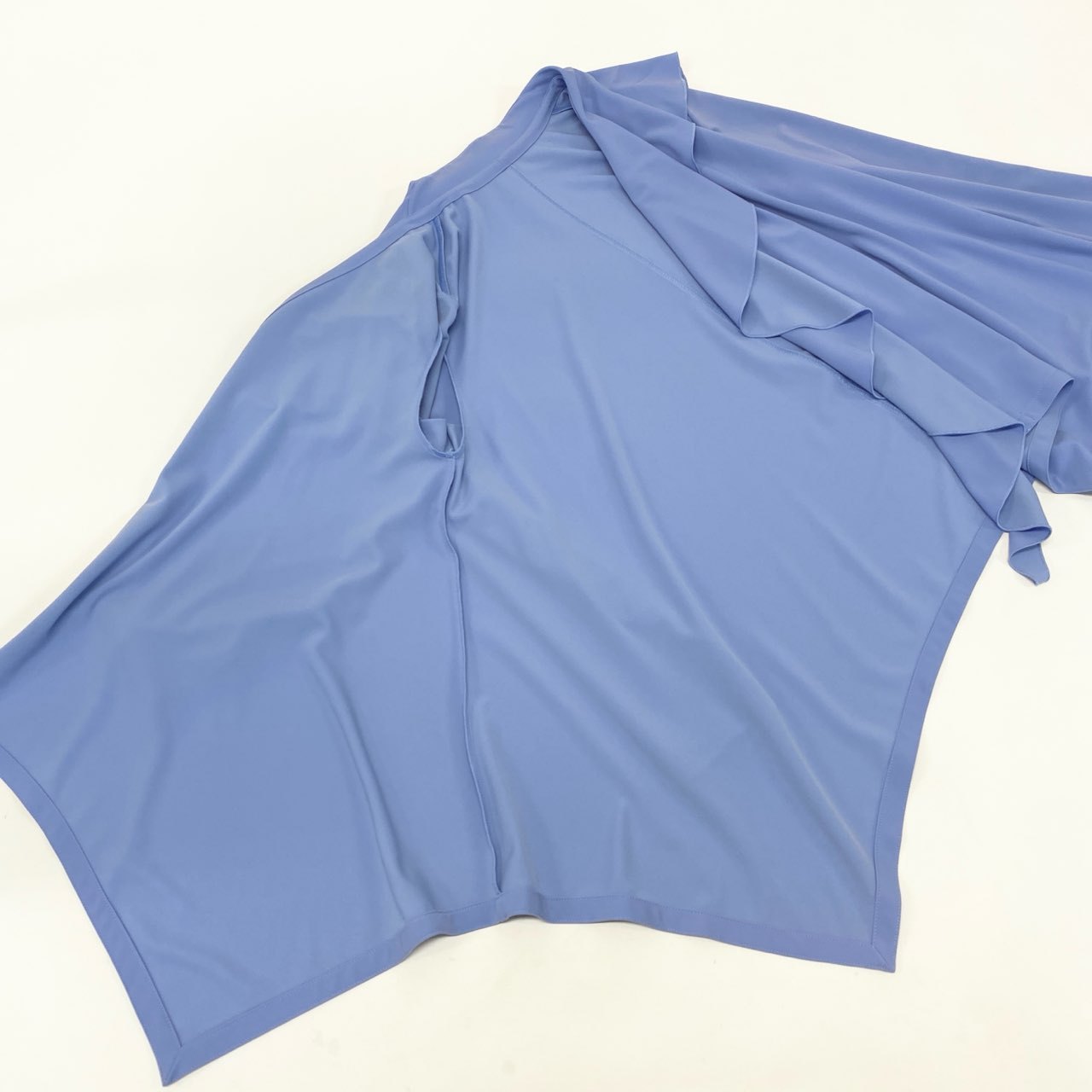 淡い「ペールスカイブルー」が美しい、TOKUKO 1er VOL のフリルカーディガンです。マットで柔らかな落ち感のある素材を使用し、前身頃に流れるような立体フリルが華やかなアクセントになっています。裾はアシンメトリーのドレープシルエットで、動くたびに揺れるエレガントなデザインが魅力。軽い羽織りとして長いシーズン活躍し、ワンピースやシンプルなパンツスタイルのアクセントにもおすすめです。上品でありながら普段使いしやすい一着です。