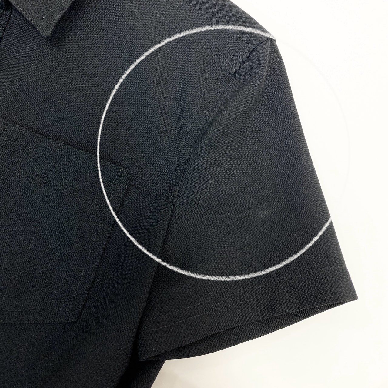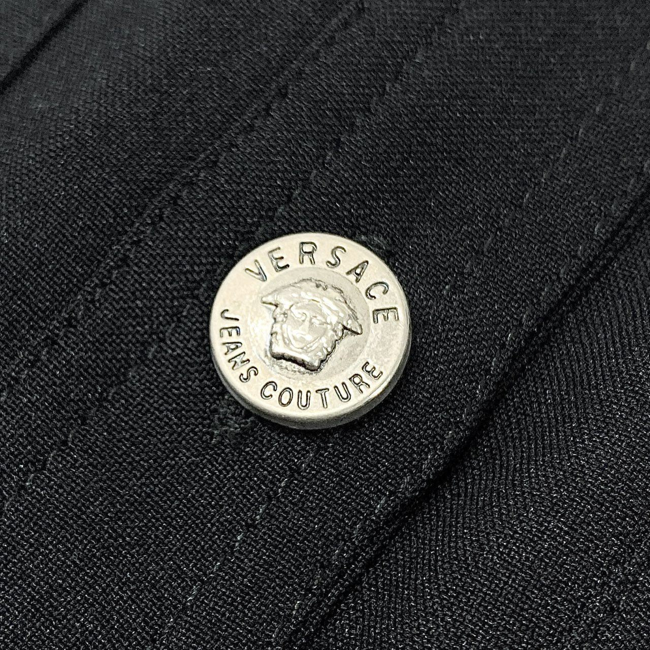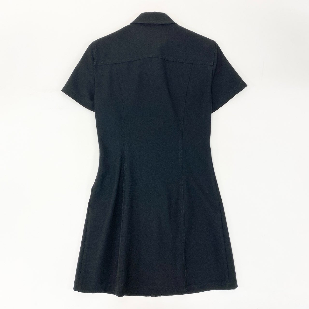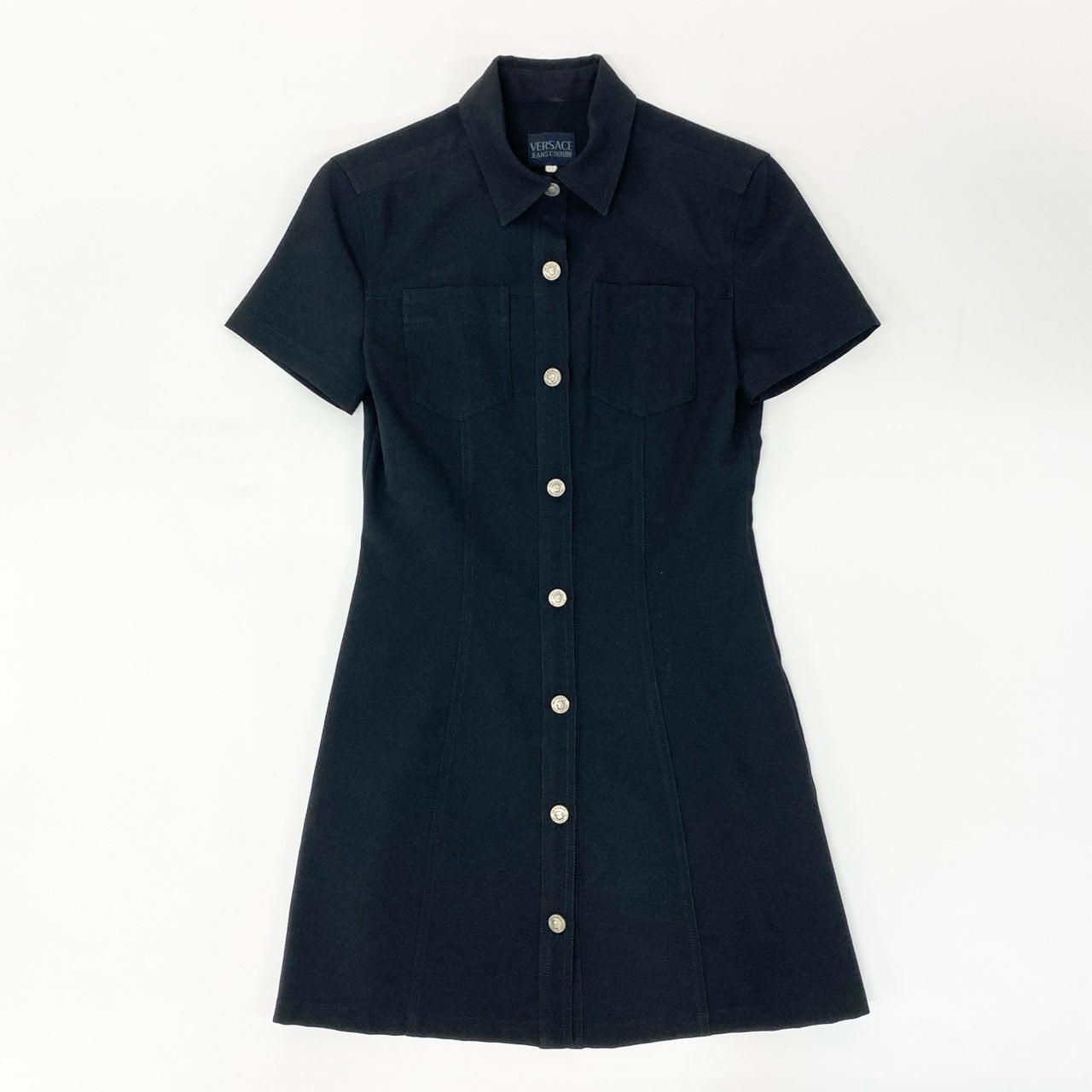 VERSACE(ヴェルサーチ)の半袖ワンピース。深みのあるブラックの生地に、ブランドを象徴するメデューサモチーフのメタルボタンが並ぶクラシックなデザインです。マットな質感のコットン素材が上品で、シルエットを引き締めながらも女性らしい印象を演出。ジャケットやヒールを合わせればフォーマルにも、ブーツやアクセサリーでモードにも着こなせる万能な一着です。