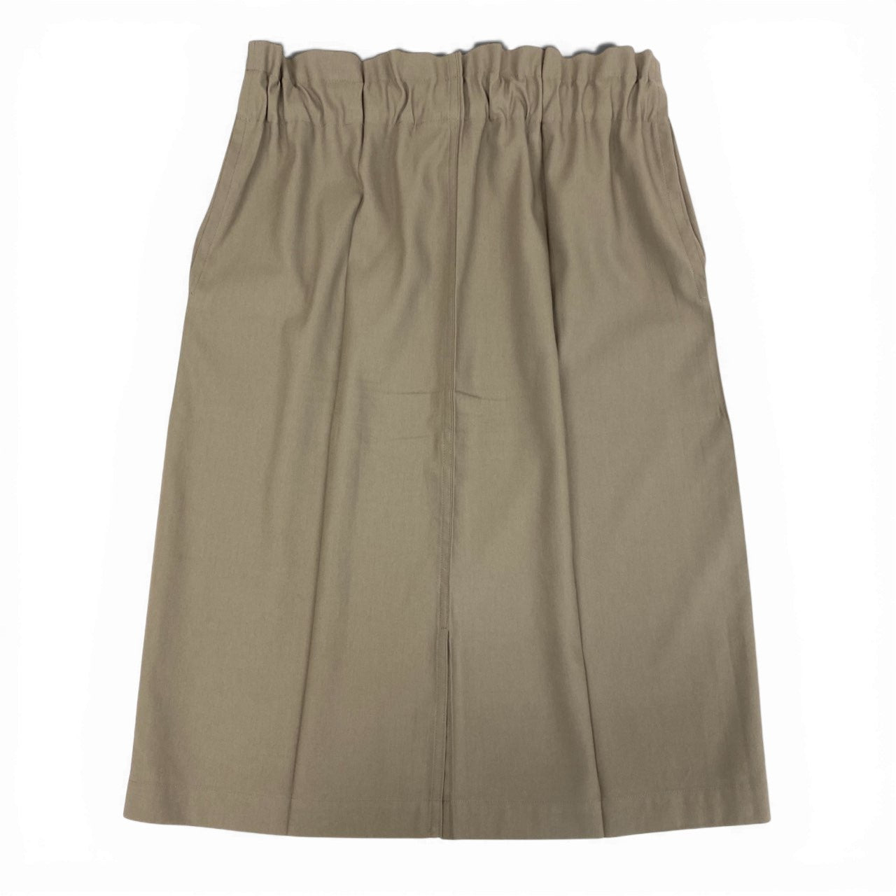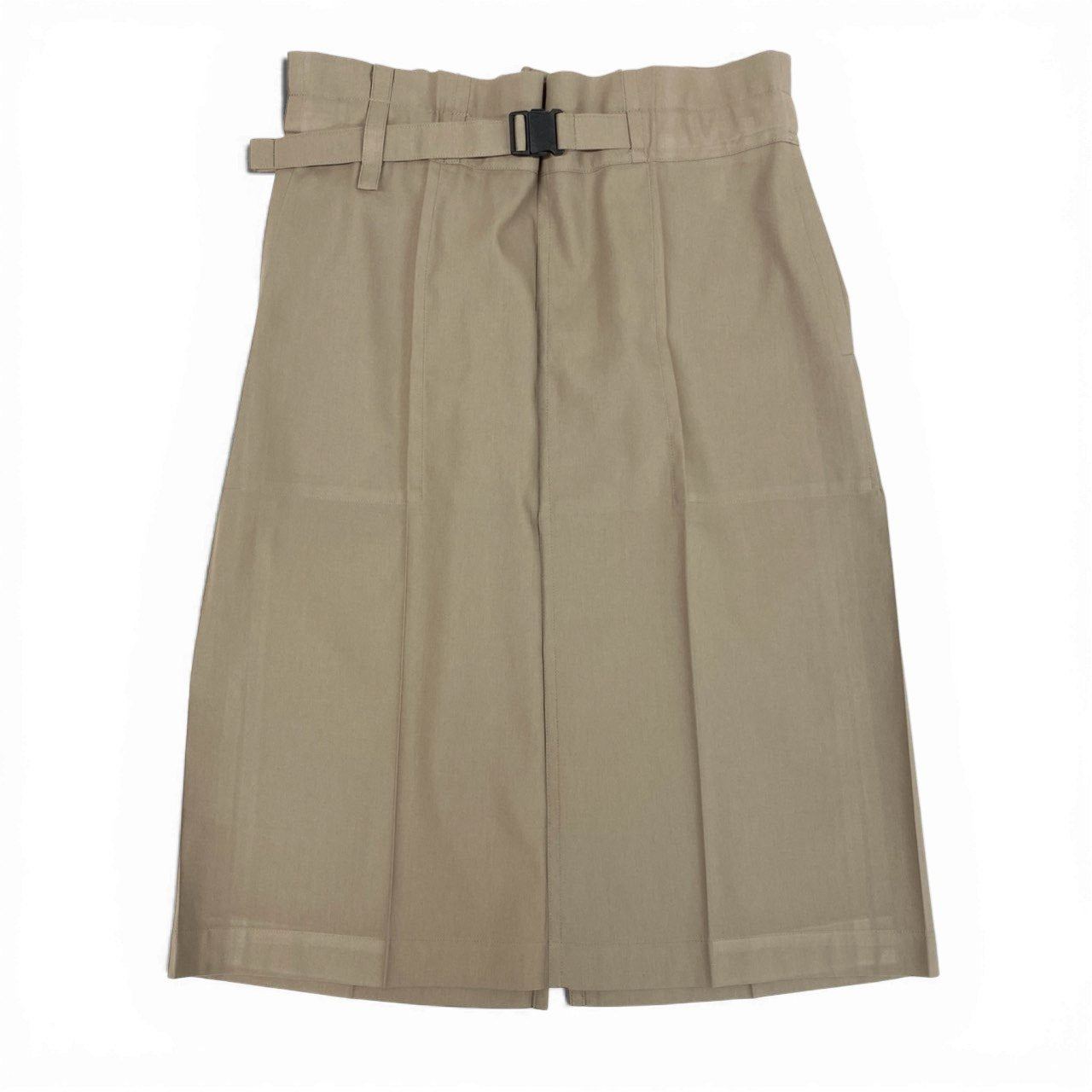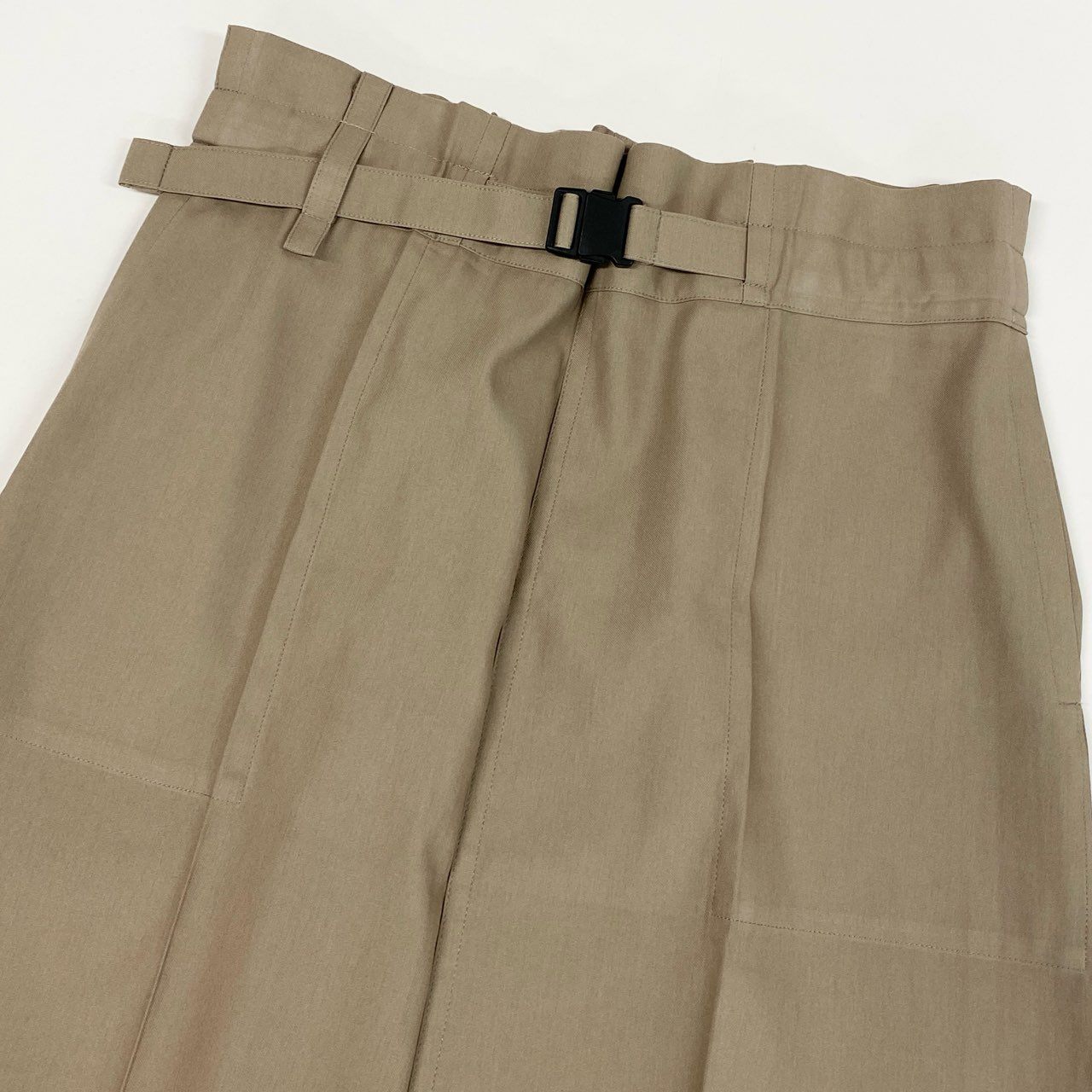 落ち着いたベージュカラーが上品な印象のme ISSEY MIYAKEのスカートです。マットなコットン系の軽やかな素材感で、ナチュラルで洗練された雰囲気があります。ウエストにはバックル付きベルトデザインが施され、シンプルな中にもアクセントを加えたデザインが特徴です。シャツやニットを合わせた大人のカジュアルスタイルやモードコーデに活躍する一着です。