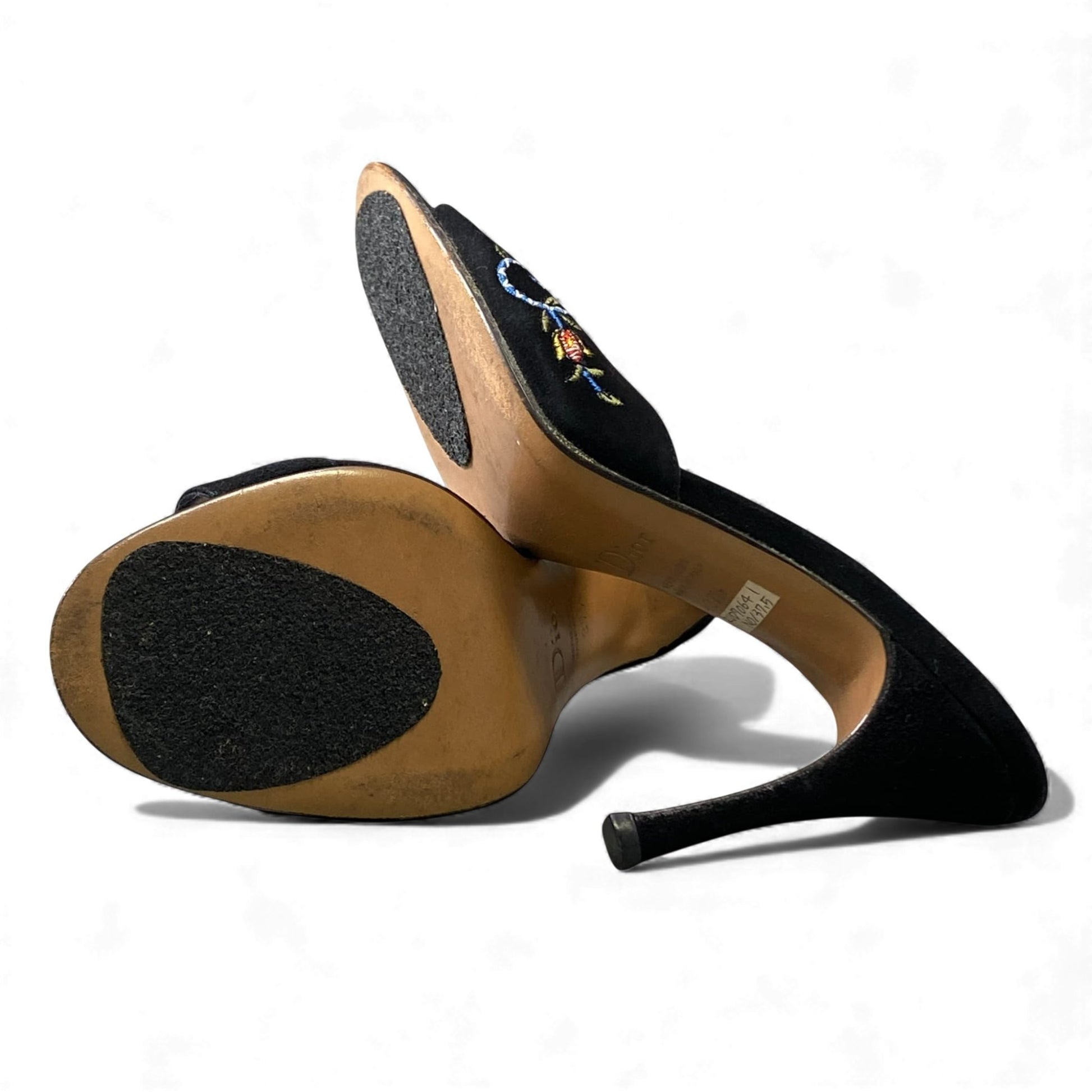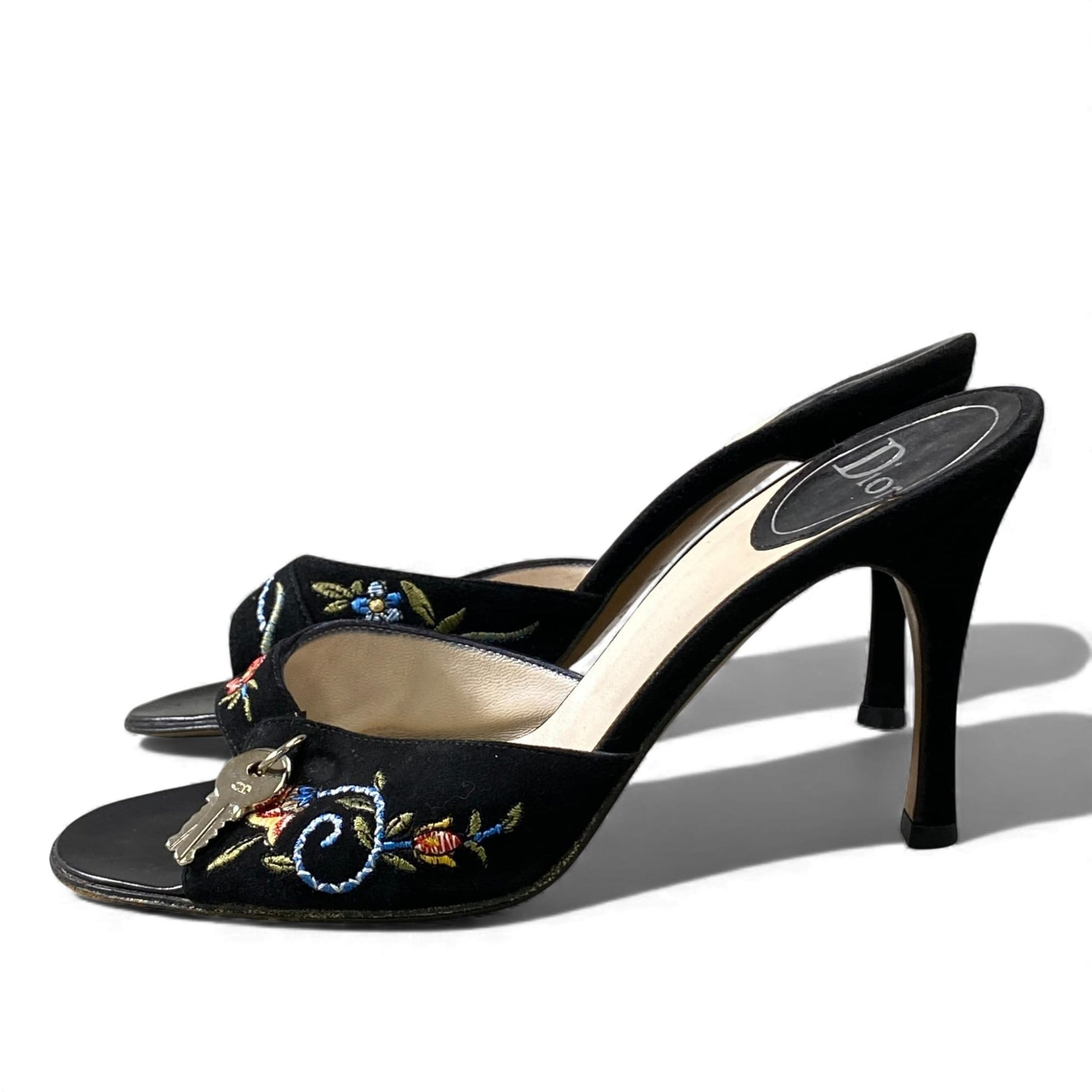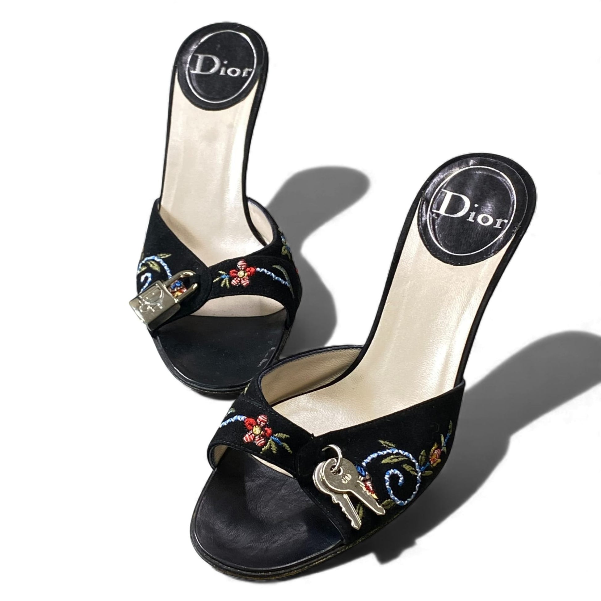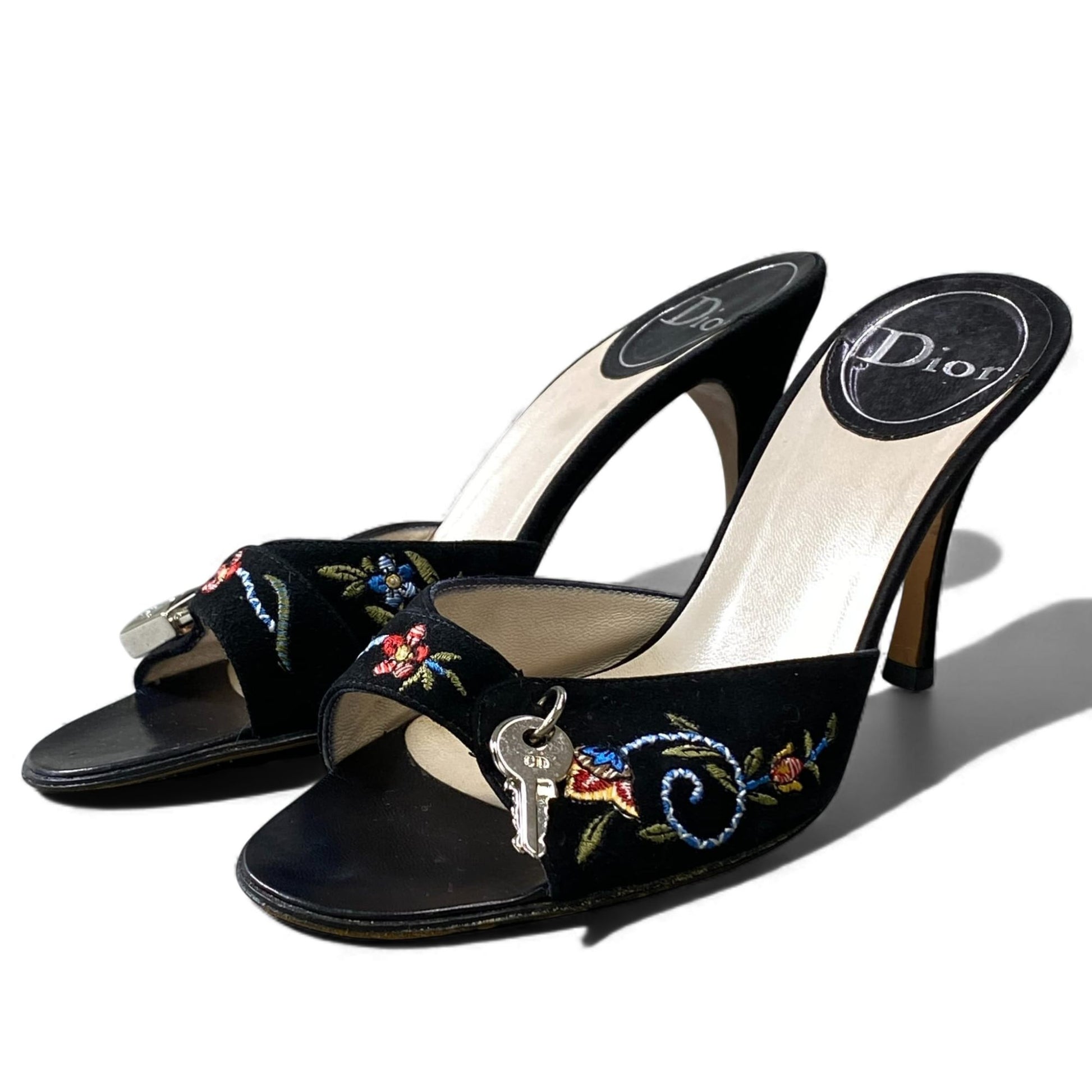 1L11 Christian Dior クリスチャンディオール 刺繍 キーチャーム付き サンダル サイズ37 1/2 ブラック スウェード レディース 女性用 靴k02i