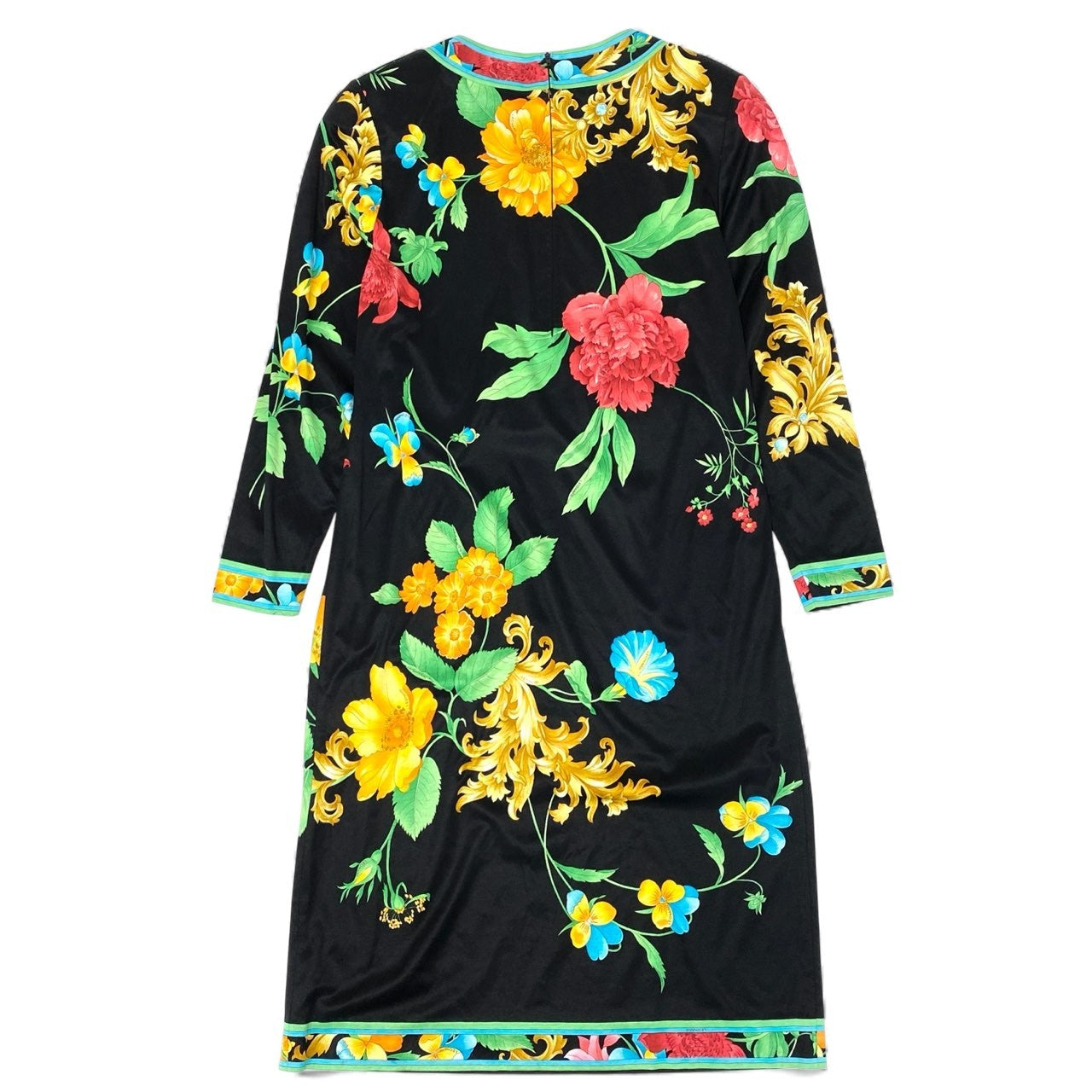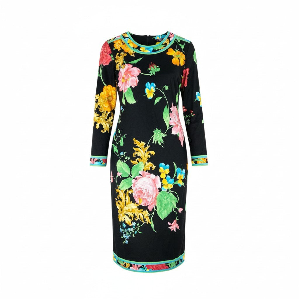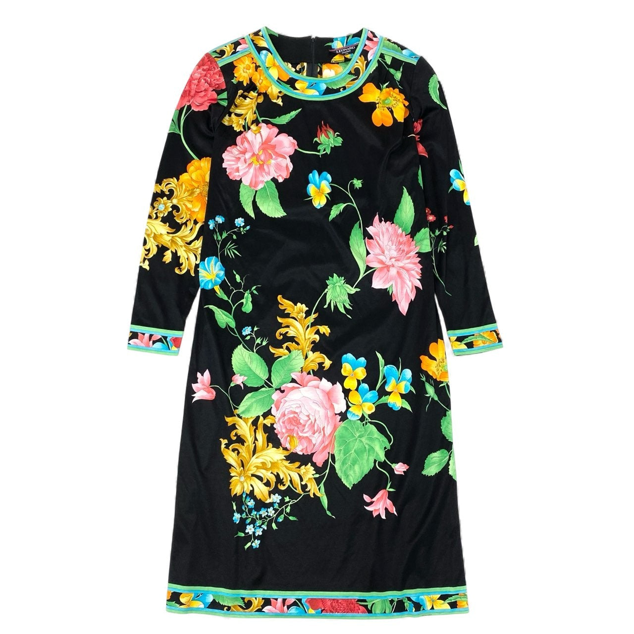 色は深みのあるブラックをベースに、ピンク・イエロー・ブルー・グリーンの鮮やかなフラワープリントが映えるレオナールらしい華やかなワンピースです。 滑らかなコットン生地で着心地が良く、長袖デザインのため季節を問わず活躍します。 襟ぐり・袖口・裾に施されたカラーフレームのような縁取りがアクセントとなり、ボディラインを美しく見せる効果があります。 一枚で華やかに決まるため、お食事会・フォーマルシーン・旅行のディナーなど幅広く使える便利なアイテムです。