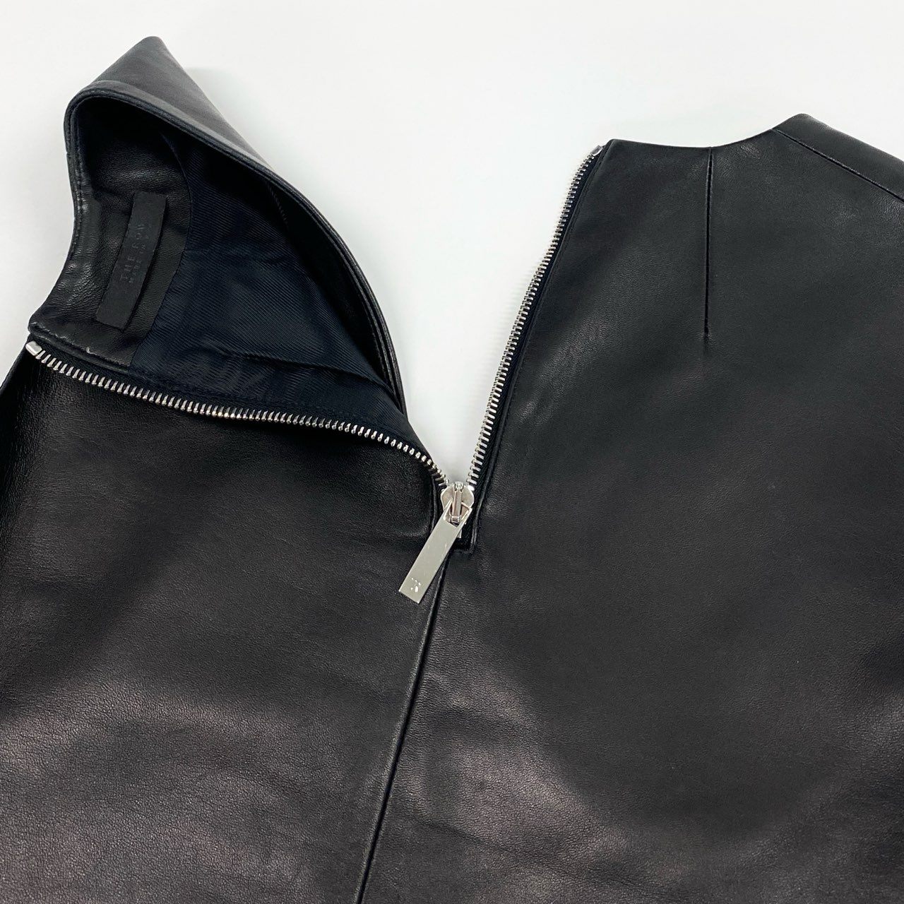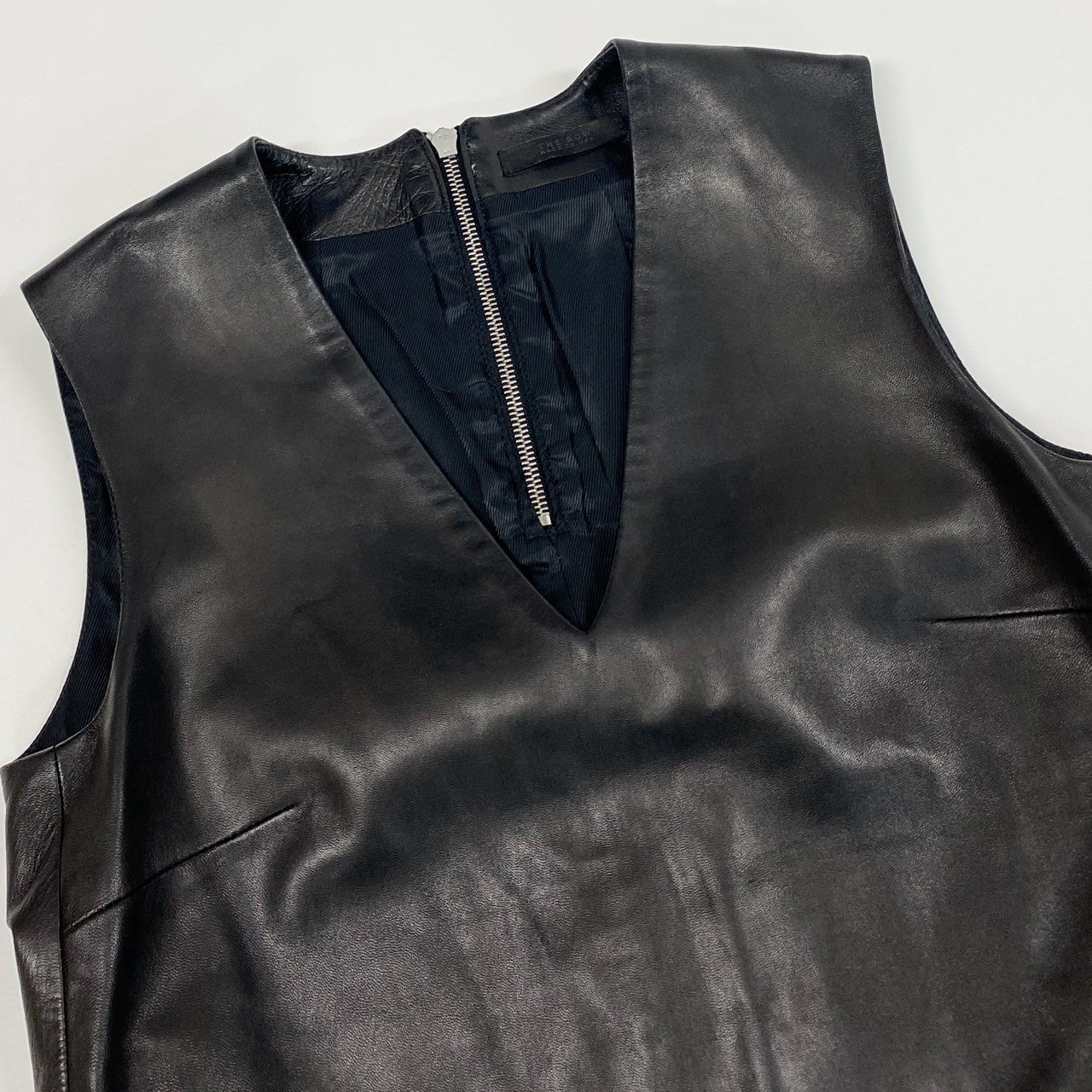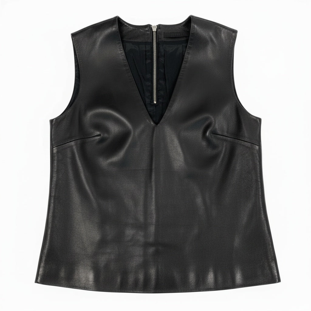 THE ROWらしいミニマルな美しさが際立つ、Vネックデザインのレザーベストです。カラーはマットブラックで、しなやかで上質なラムレザーならではの自然な艶感が魅力です。フロントのVネックラインとバックファスナーディテールが、洗練されたモード感を演出します。シャツやニットとのレイヤードはもちろん、ジャケットのインナーとしても映える一着で、都会的なスタイリングに幅広く活躍します。