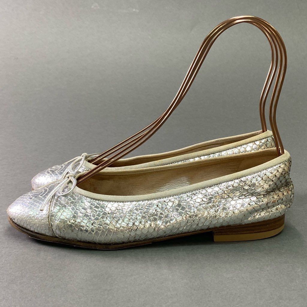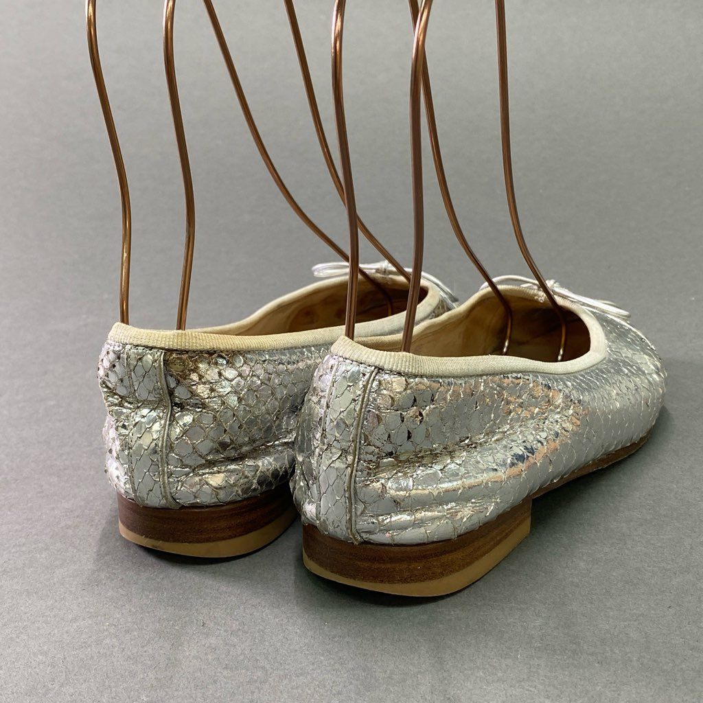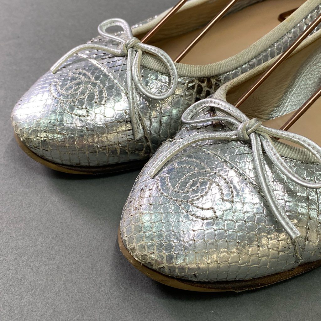 5e10 CHANEL シャネル メタリック バレエシューズ 36 1/2 シルバー レザー パイソン風 リボン フラットシューズ