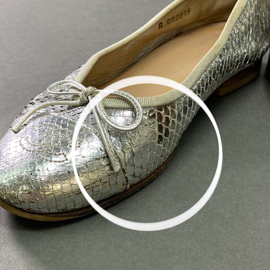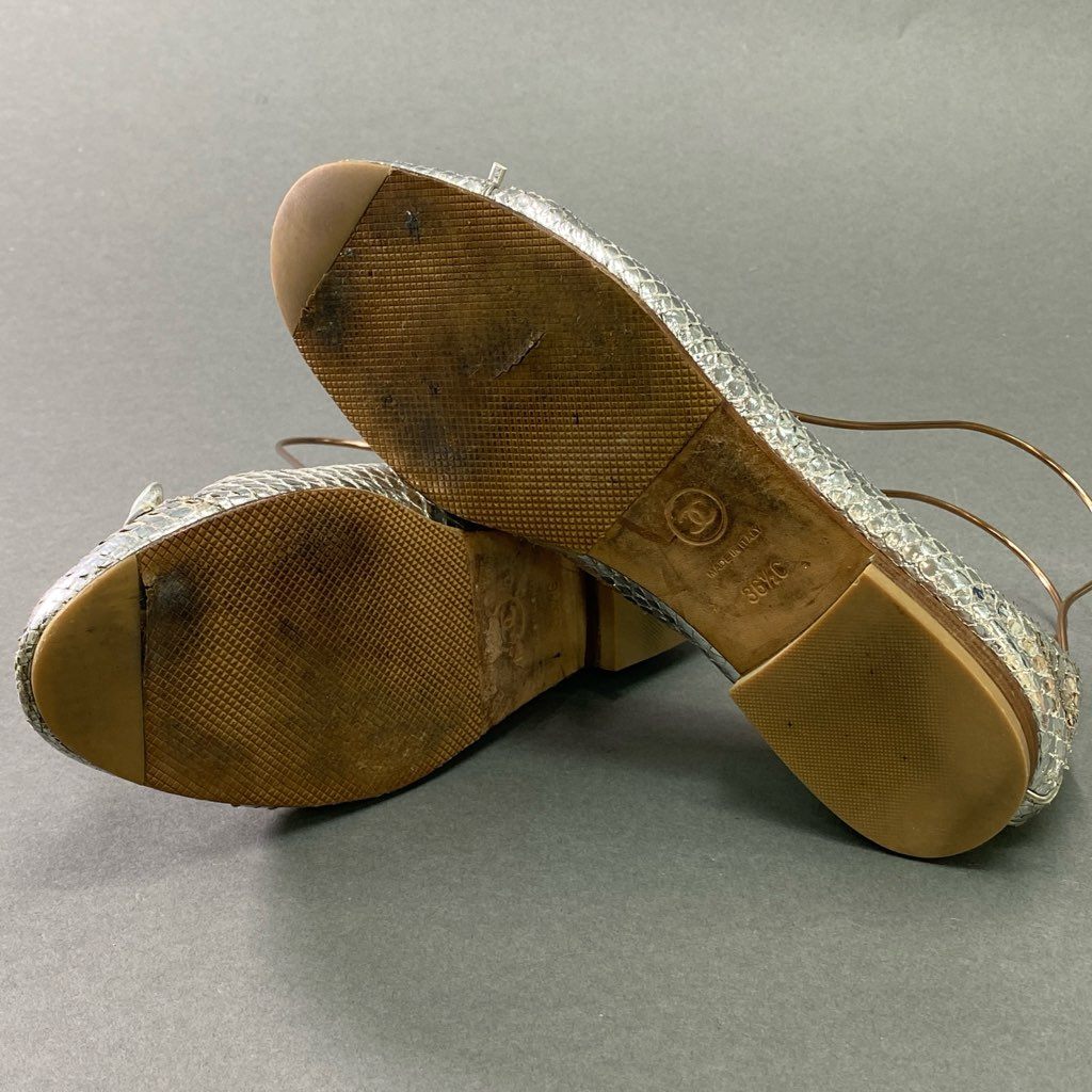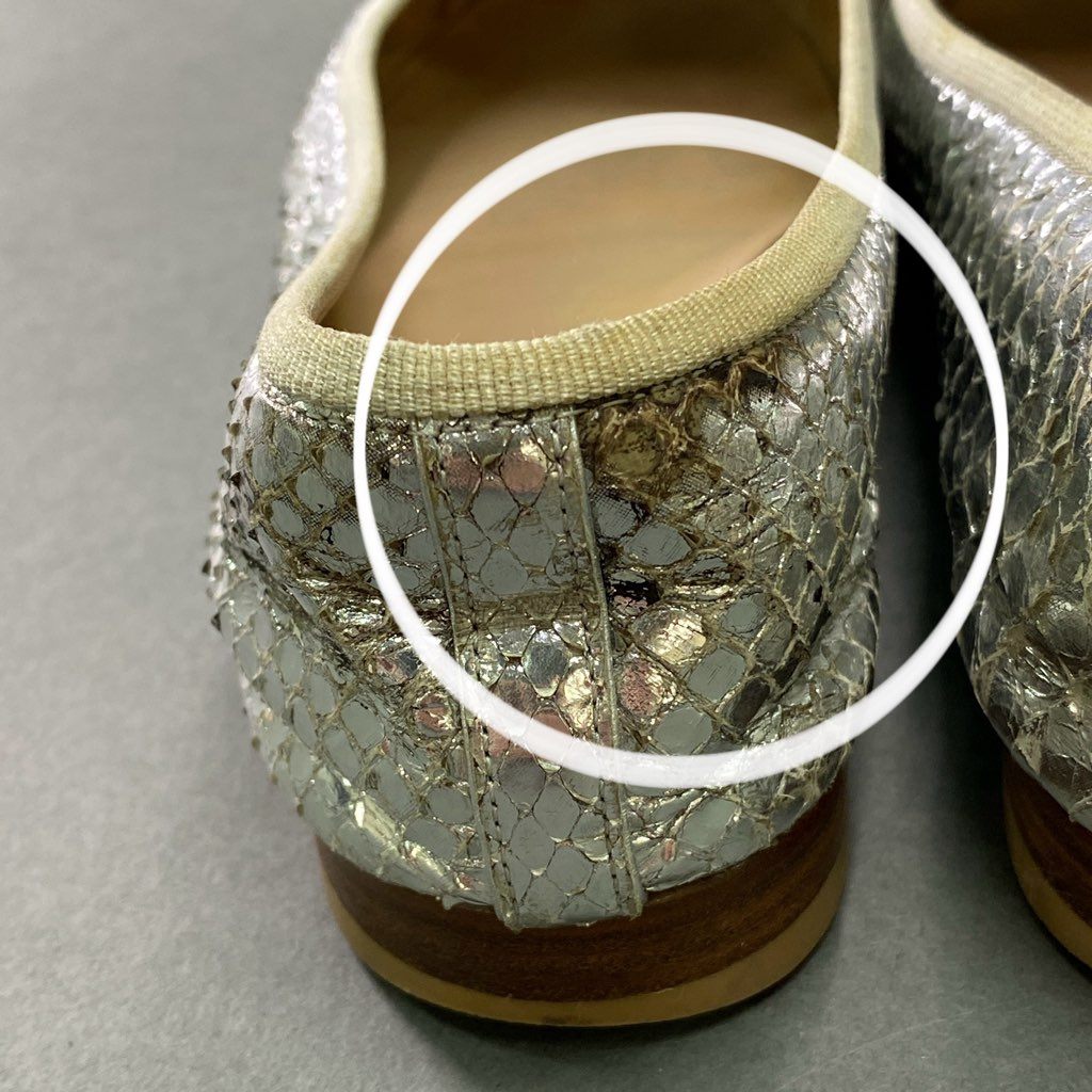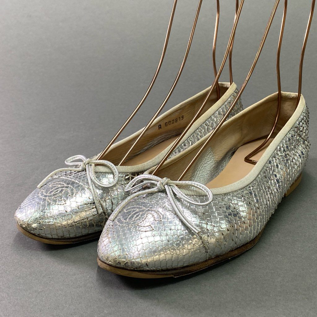 5e10 CHANEL シャネル メタリック バレエシューズ 36 1/2 シルバー レザー パイソン風 リボン フラットシューズ