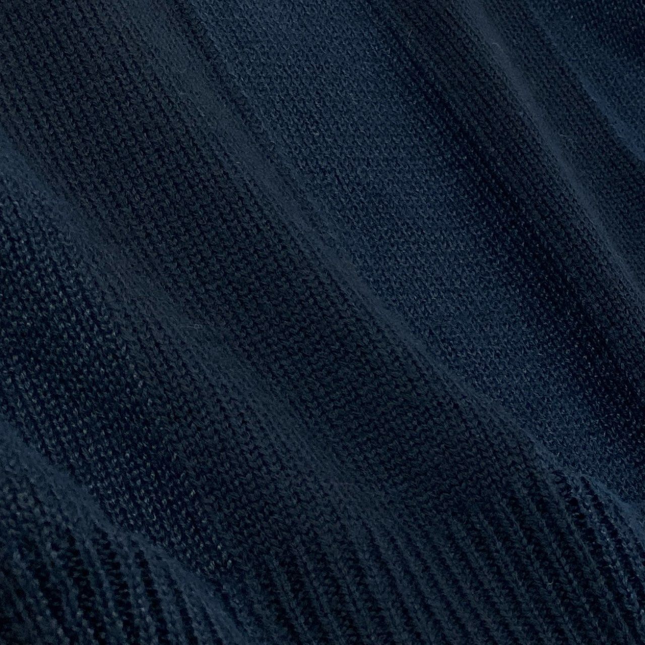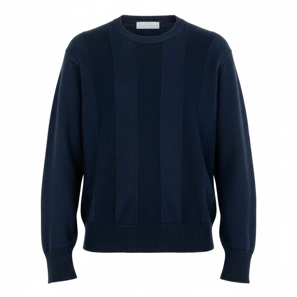 深みのあるミッドナイトネイビーを基調とした、落ち着きのあるサマーニットセーターです。無地ベースながら、フロントには縦ストライプ調の編み地切り替えが施され、さりげない立体感を演出しています。マットで通気性の良いコットンニット素材が、軽やかな着心地を実現。スラックスからデニムまで幅広く合わせやすく、きれいめカジュアルに最適な一着です。