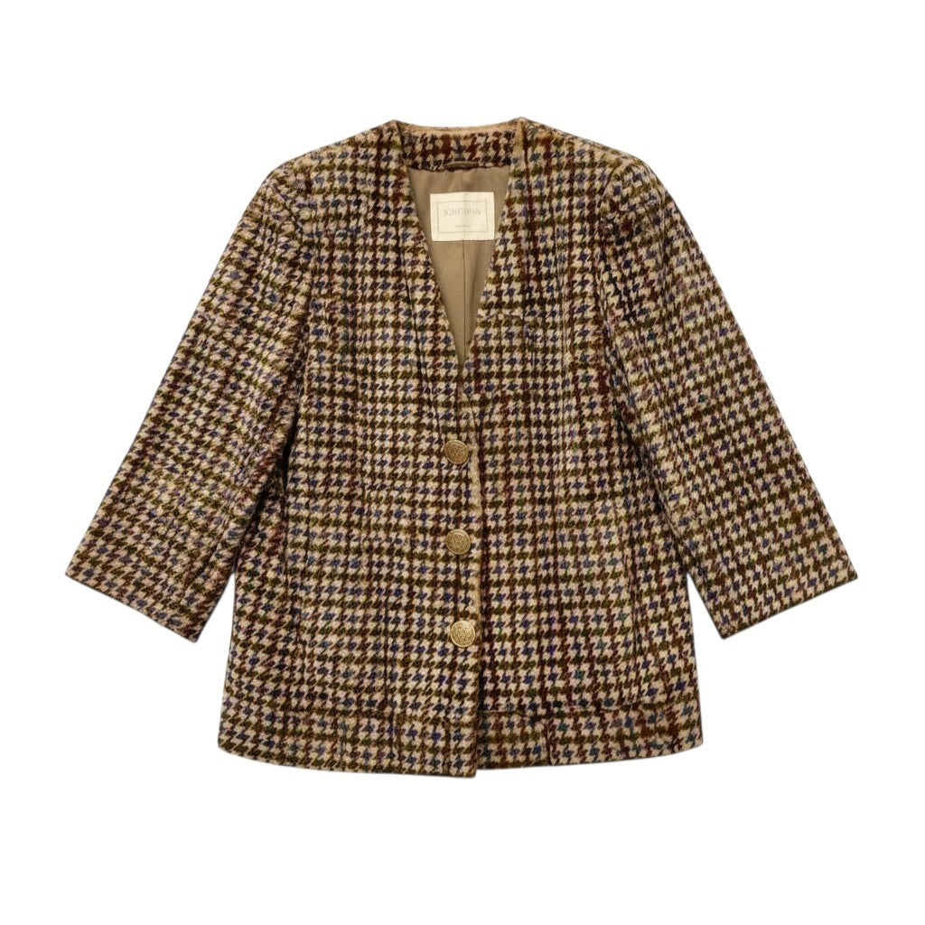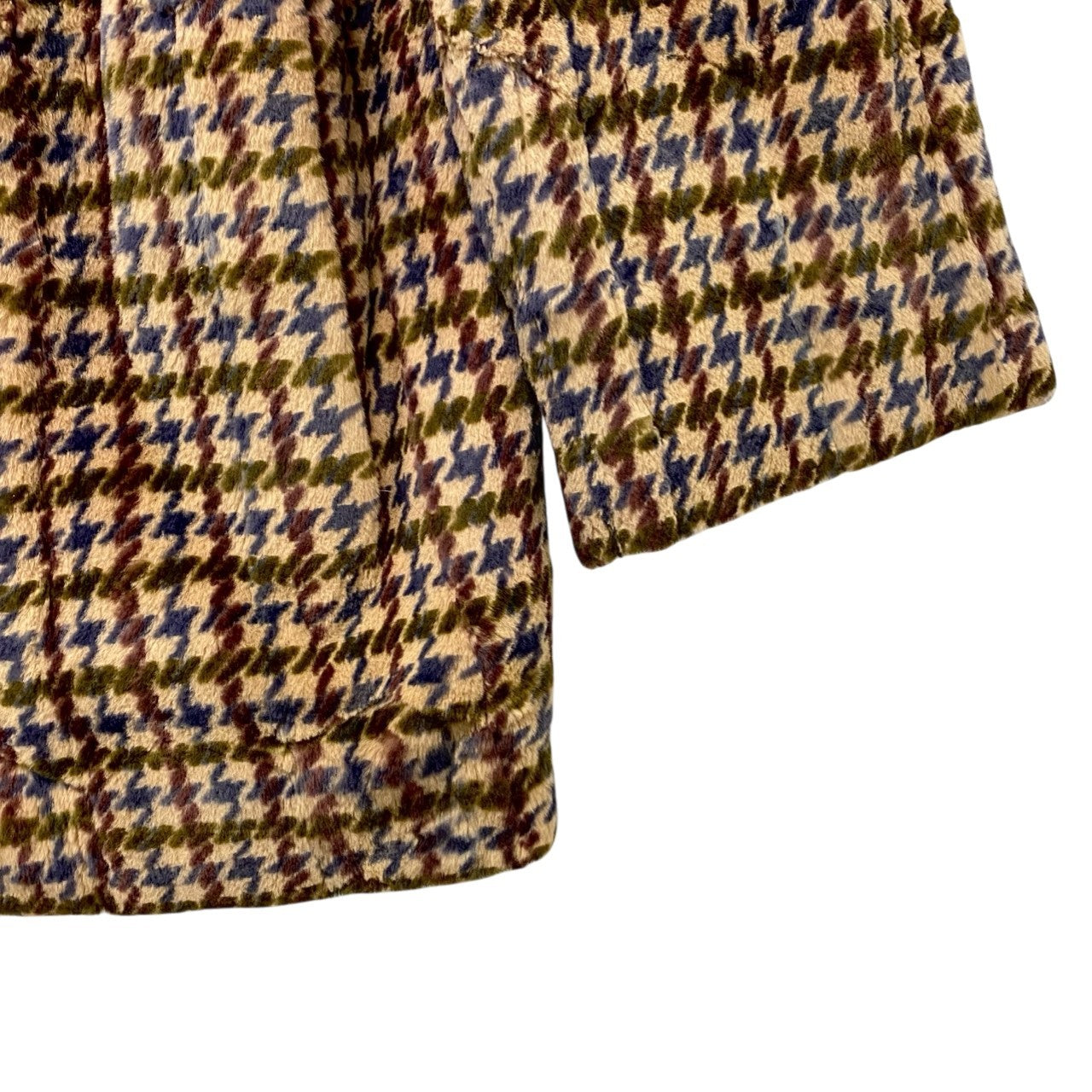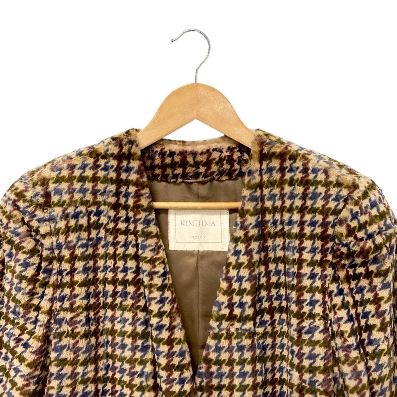 KIMIJIMA の上品な千鳥チェック柄コートです。ブラウン系を基調とした千鳥格子(ハウンドトゥース)柄がクラシックな印象を演出し、ゴールド調のメタルボタンがアクセントになっています。素材には柔らかな風合いの**シェアードファー(本毛皮)**を使用し、滑らかで高級感のある質感が魅力です。ノーカラーデザインで首元がすっきりしており、ワンピースやタートルニットと合わせたエレガントなコーディネートにおすすめの一着です。